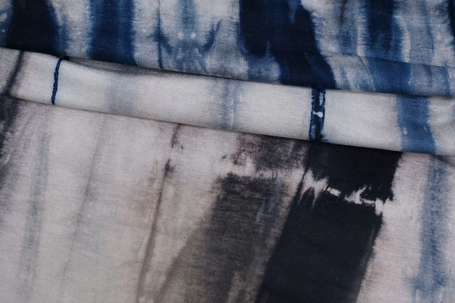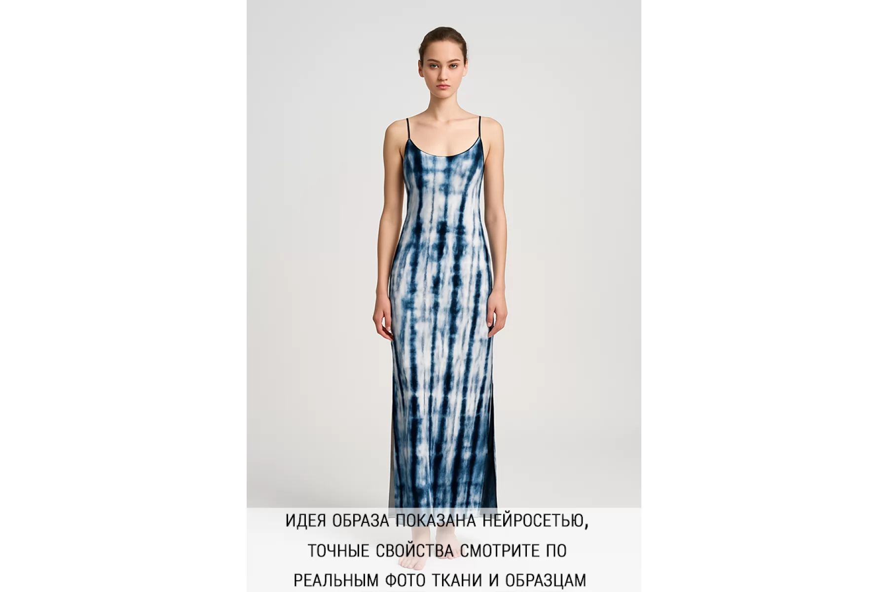 Трикотаж из вискозы, по плетению кулирная гладь. Узор красивый, под тай-дай, разводы тёмно-синего и сиренево-серого цвета. Тактильно очень приятный, мягкий, тонкий. Трикотаж умеренно просвечивает, пластичный, эластичный. Подойдет для пошива майки, футболки, топа, платья-футболки.