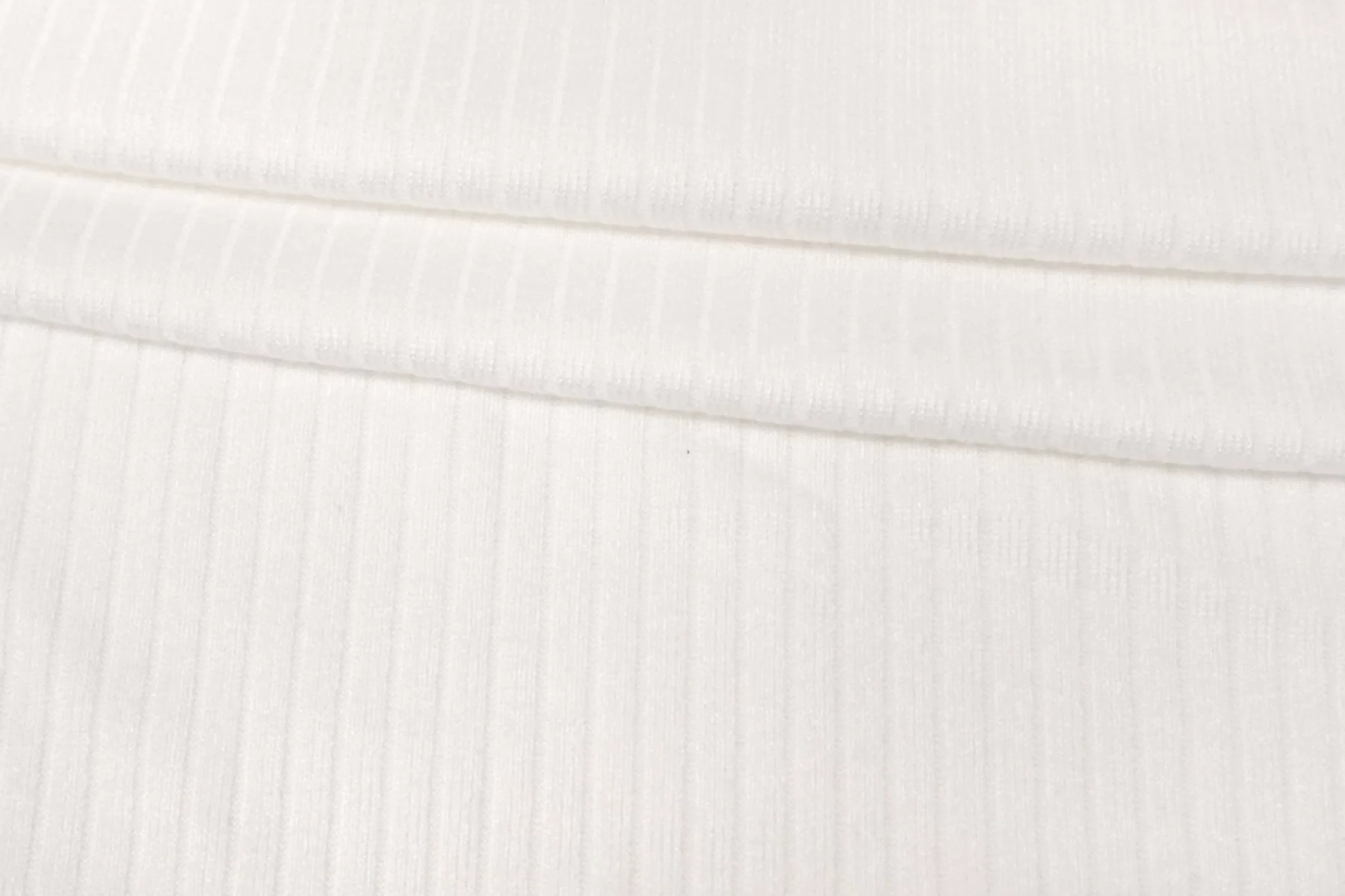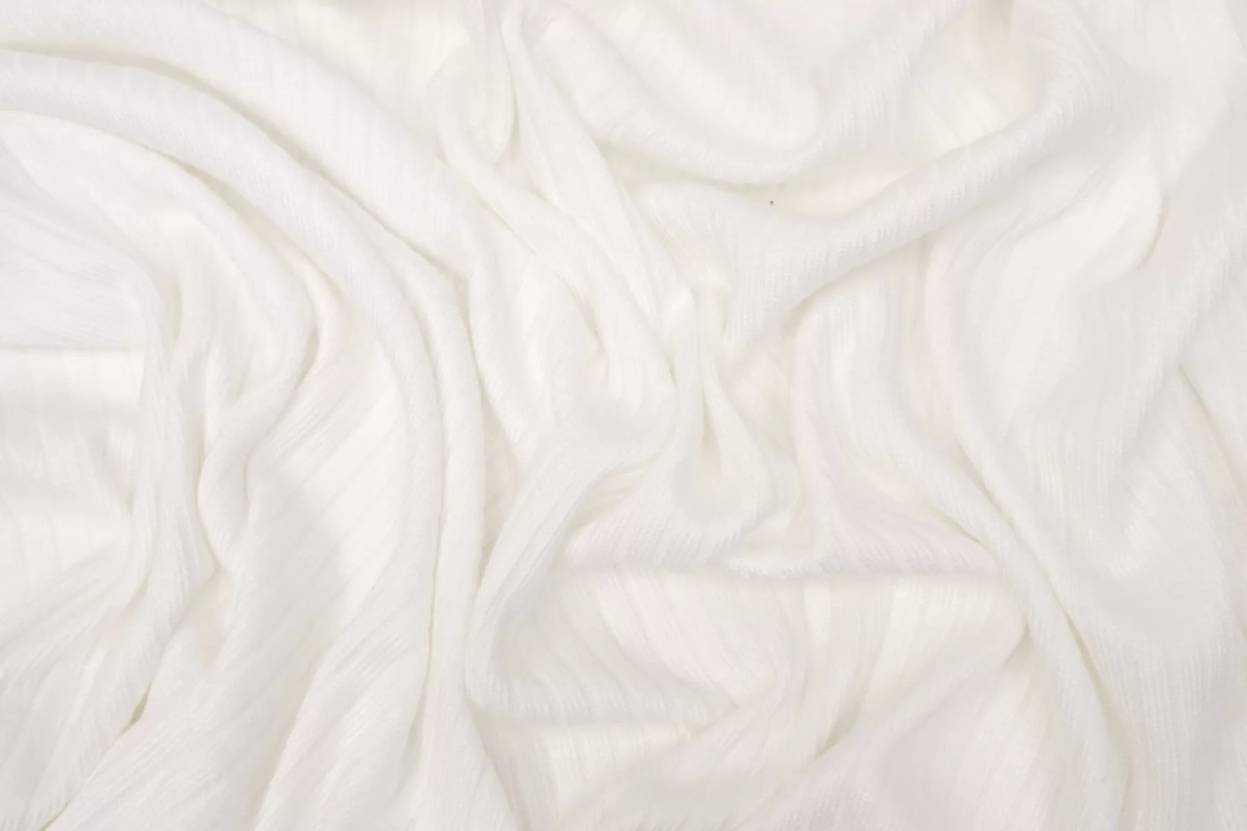 Трикотаж из вискозы лапша белого цвета с красивым легким блеском. Очень приятный к телу. Нежный и пластичный трикотаж, просвечивает при растяжении. Подойдет для пошива платья, свитера, кардигана, пуловера, водолазки, майки, костюма, юбки и т.д.