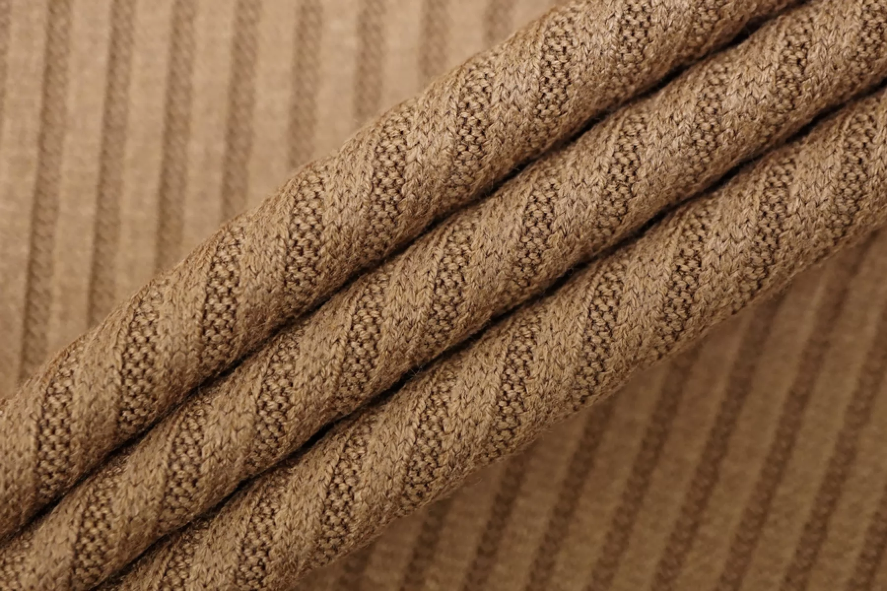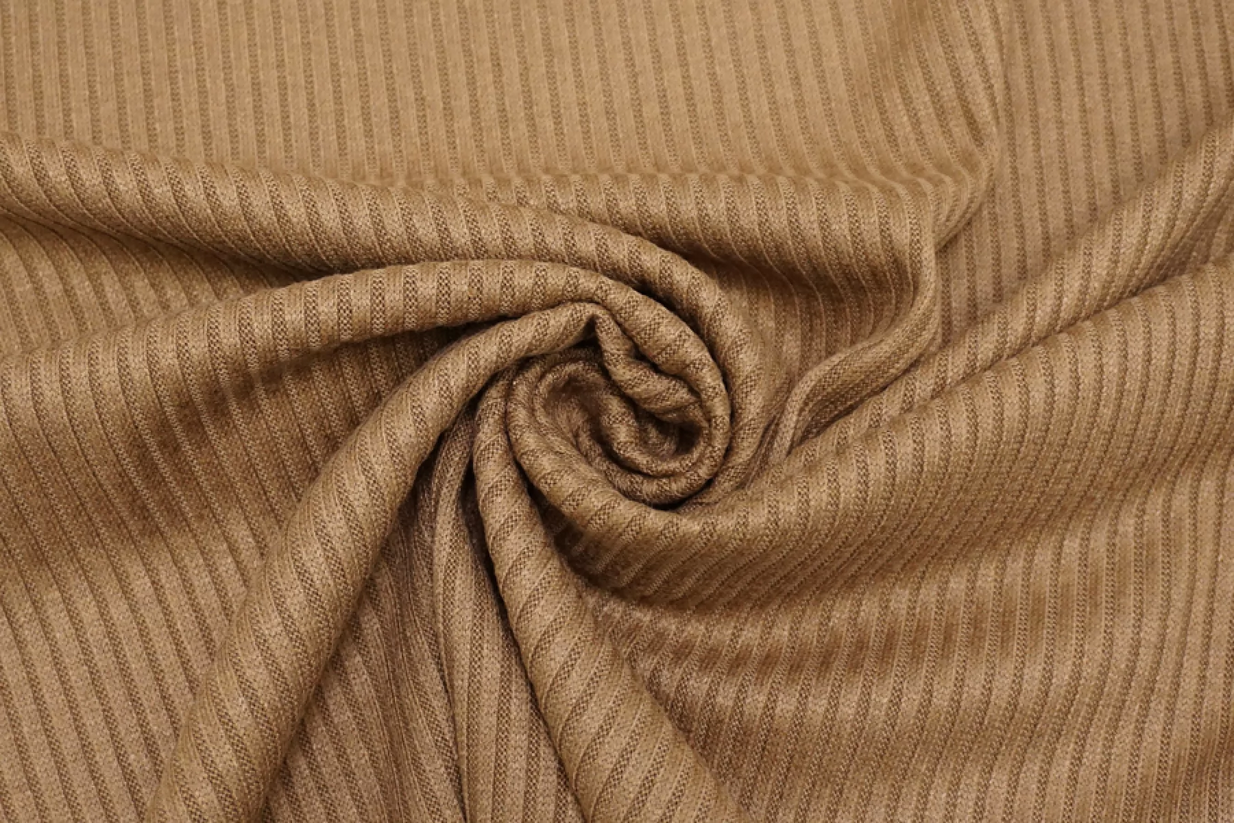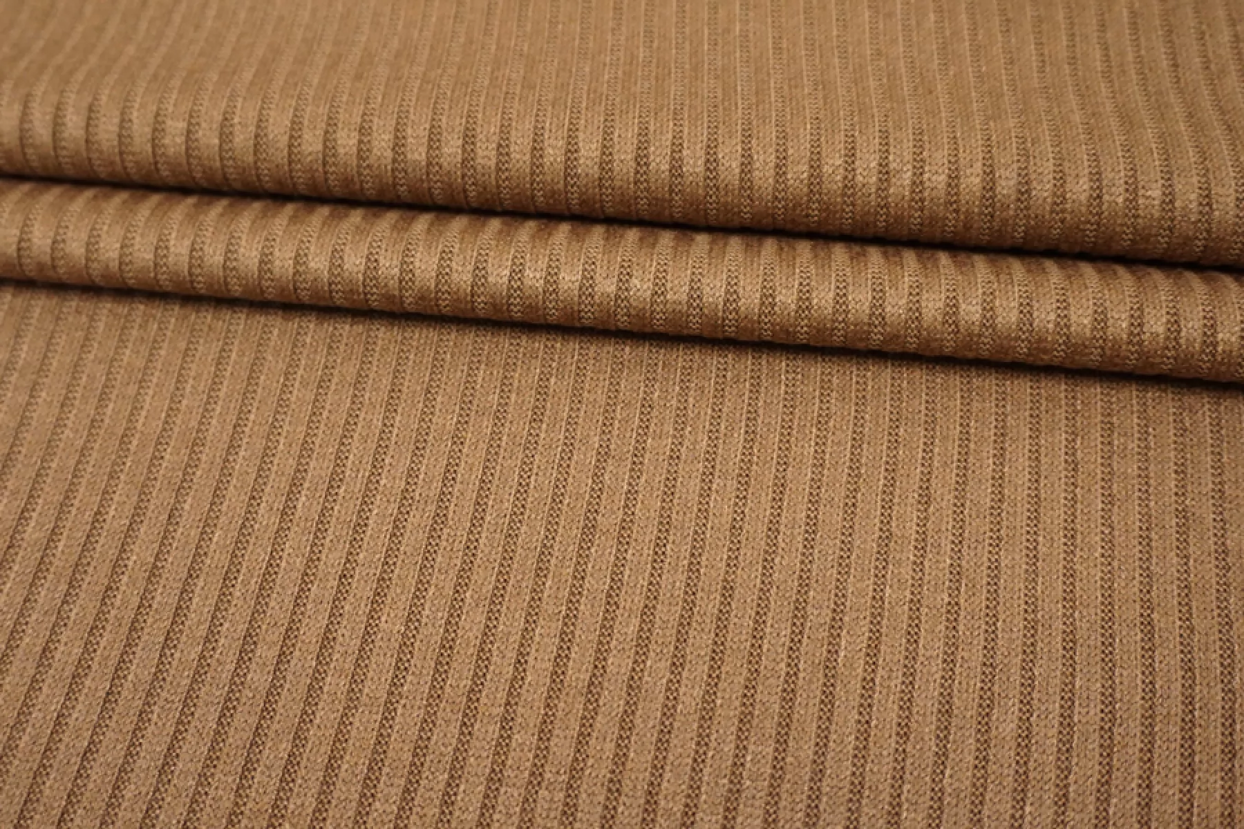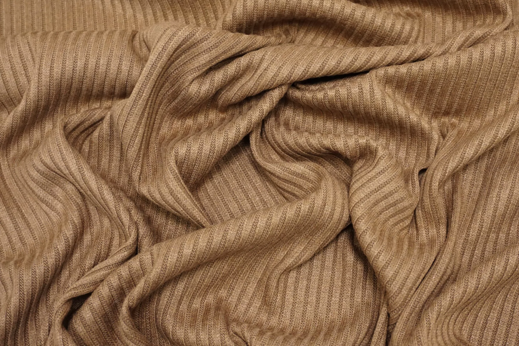 Трикотаж из вискозы, по вязке это лапша в оттенке кэмел (тёмно-бежевый). Очень приятный к телу. Нежный и пластичный трикотаж, просвечивает при растяжении. Подойдет для пошива платья, свитера, кардигана, пуловера, водолазки, майки, юбки и т.д.