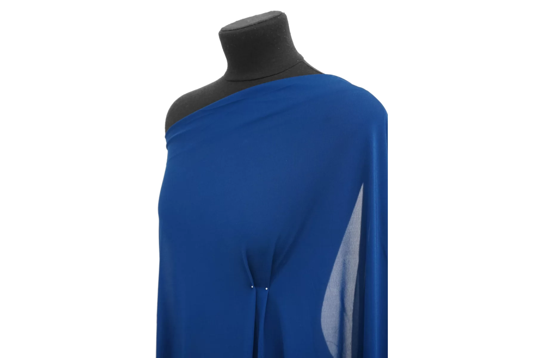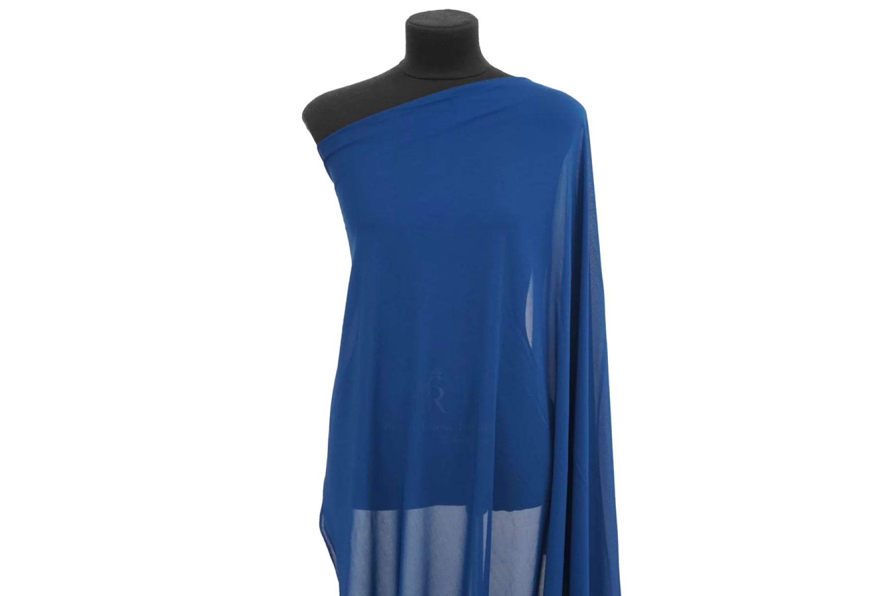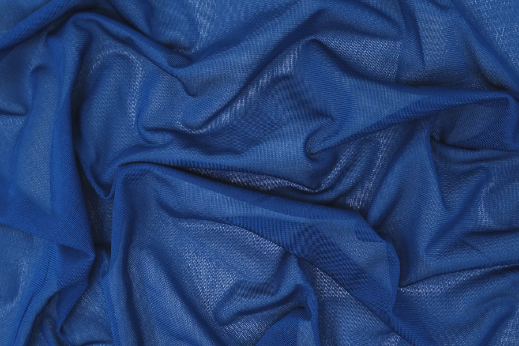 Тонкий вискозно-подкладочный трикотаж голубого оттенка. Материал легкий, мягкий и тонкий, полу-прозрачный, слегка шероховатый, на ощупь приятный. Красив в своей пластике. Хорошо тянется благодаря своему плетению и содержанию эластана. Просвечивает. Форму не держит. Красиво выглядит в драпировке. Можно использовать в качестве подкладки для тонких шифоновых изделий, для изделий из трикотажа, а также для изделий в бельевом стиле. Обязательно учитывайте возможную усадку на 5-10%