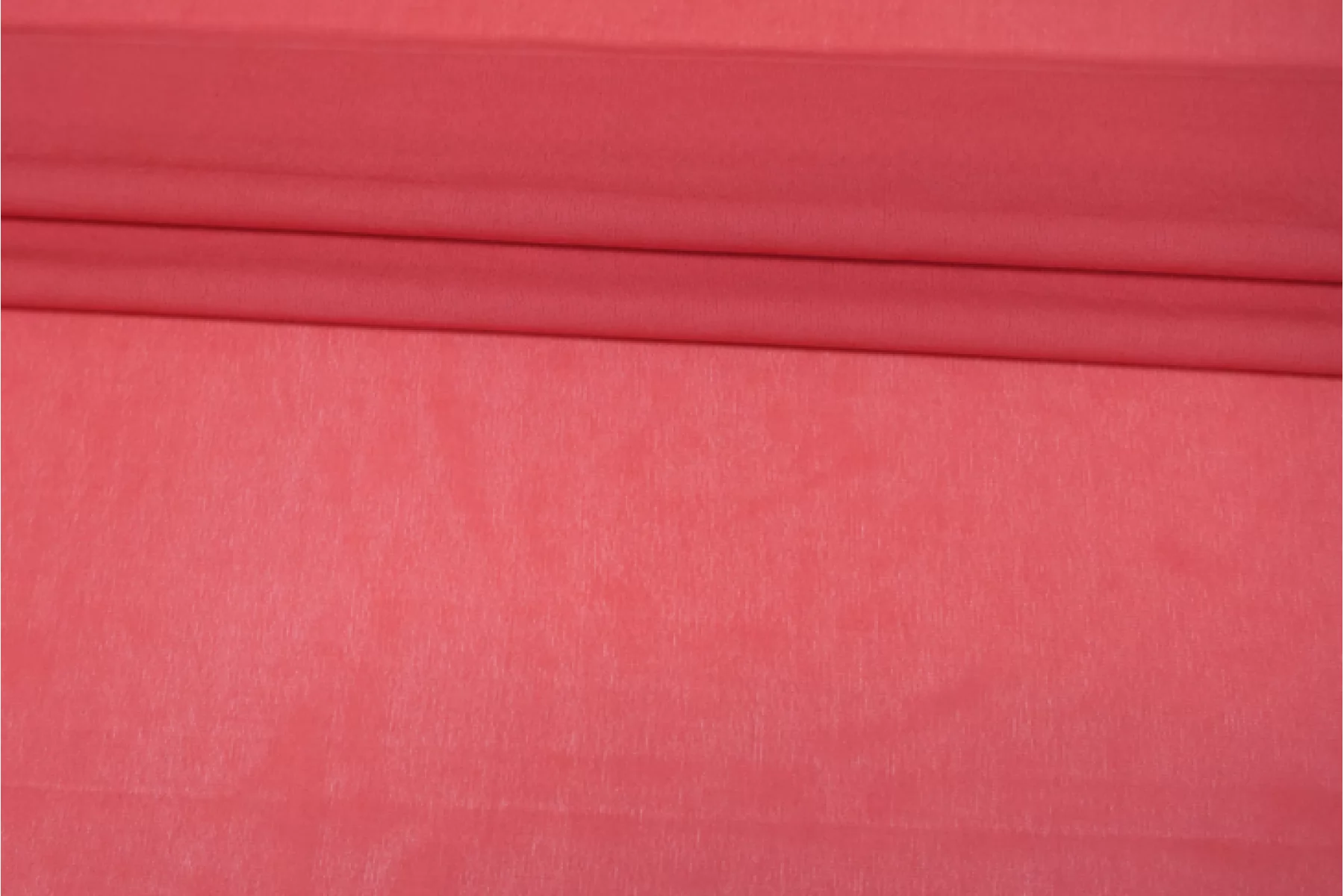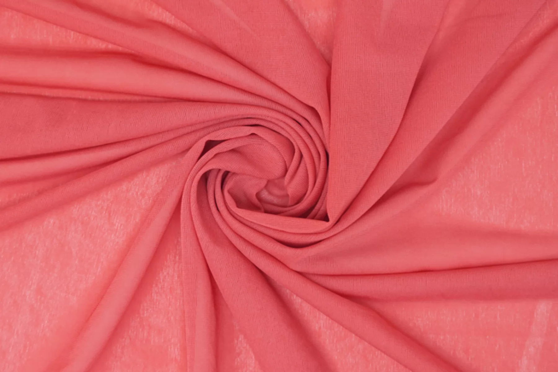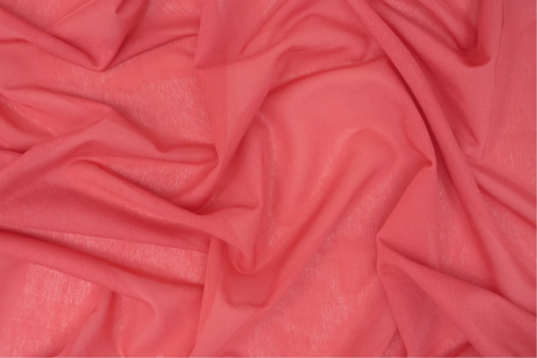 Тонкий вискозный трикотаж в приятном розовом цвете. Материал мягкий, тонкий, прозрачный. Красив в своей пластике. Отлично тянется за счет плетения и содержания эластана. Просвечивает. Форму не держит, но красив в драпировке. Можно использовать в качестве подкладки для тонких шифоновых изделий, для изделий из трикотажа. Либо использовать для изделий в бельевом стиле.