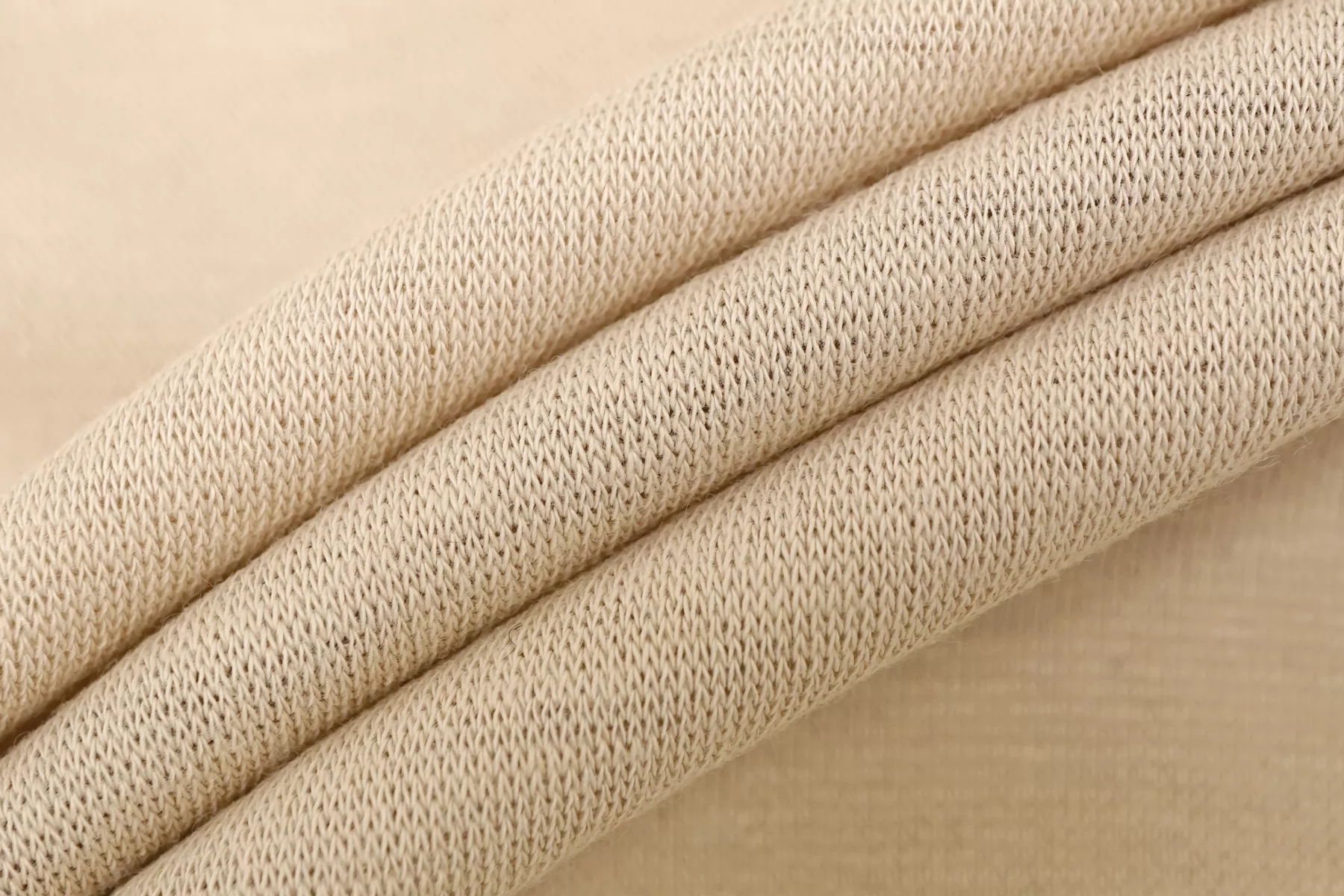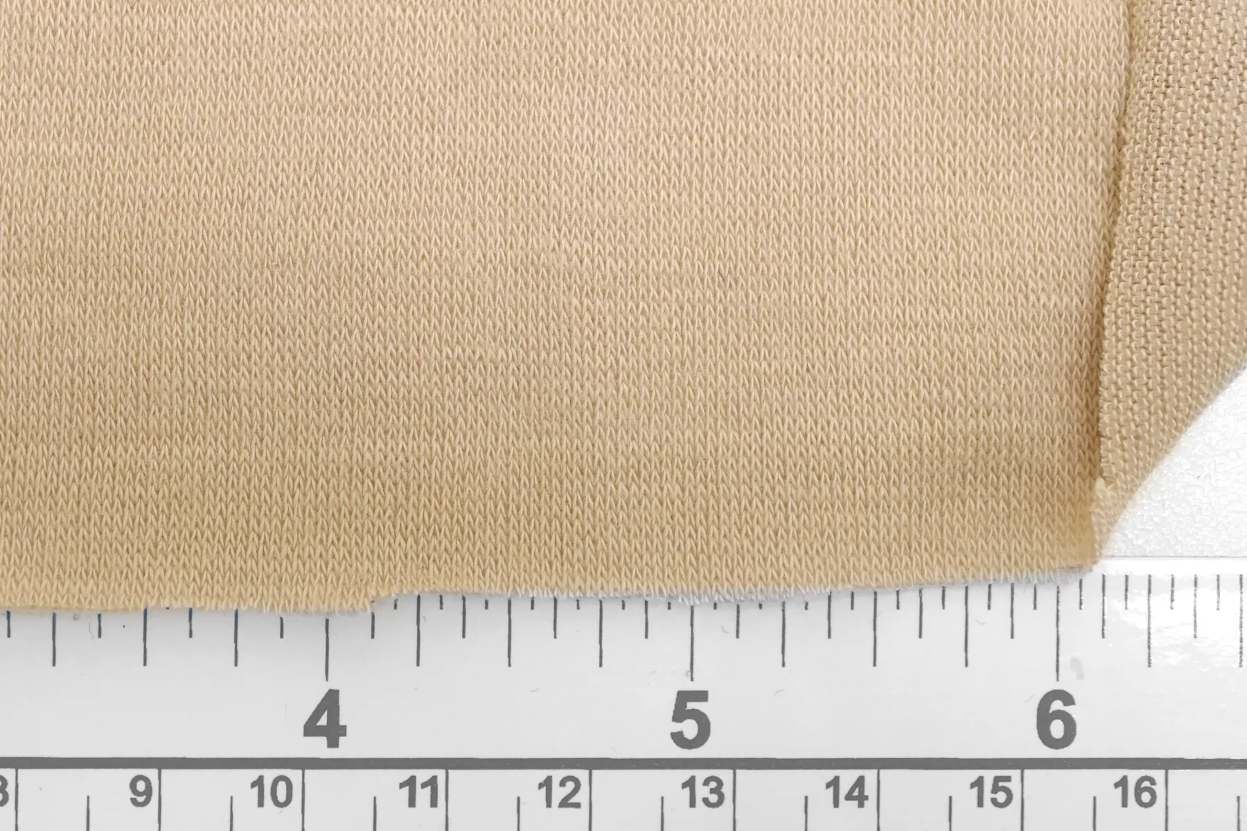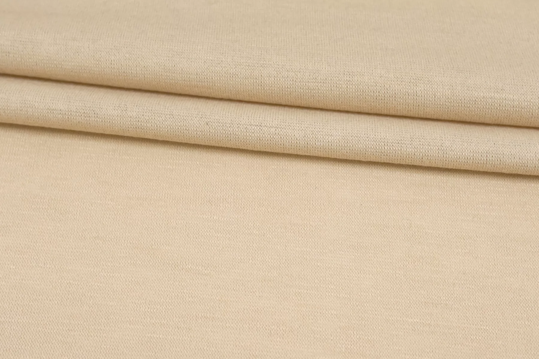 Прекрасный трикотаж - кулирная гладь, из вискозы с добавлением кашемира, в телесном оттенке бежевого. Тактильно очень приятный, гладкий, шерсть не ощущается. Тонкий, слегка просвечивает (при растяжении становится полупрозрачным). Хорошо тянется за счет плетения. Пластичный, форму не держит. Очень комфортный к телу. Можно использовать для пошива маек, футболок, платьев, туник. Уход деликатный.