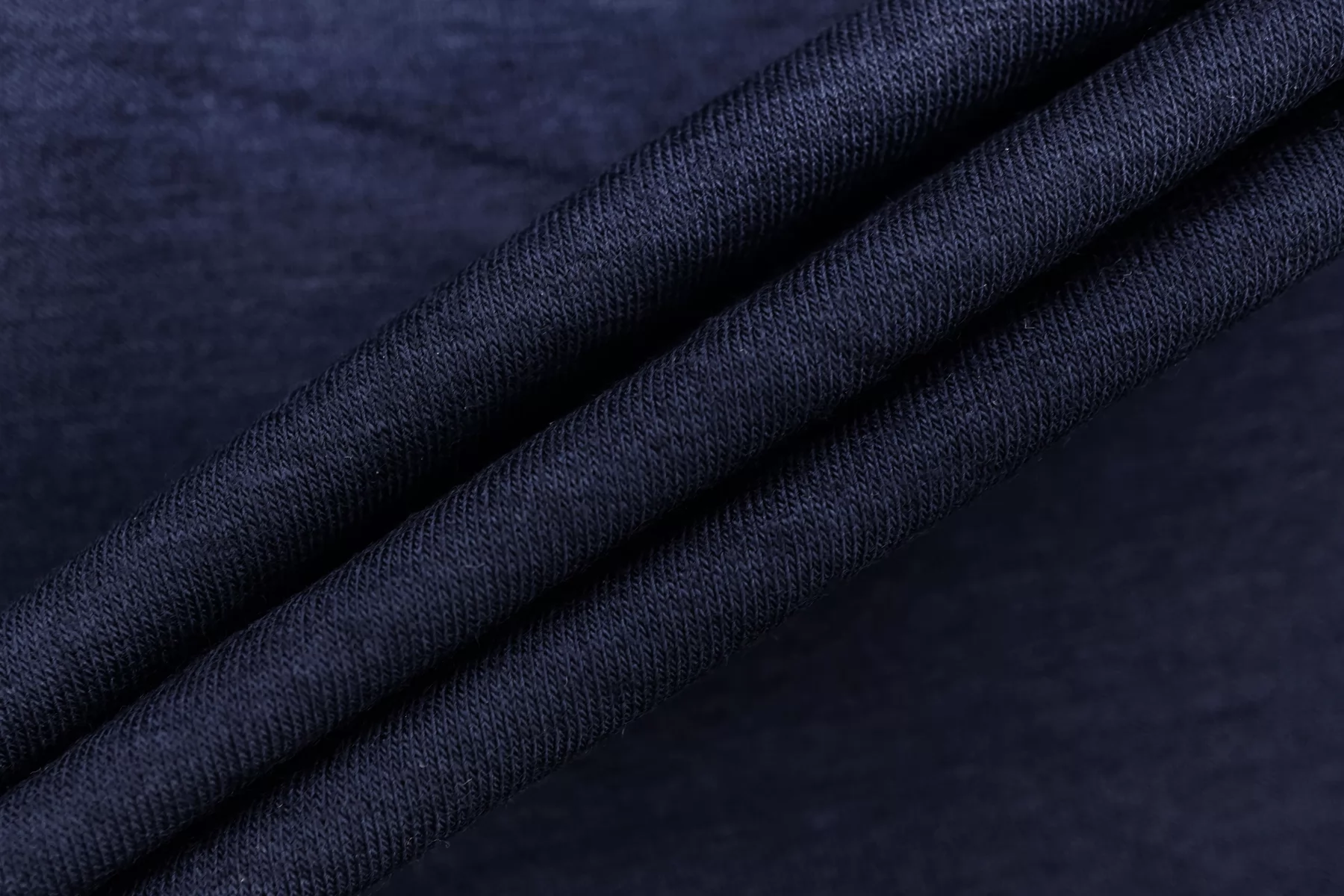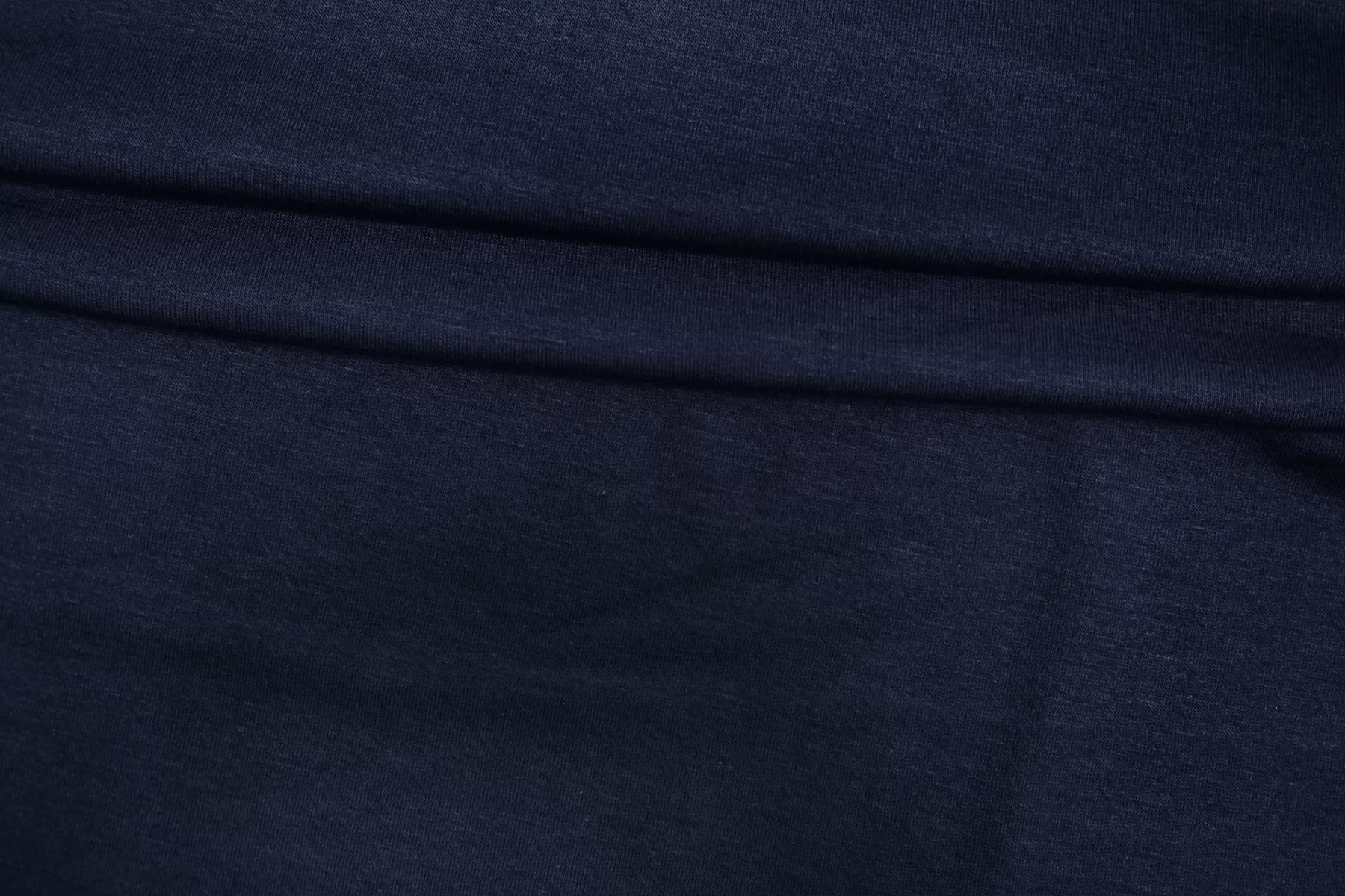 Классный итальянский шерстяной трикотаж тёмно-синего цвета. По плетению кулирная гладь, поверхность с мягким лоском. Материал тактильно приятный, гладкий и мягкий. Эластичный, пластичный. Немного просвечивает в один слой. Прекрасно драпируется и держит форму. Классный вариант на греющие лонгсливы, футболки, платья. Уход деликатный.