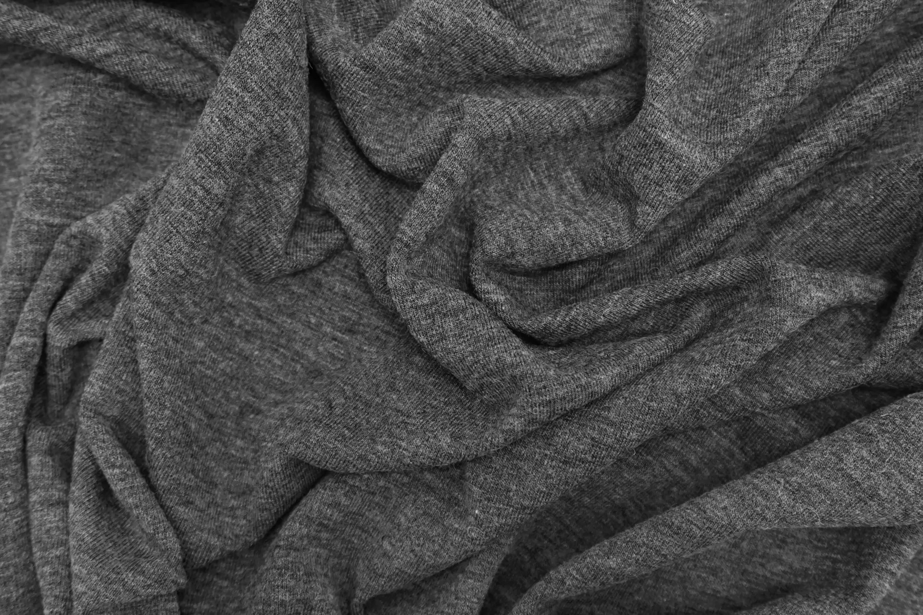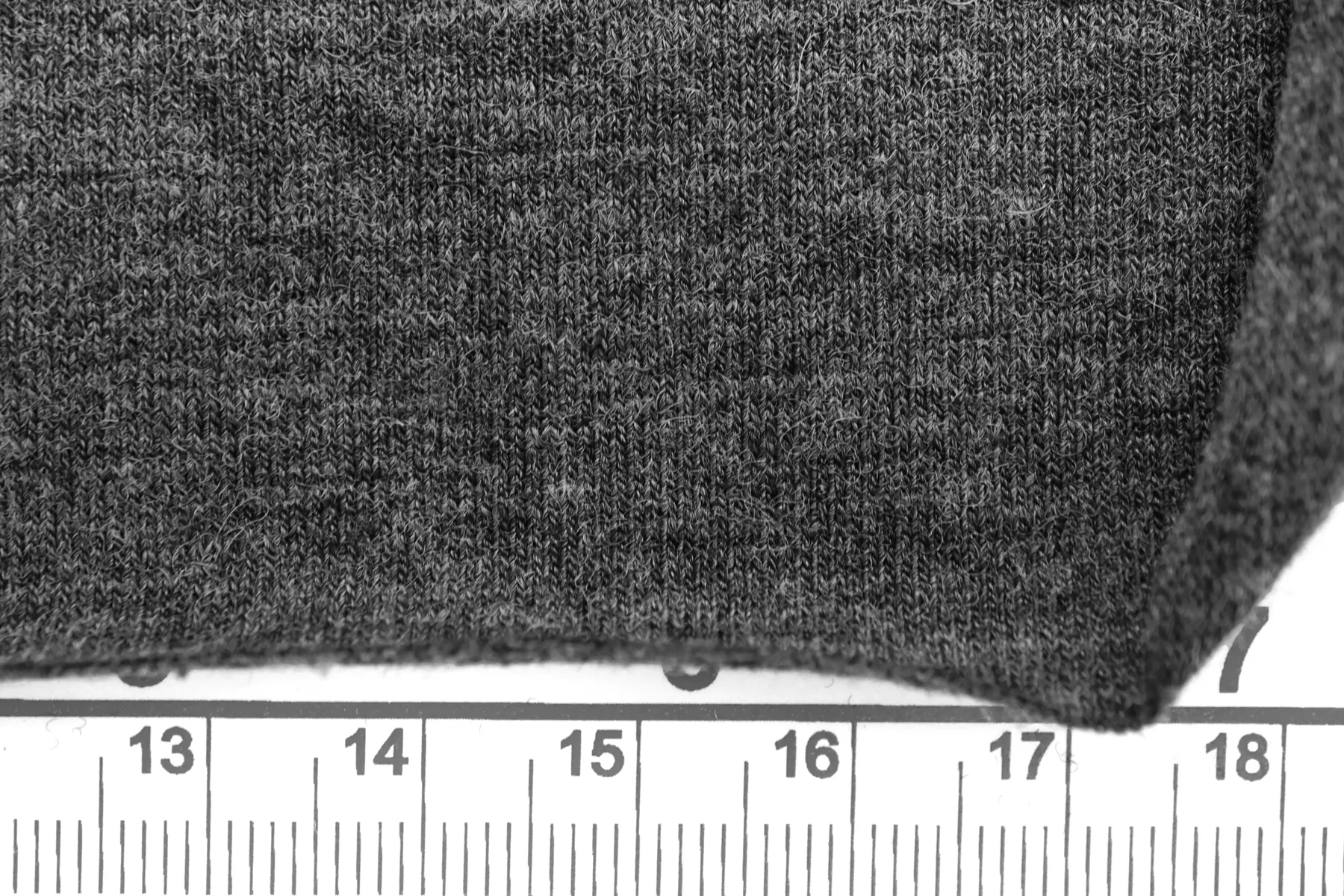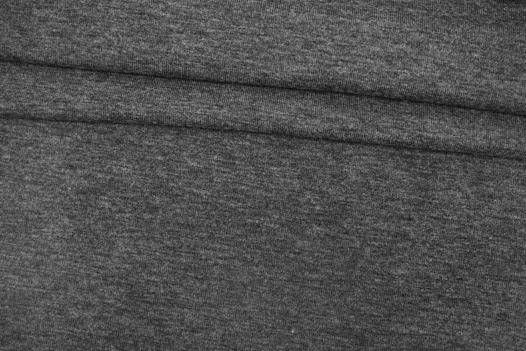Прекрасный трикотаж из вискозы с шерстью в меланжевом сером цвете. Тактильно чуть суховат, слегка колется. Немного просвечивает силуэт. Хорошо тянется за счет плетения и эластана. Пластичный, форму не держит. Можно использовать для пошива лонгсливов, маек, футболок, платьев, туник. Уход деликатный.