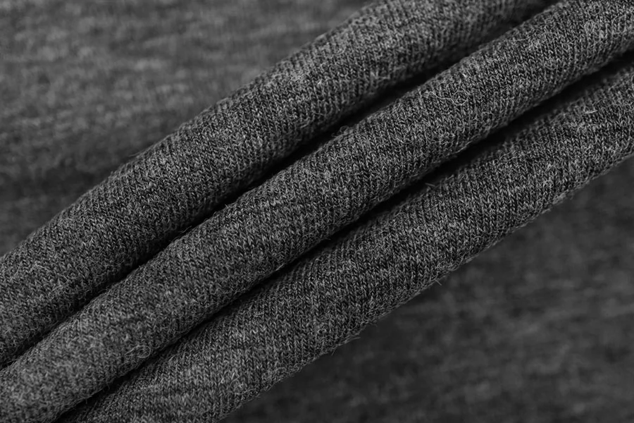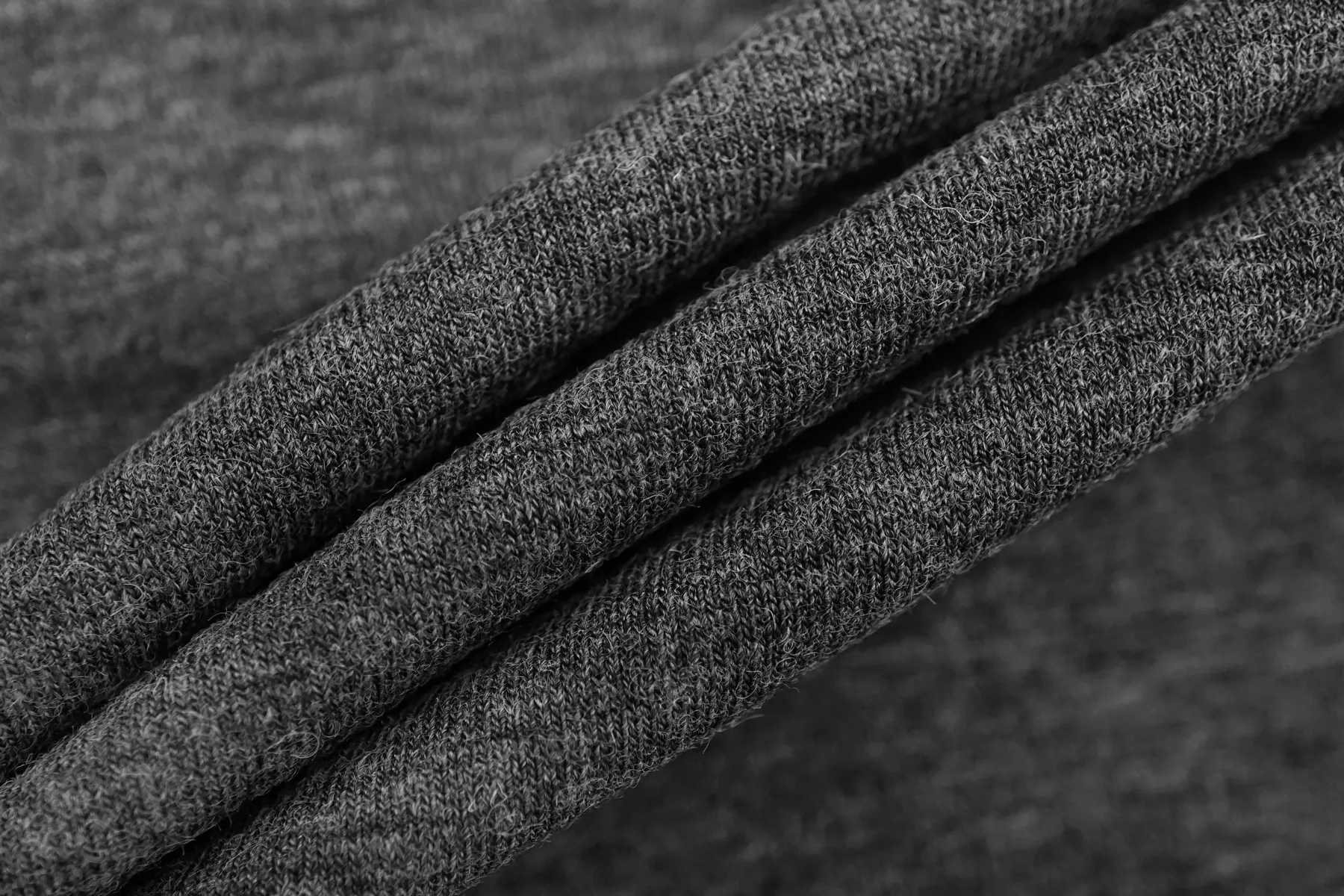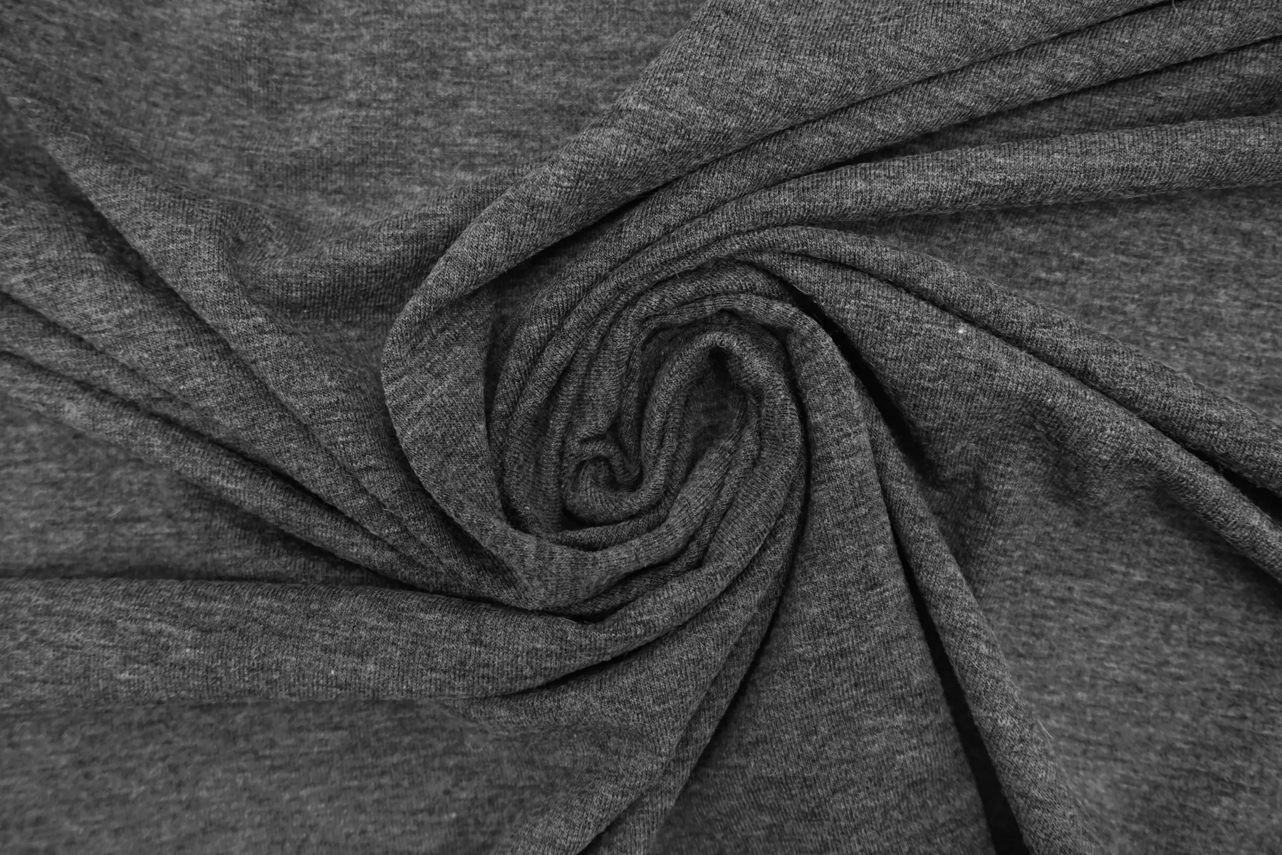 Прекрасный трикотаж из вискозы с шерстью в меланжевом сером цвете. Тактильно чуть суховат, слегка колется. Немного просвечивает силуэт. Хорошо тянется за счет плетения и эластана. Пластичный, форму не держит. Можно использовать для пошива лонгсливов, маек, футболок, платьев, туник. Уход деликатный.
