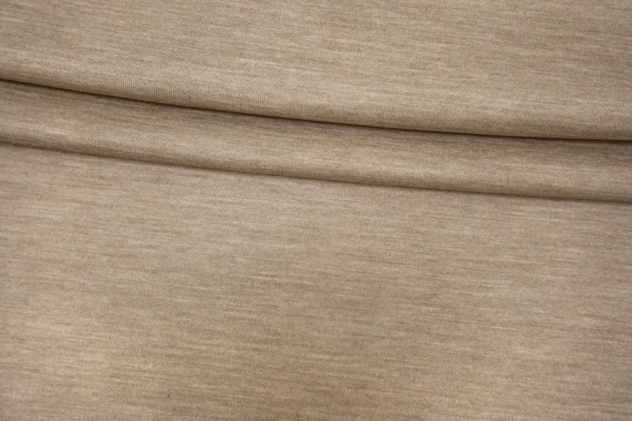 Классный итальянский шерстяной трикотаж в меланжевом бежевом цвете. По вязке ближе к интерлоку. Материал тактильно приятный, гладкий и мягкий. С мягким лоском. Эластичный, пластичный. Не просвечивает. Прекрасно драпируется и держит форму. Классный вариант на греющие лонгсливы, футболки, платья, брюки. Уход деликатный.