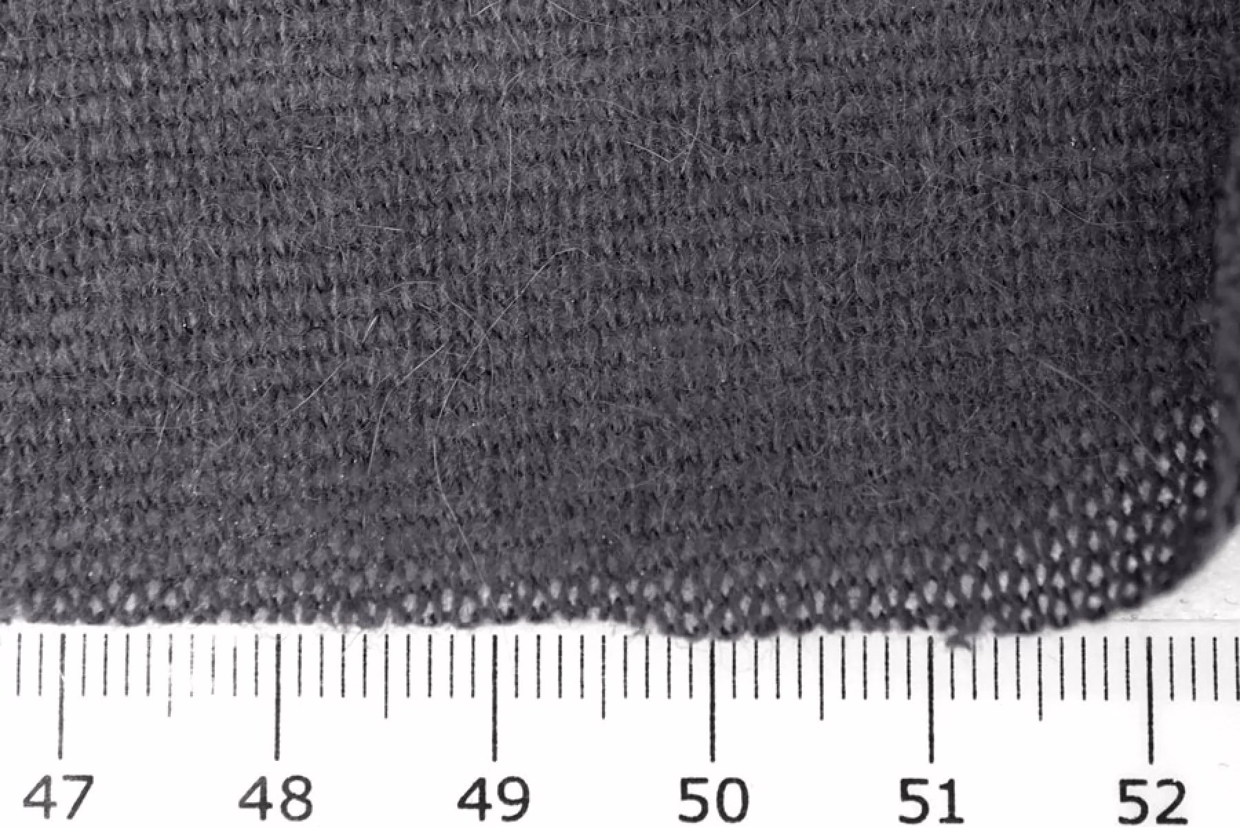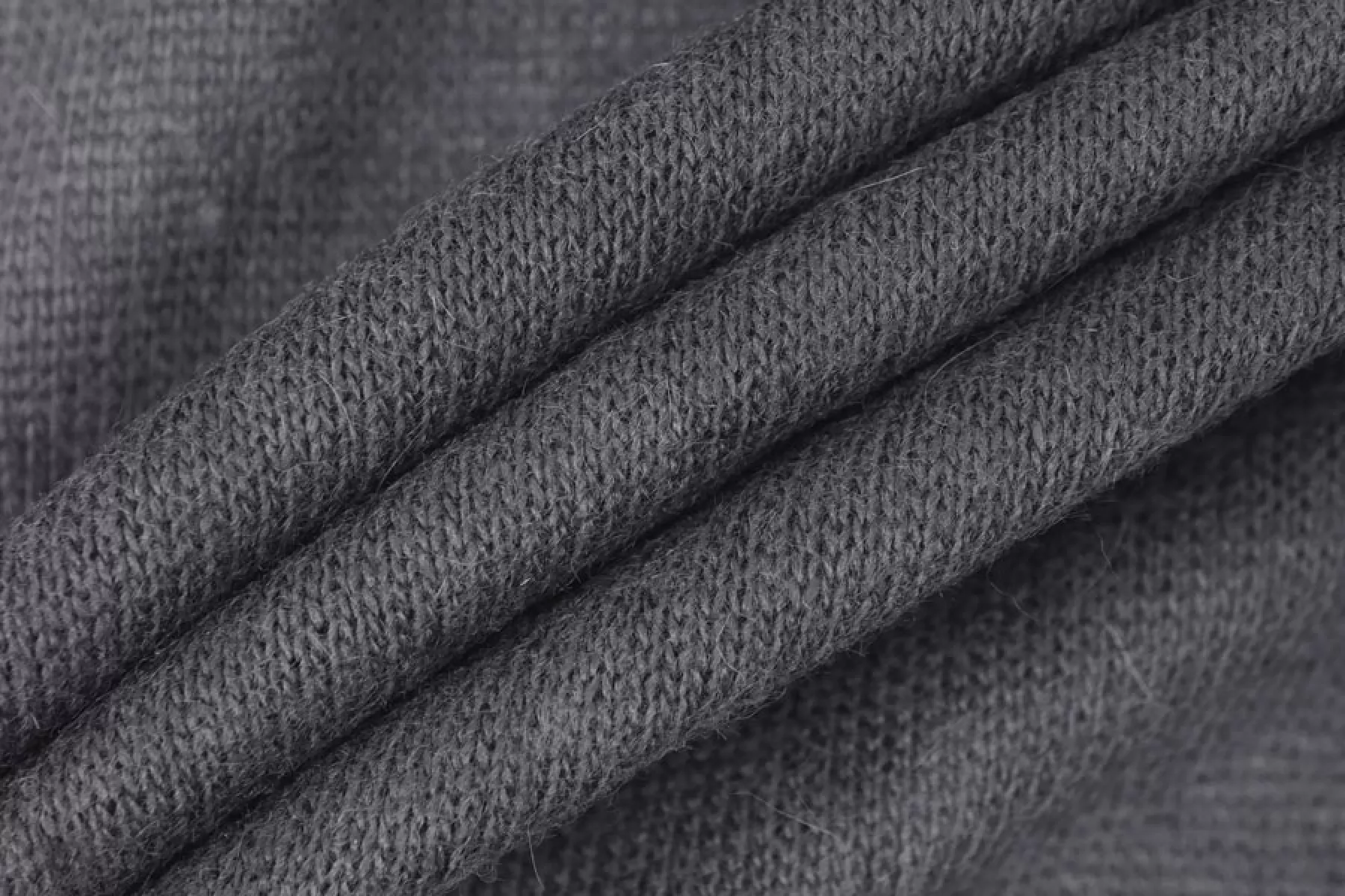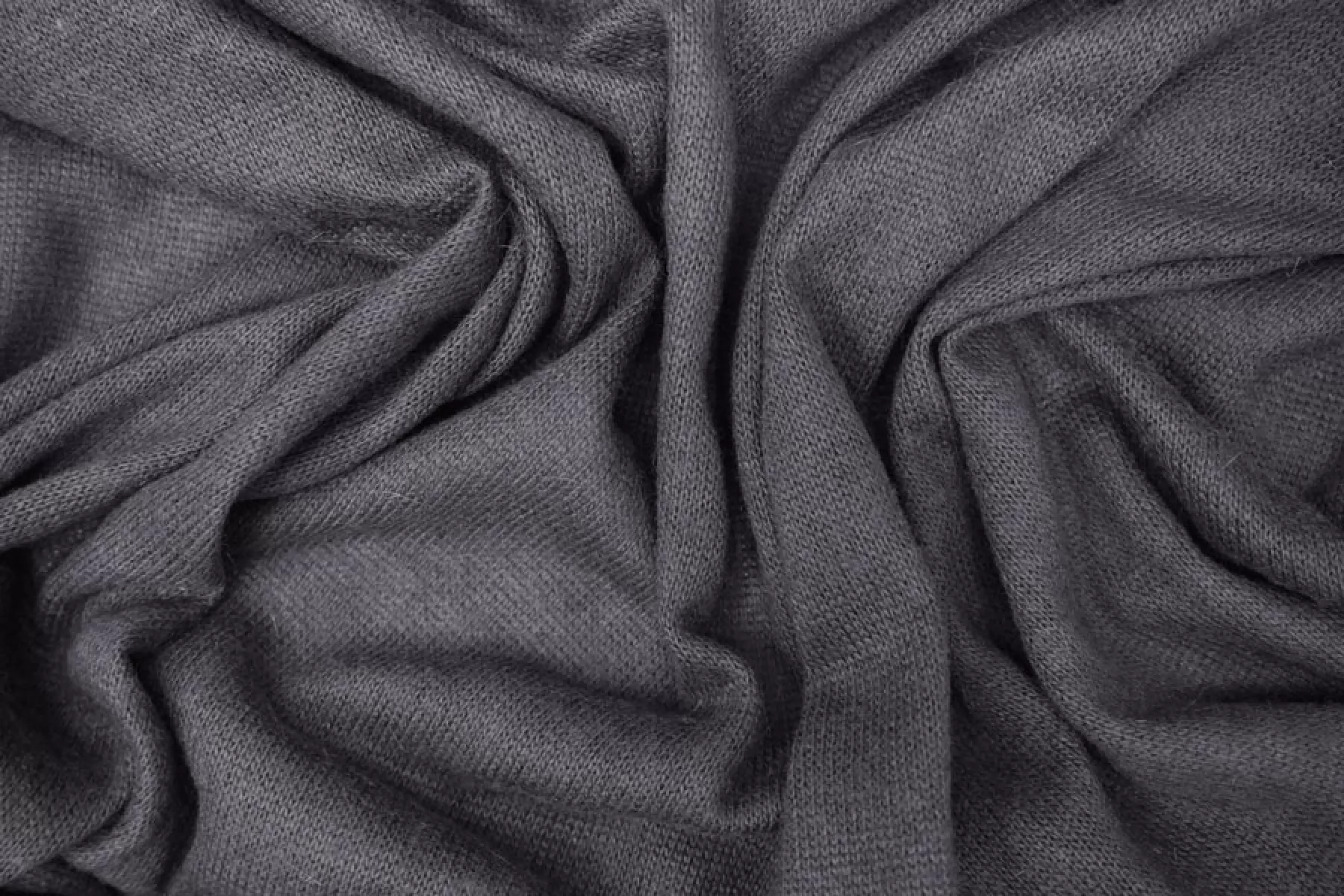 Трикотаж вязаный с шерстью в темно-сером оттенке. Очень приятный и мягкий к телу. С легким ворсом. Пластичный трикотаж, просвечивает. Тянется. Подойдет для пошива платья, свитера, кардигана, пуловера, водолазки, майки, костюма, юбки и т.д.