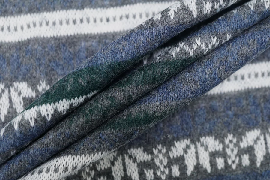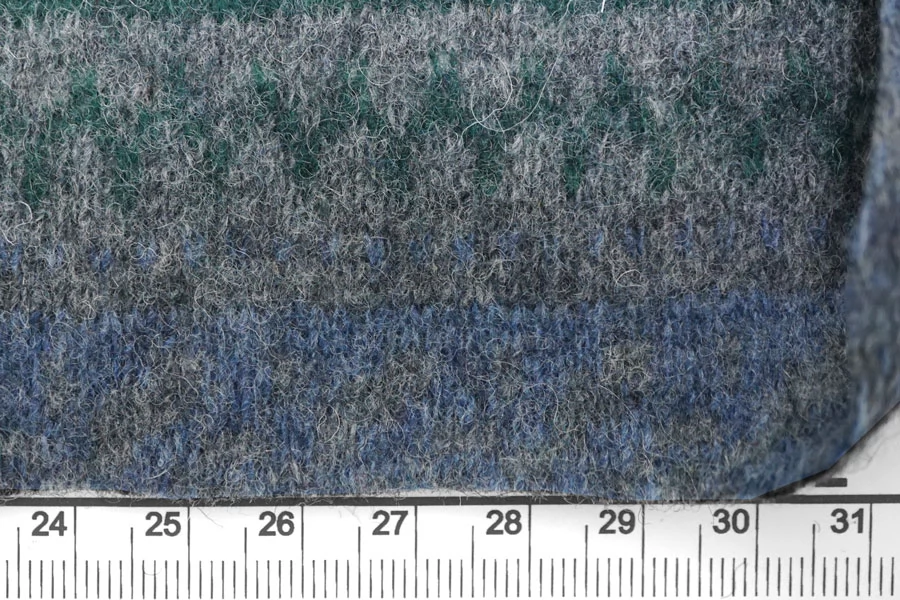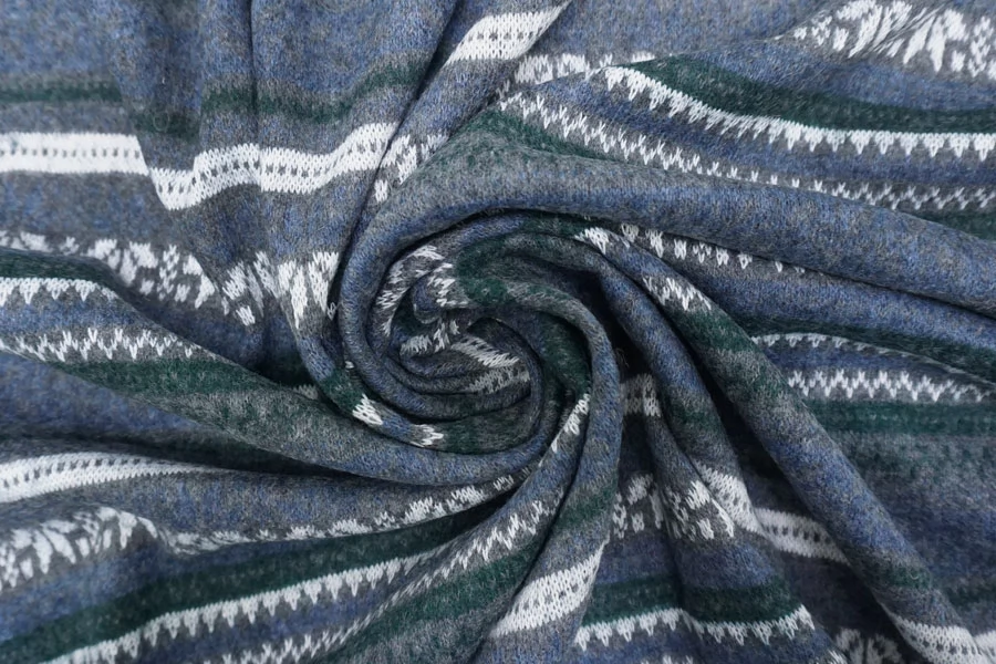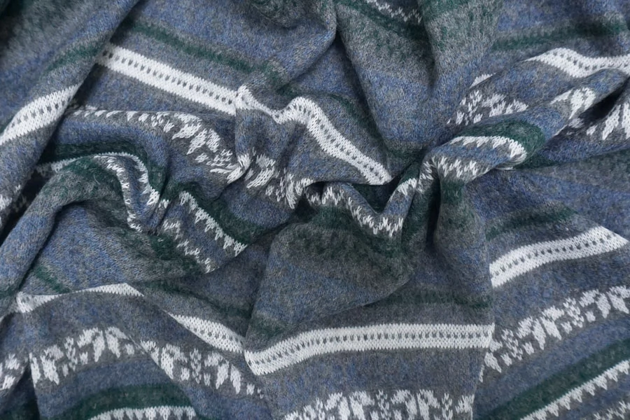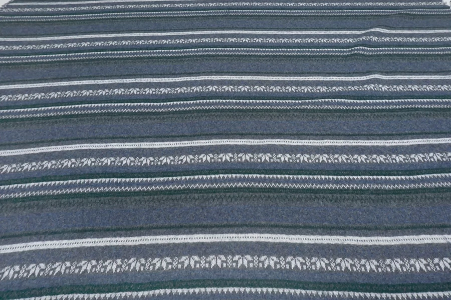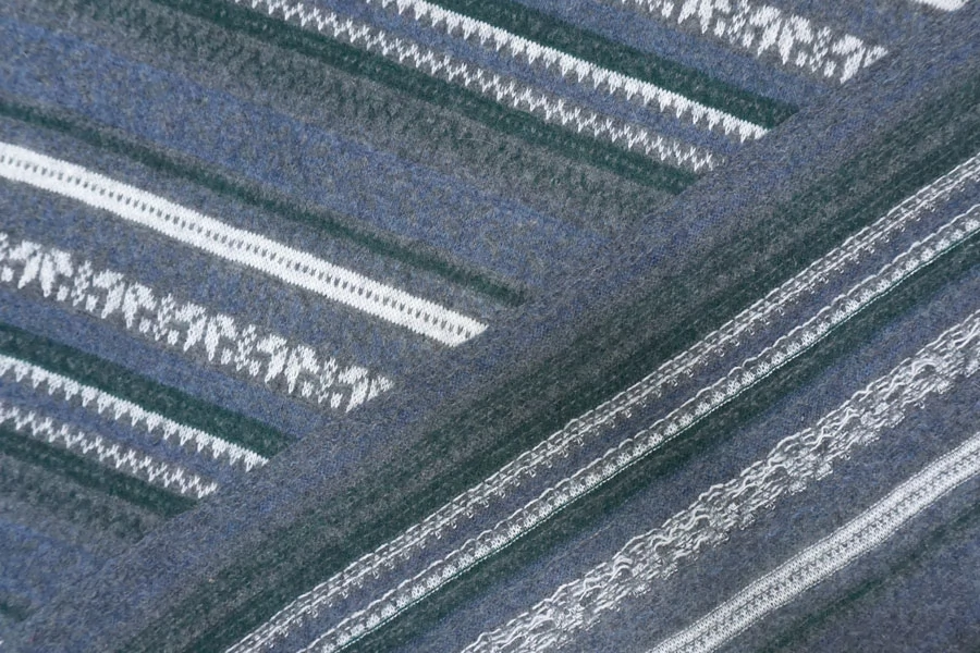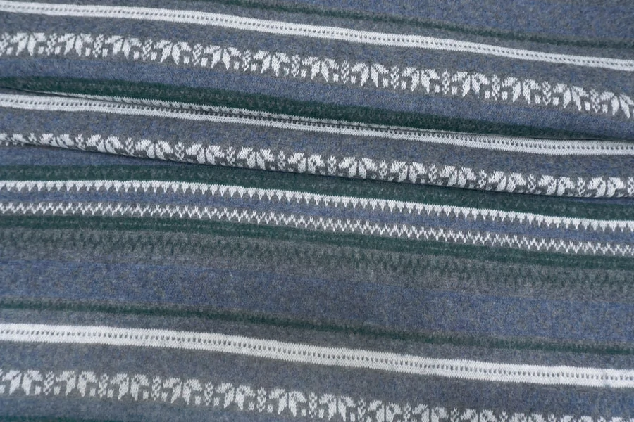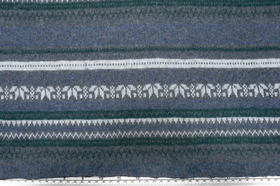 Шикарный вязаный шерстяной трикотаж с горизонтальным орнаментом в сером, синем, изумрудном и белом цвете.. Очень мягкий и приятный наощупь. Плетение не очень лотное, хотя и не рыхлое. Слегка просвечивает. С легким ворсом. Немного колется. Отлично тянется за счет плетения. Хорошо держит форму. Не мнется. Отлично подойдет на свитера, кардиганы, лонгсливы. Уход деликатный. При необходимости используйте подкладочный материал.
