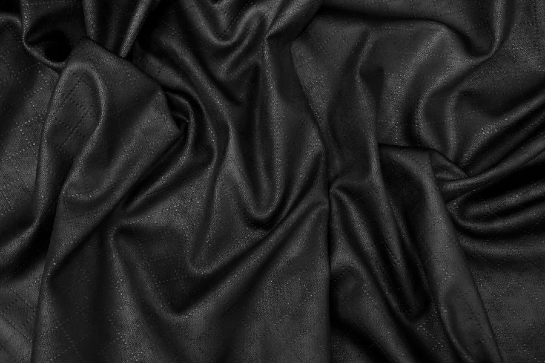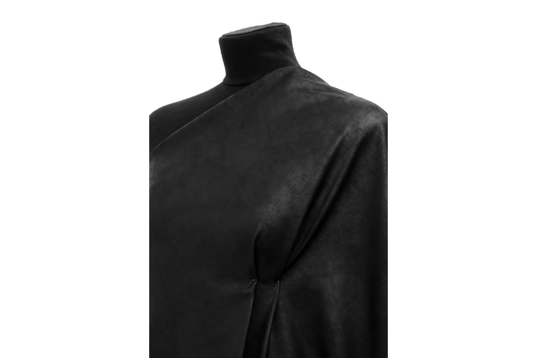 Итальянская экокожа на трикотаже в черном цвете с фактурной выработкой в виде ромбов. Гладкая, плотная, плотная, мягкая. Очень пластичная. Не просвечивает. Средней плотности, не мнется. Отлично тянется. Можно сшить тонкую кожанку для теплой погоды, плотную рубашку, платье, сарафан, шорты, брюки, мягкий пиджак.