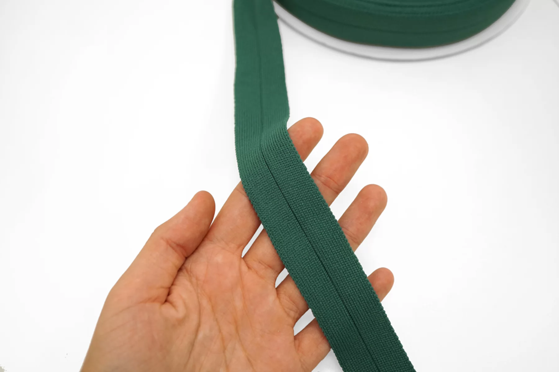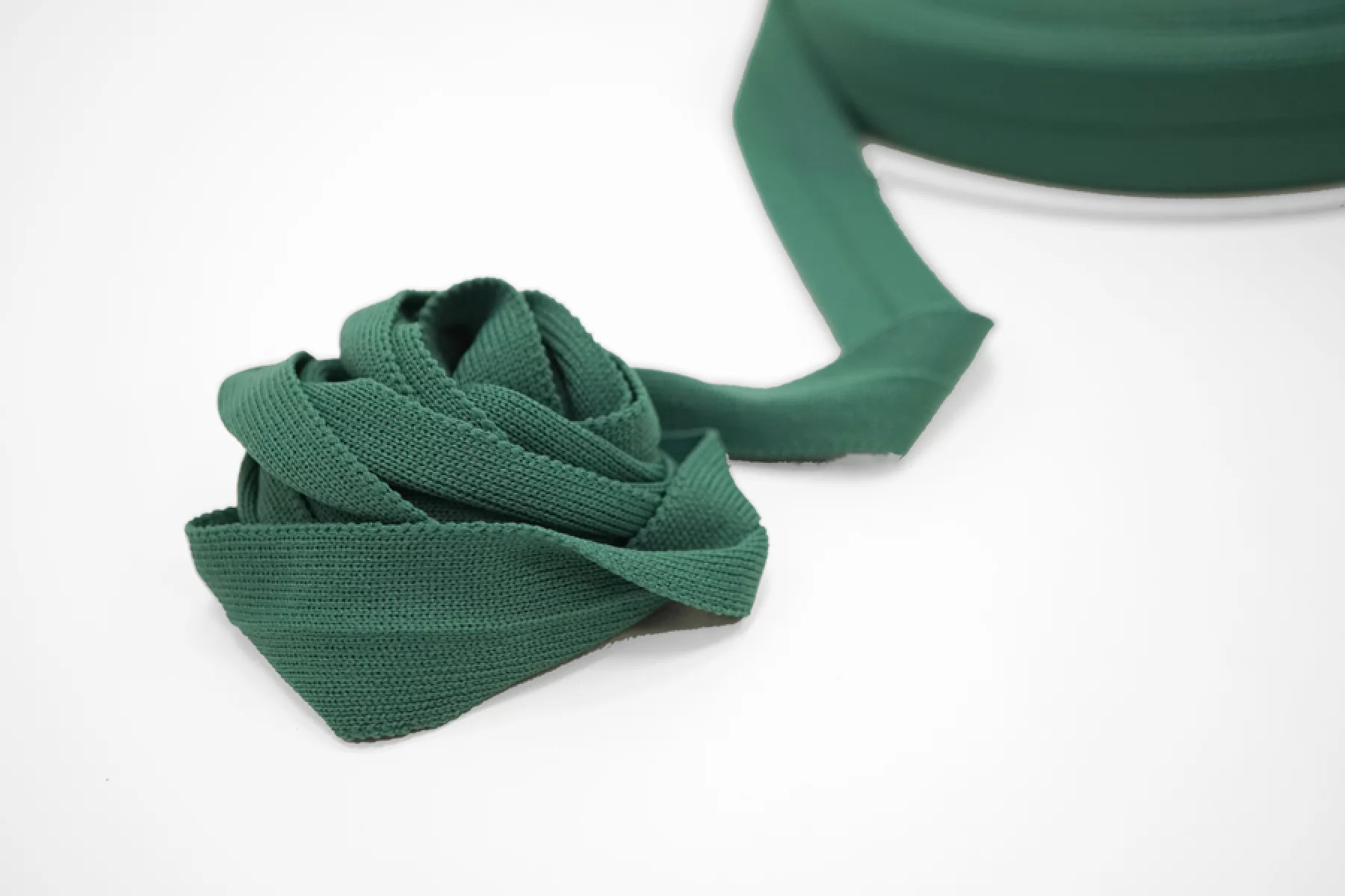 Мягкая трикотажная тесьма приглушенно-зеленого цвета, шириной 3 см. Трикотажное плетение растягивается не в длину, а поперек.