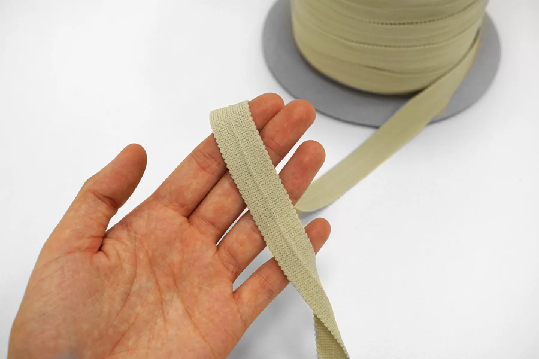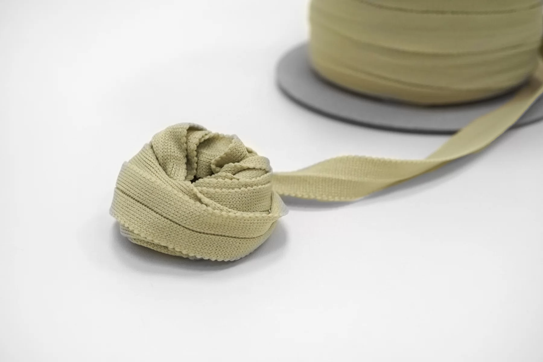 Мягкая трикотажная тесьма цвета шалфей, шириной 2 см. Трикотажное плетение растягивается не в длину, а поперек.