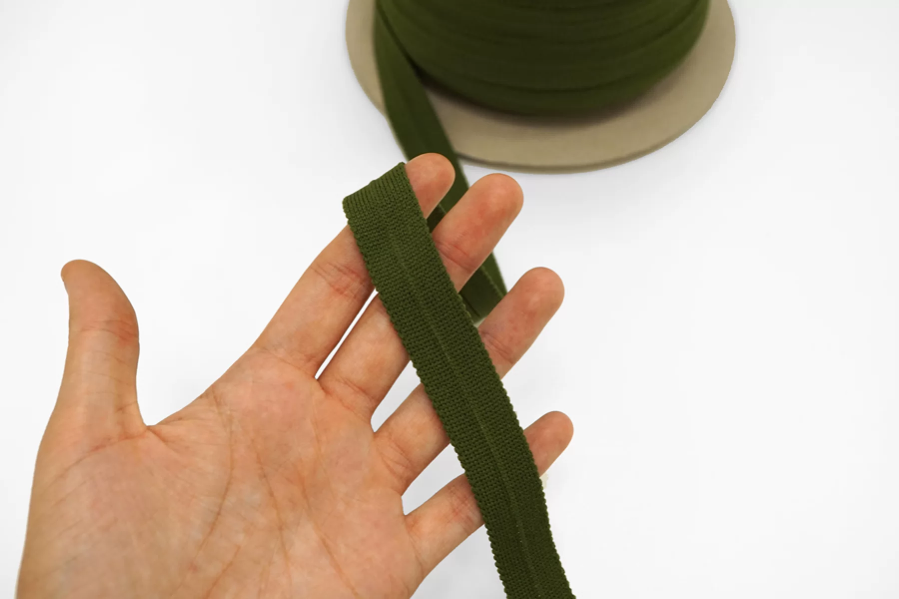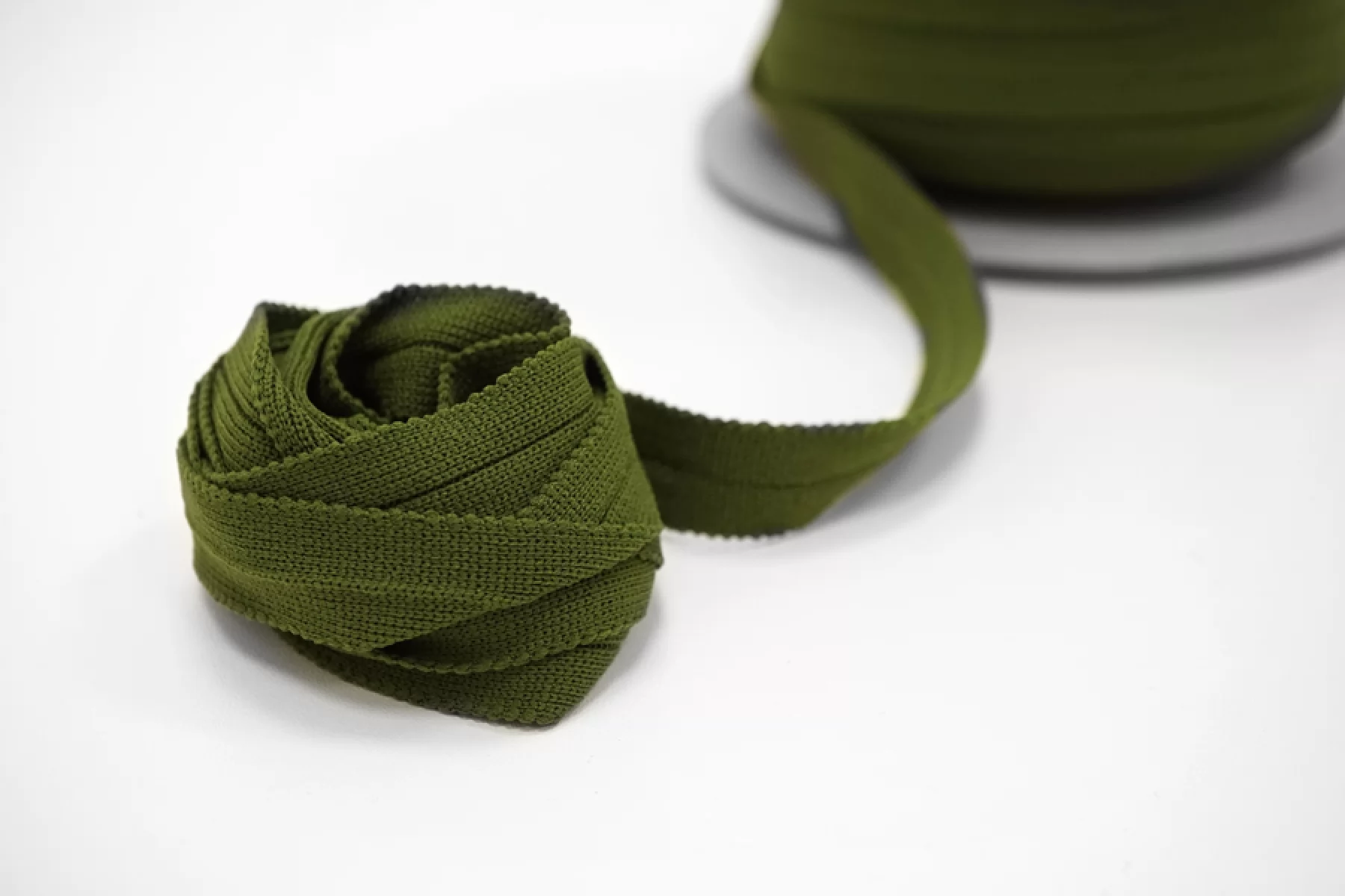 Мягкая трикотажная тесьма темно-зеленого цвета, шириной 2 см. Трикотажное плетение растягивается не в длину, а поперек.