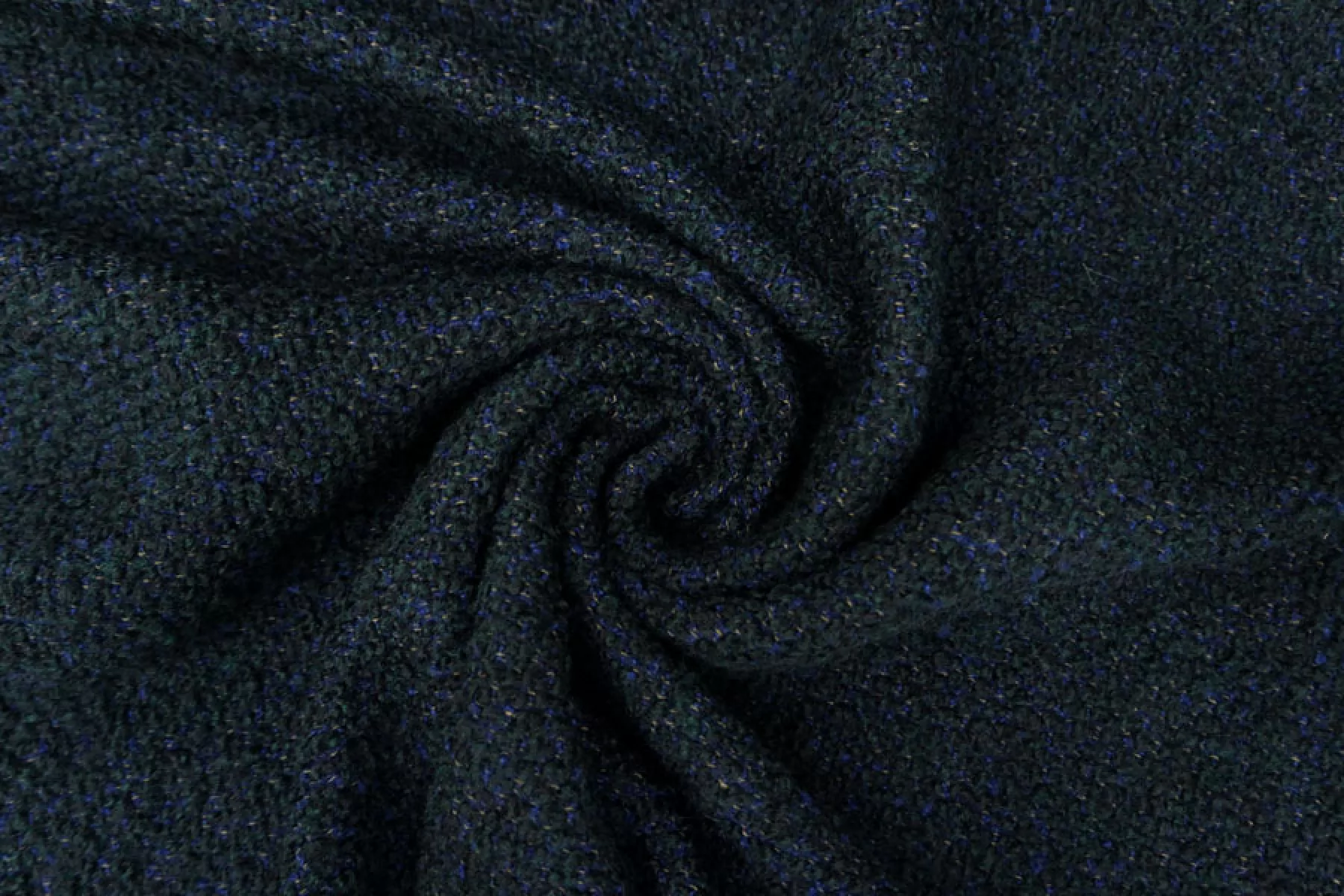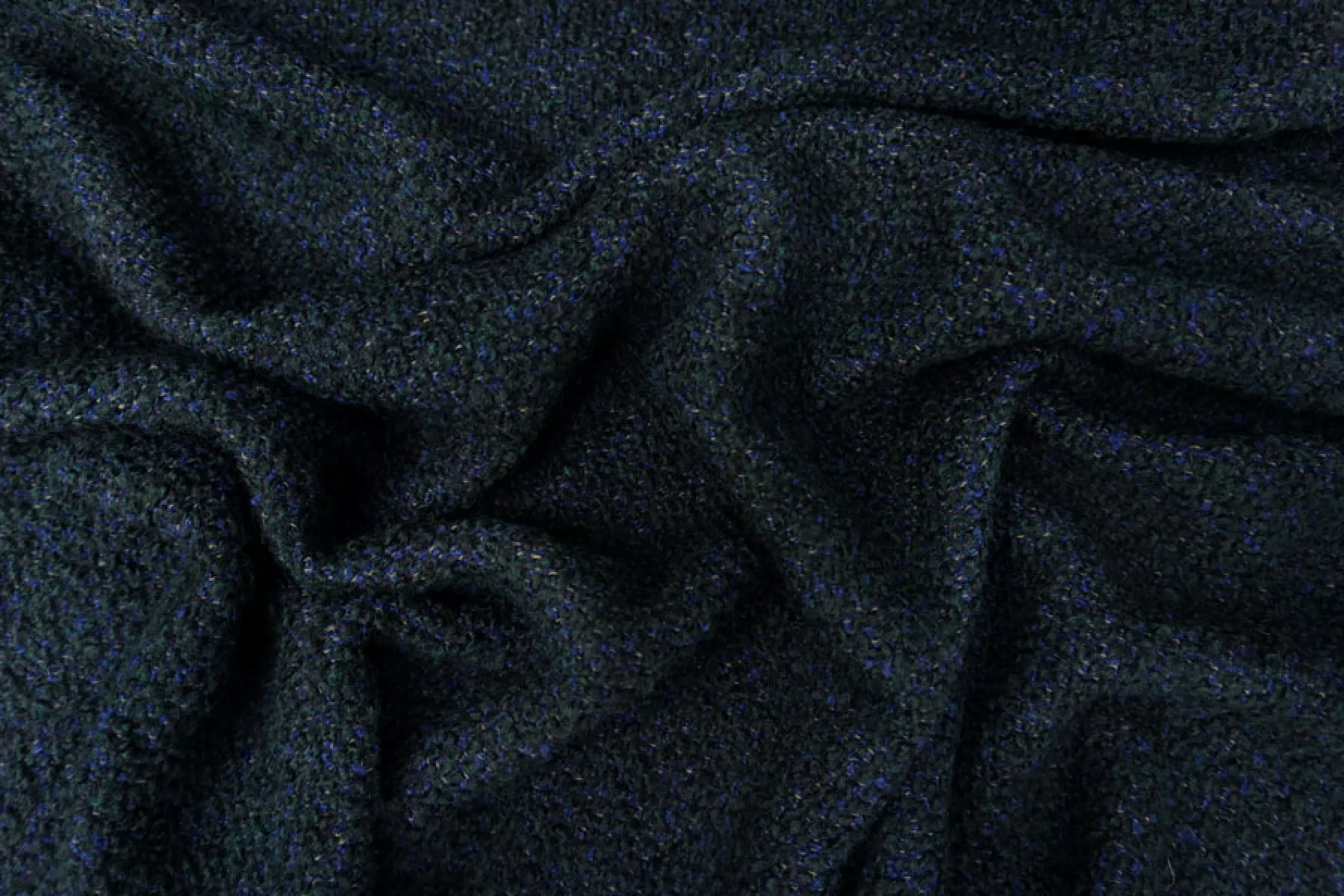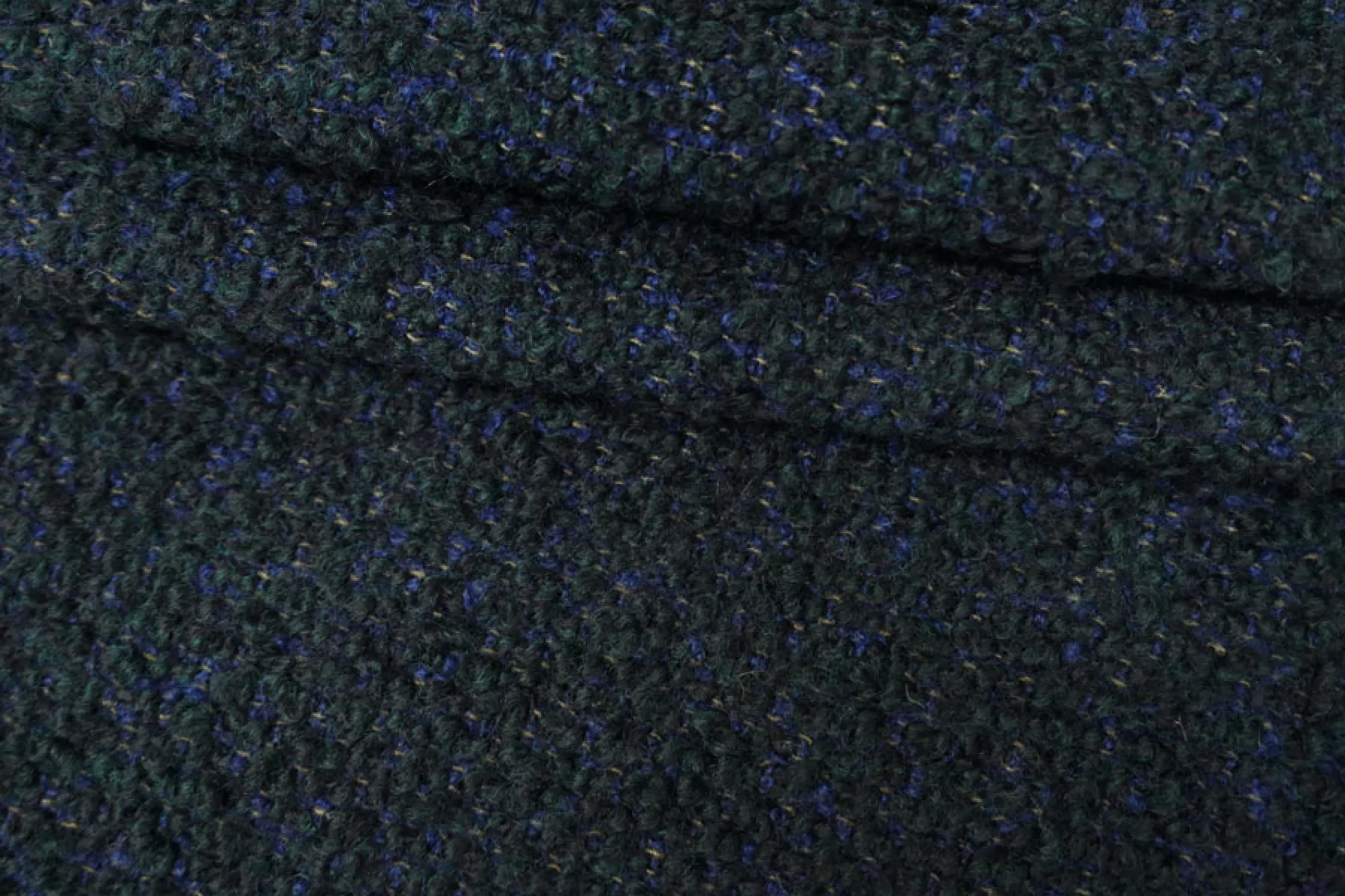 Шикарный шерстяной твид букле с добавлением мохера темно-зеленого цвета, изнанка синего цвета. Мягкий и фактурный наощупь, чуть-чуть суховатый. С приятным лоском. Чуть-чуть растягивается. Пластичный. Не мнется. Не просвечивает. Форму держит. Подойдет как на костюмную, так и на пальтовую группу. Уход деликатный.