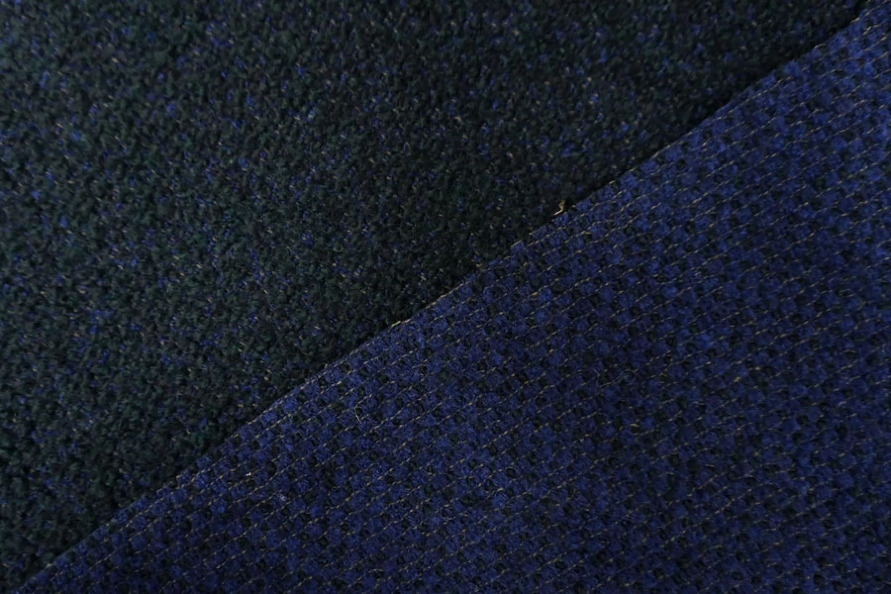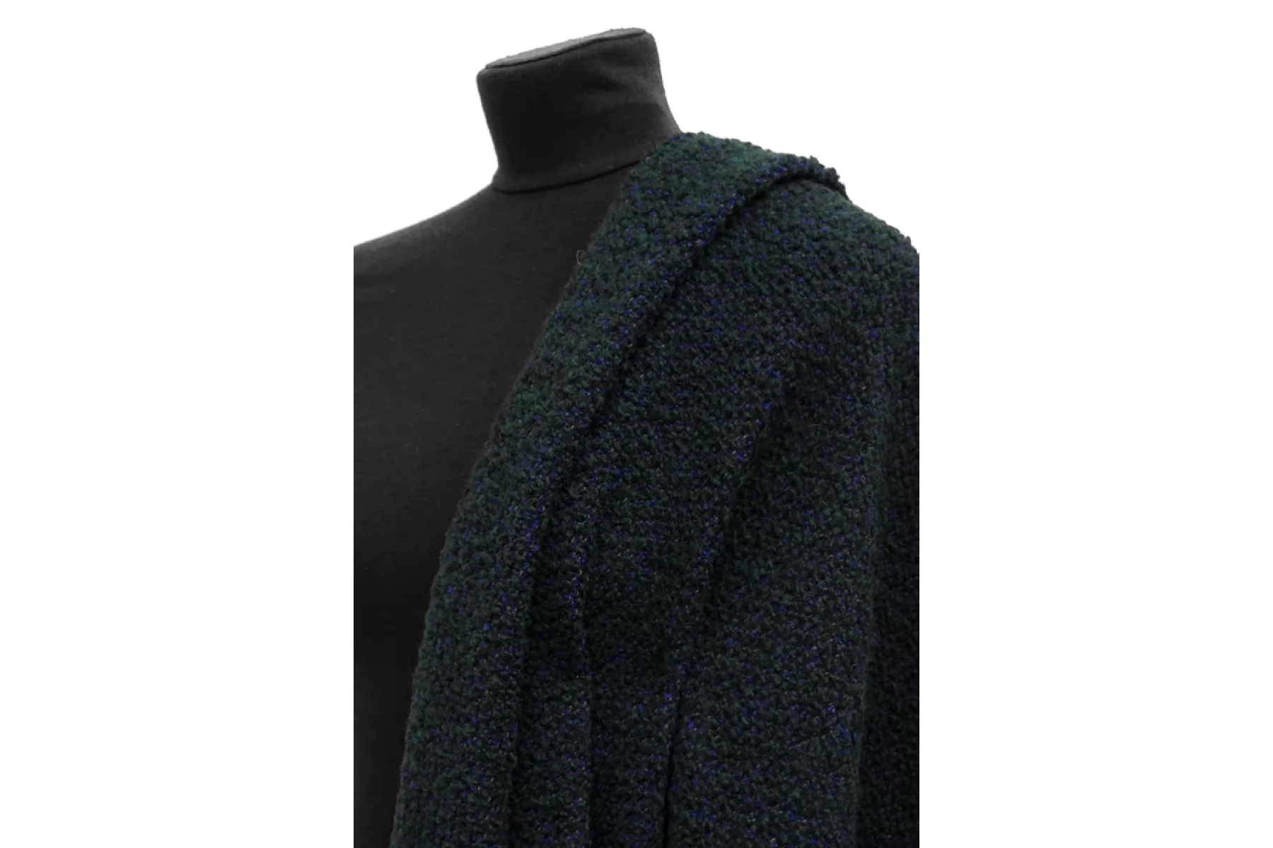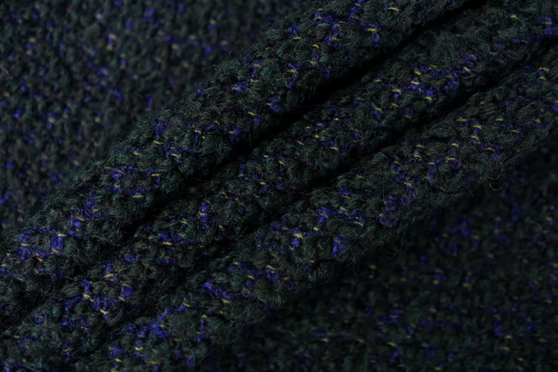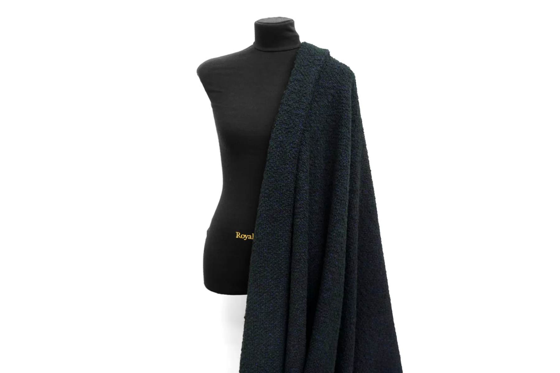 Шикарный шерстяной твид букле с добавлением мохера темно-зеленого цвета, изнанка синего цвета. Мягкий и фактурный наощупь, чуть-чуть суховатый. С приятным лоском. Чуть-чуть растягивается. Пластичный. Не мнется. Не просвечивает. Форму держит. Подойдет как на костюмную, так и на пальтовую группу. Уход деликатный.