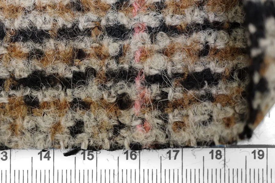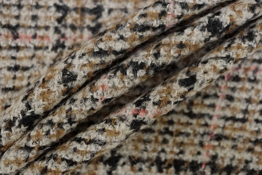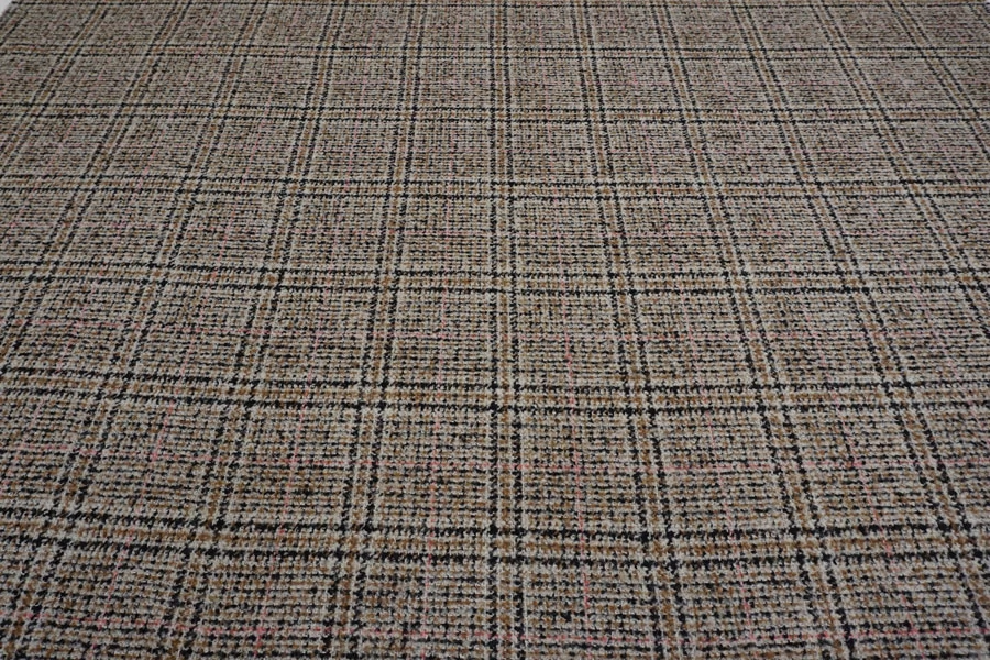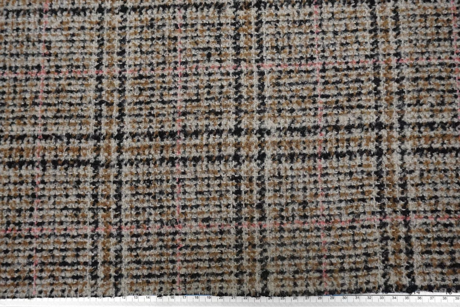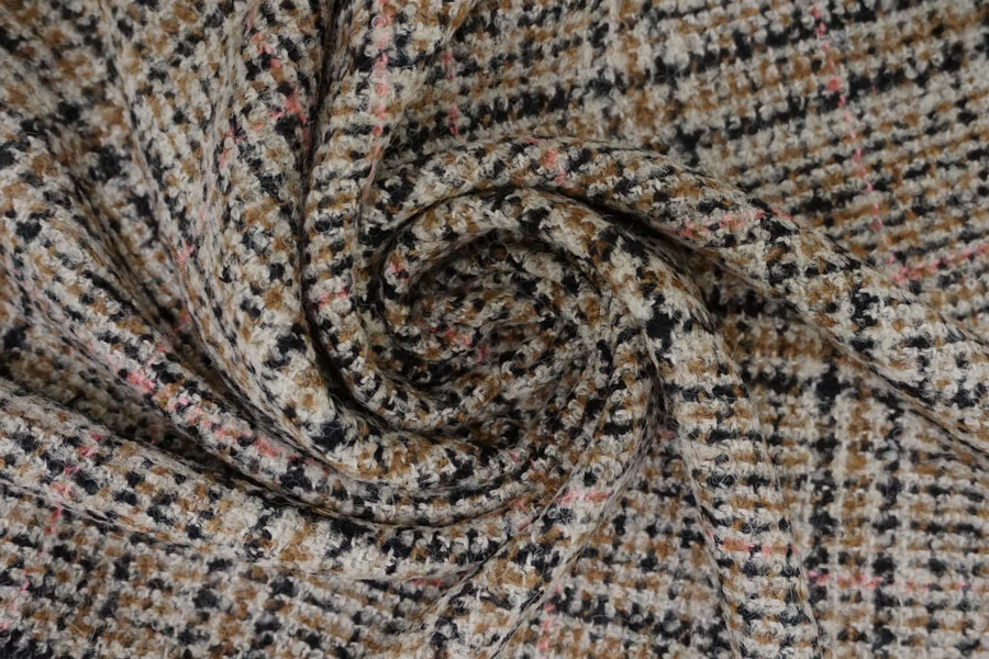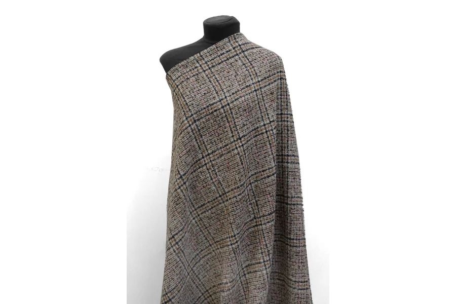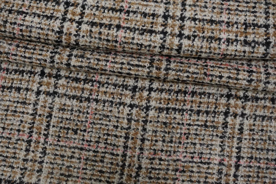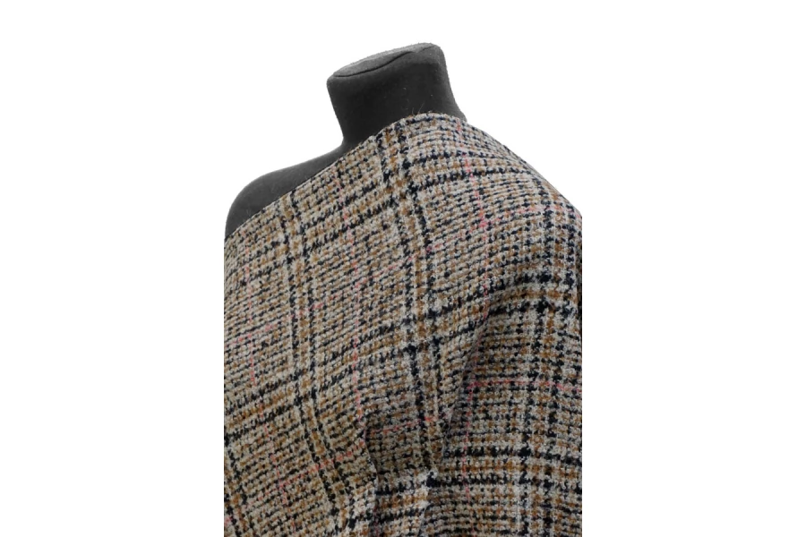 Шикарный шерстяной твид букле с добавлением мохера, использованы цвета: светлый серо-бежевый, чёрный, коричневый и розовый. Слегка суховатый, мохер покалывает. Узелки-букле прижатые. Чуть-чуть растягивается благодаря плетению. Пластичный, не мнется. Не просвечивает. Форму держит. Подойдет для тёплого зимнего пиджака или жакета, или для демисезонного пальто ( утеплителем можно и на зимнее). Уход деликатный.