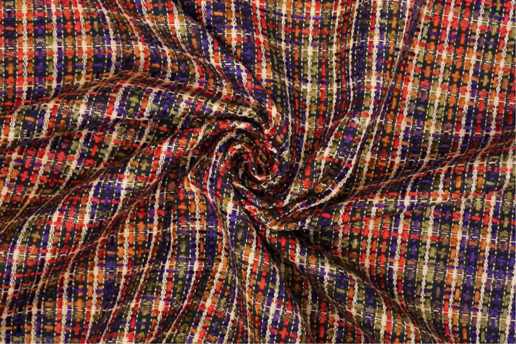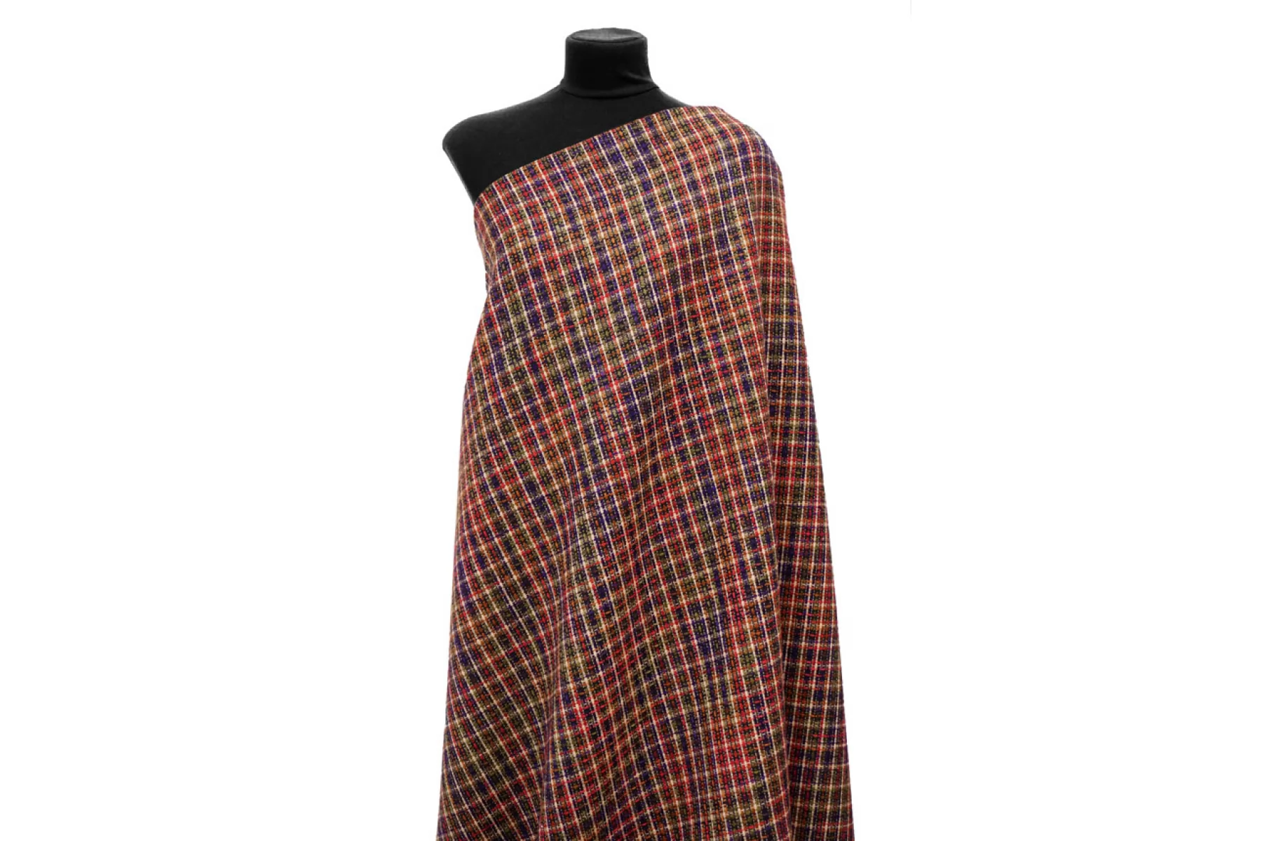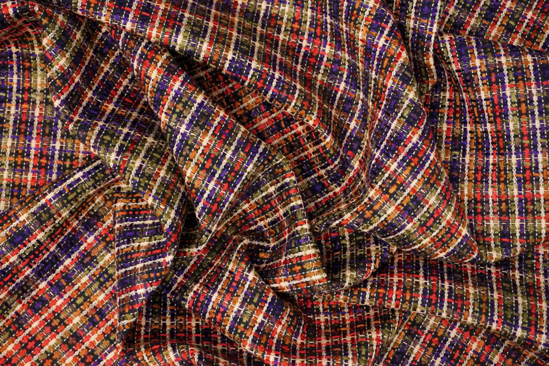 Необычный твид на дублерине в оттенках фиолетового, бежевого, оливкового, темно-красного и не только. В полотне переплетаются как более толстые нити, так и тонкие. Образуется рисунок некрупной клетки. Мягкий, с нежным лоском. Не тянется. Не мнется. Не просвечивает. Хорошо драпируется и держит форму. Вариант на юбки, жакеты, костюмы и легкие пальто.