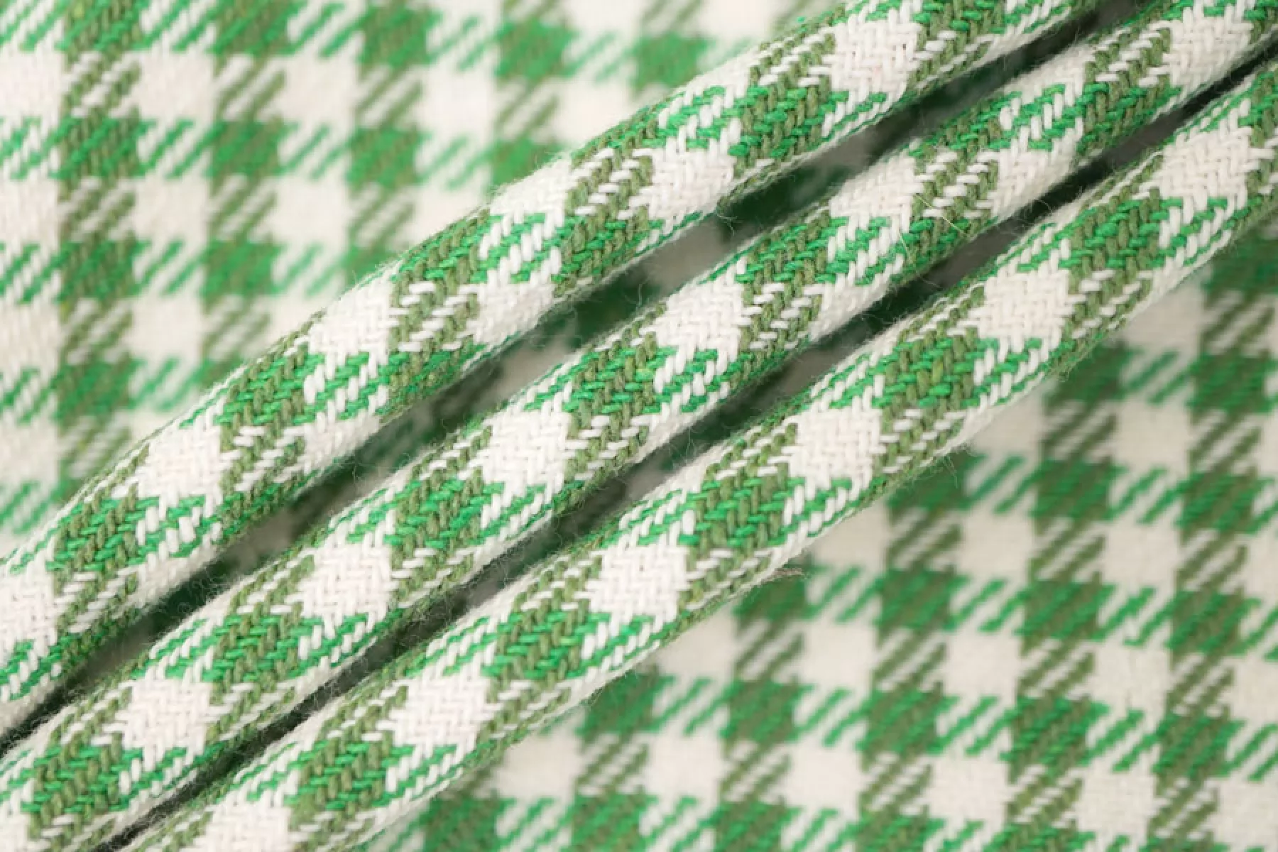 Отличный хлопковый твид костюмной плотности в мелкую клетку, которую образует переплетение молочных, зеленых нитей и хаки. Тактильно плотненький, шероховатый. Слегка сминается, но восстанавливается. Не просвечивает и не тянется. Отлично драпируется и держит форму. Шьем костюмные варианты, юбки, жакеты, летние пальто и не только.