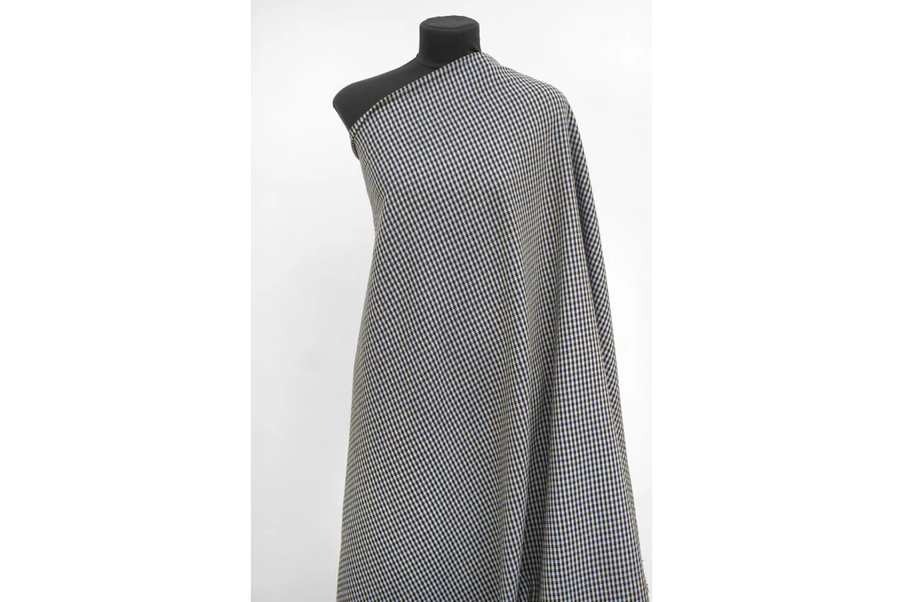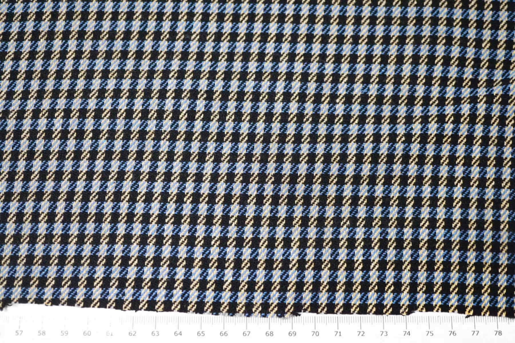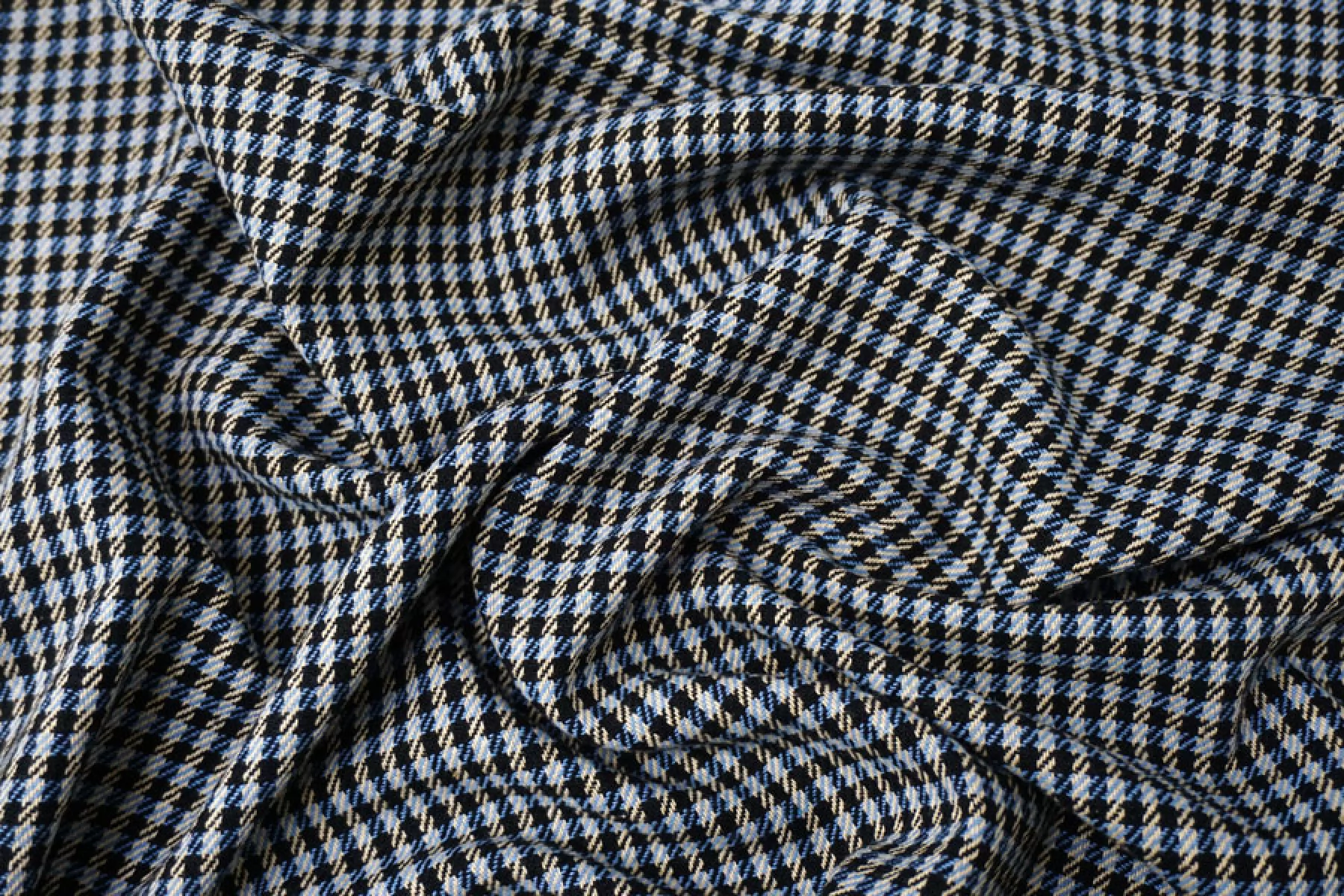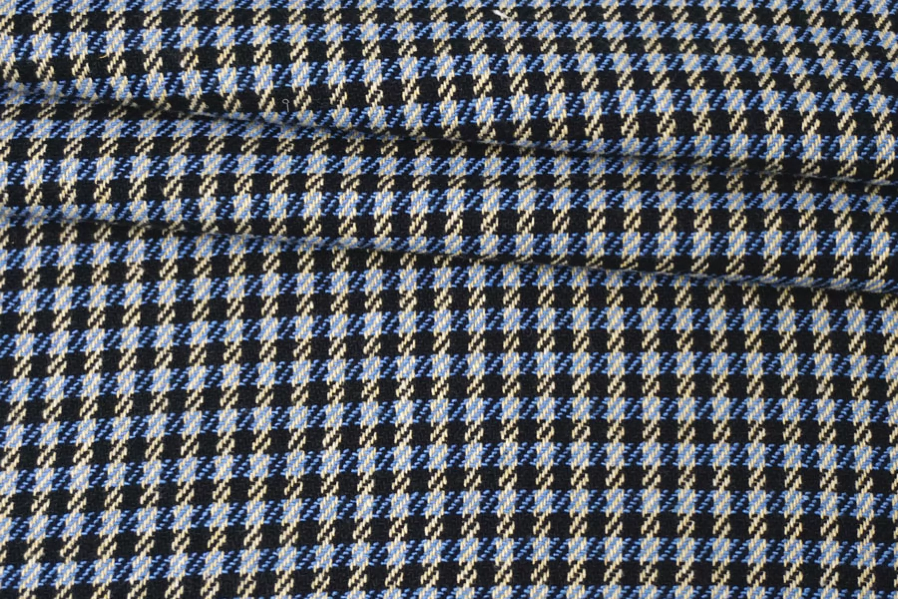 Отличный твид костюмной плотности в клетку переплетения нитей черного, бежевого и синего оттенков. Тактильно мягкий и приятный. Практически не мнется - восстанавливается. Не просвечивает. Пластичный. Неплохо пружинит за счет эластана. Хорошо драпируется и держит форму. Классно подойдет на костюмные варианты, юбки, жакеты, летние пальто и не только.