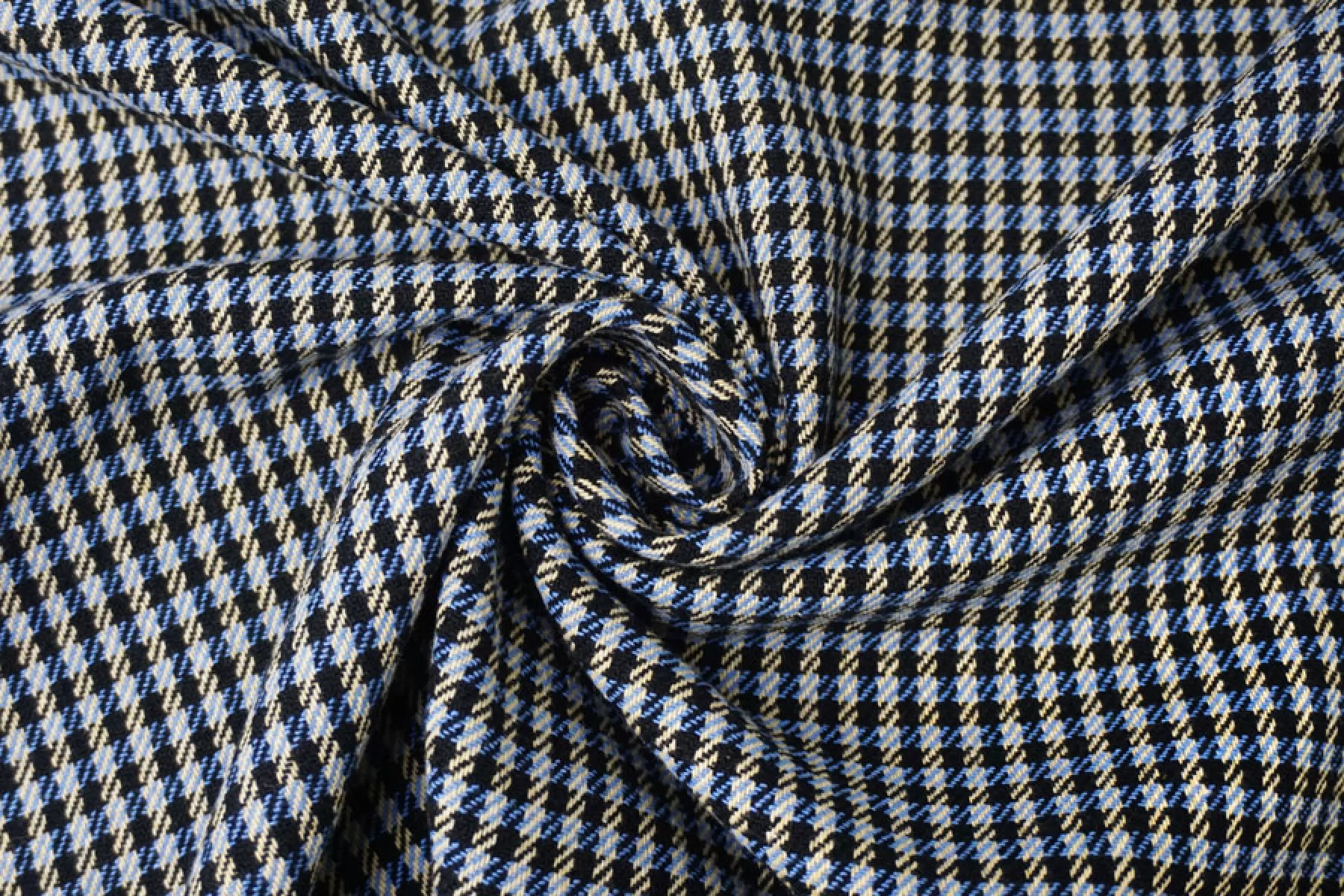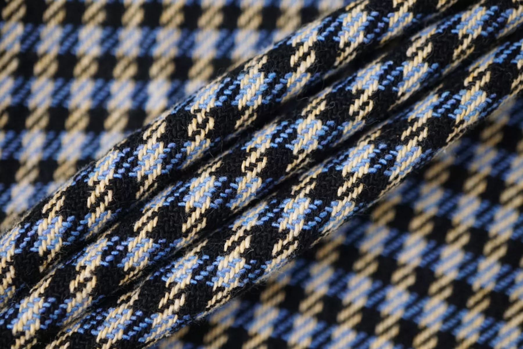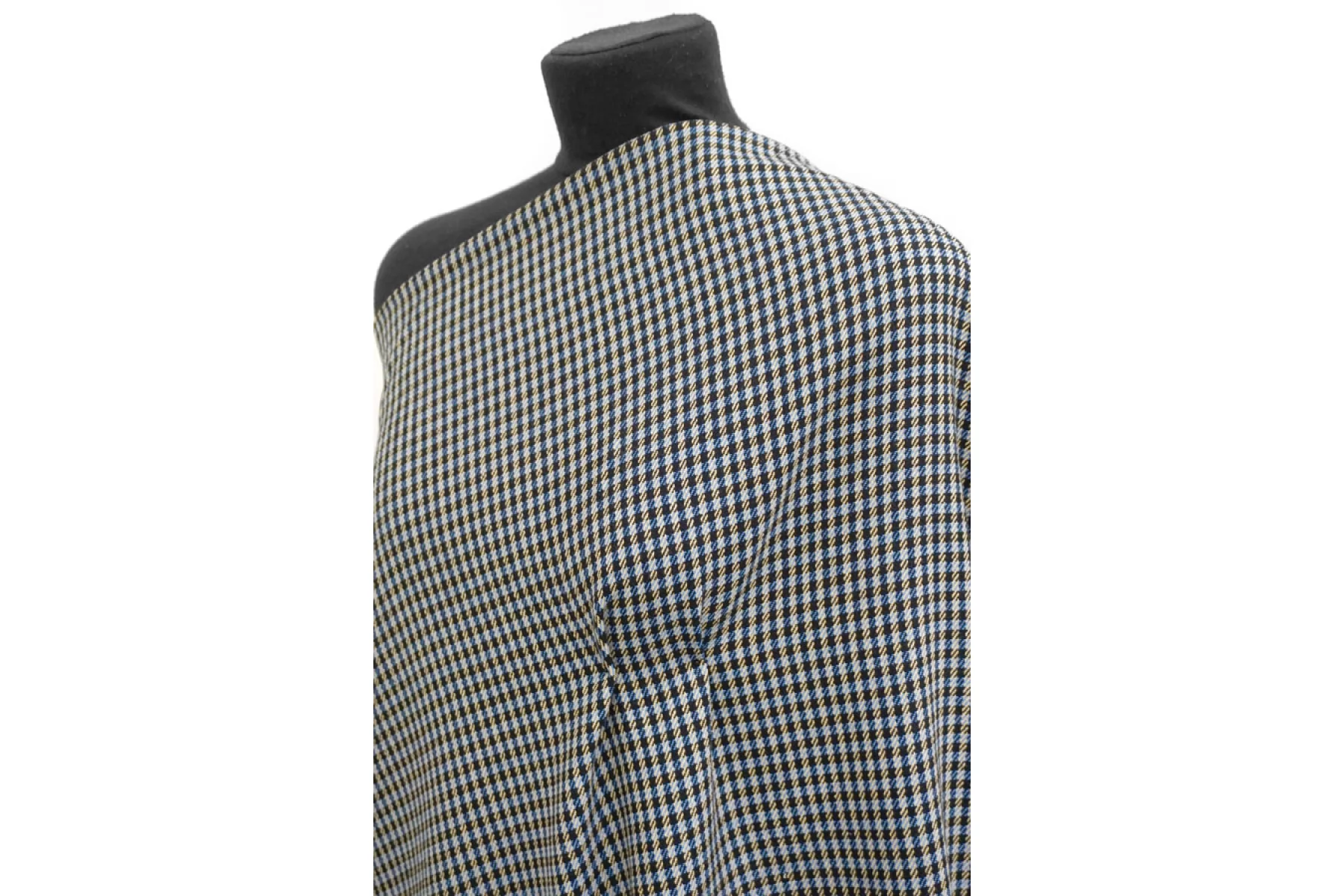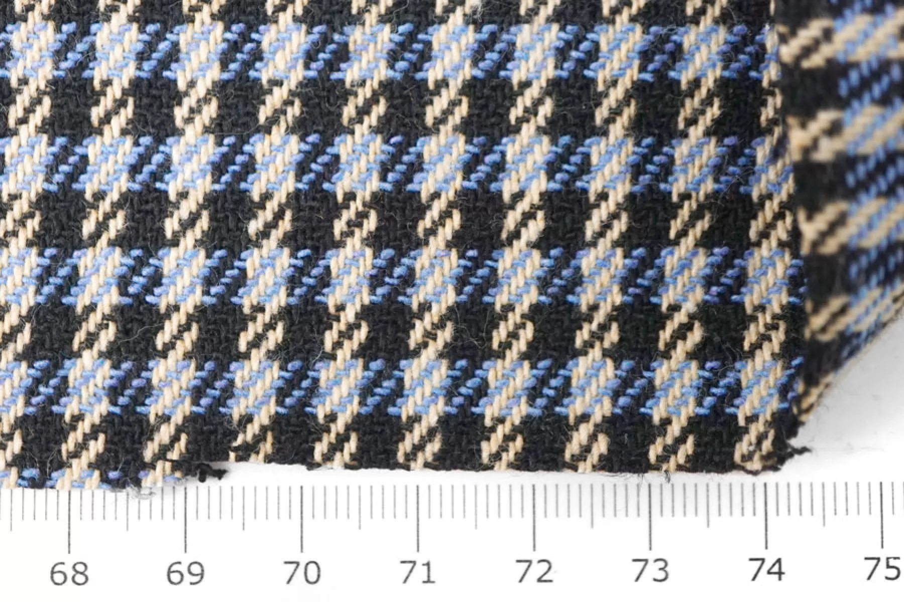 Отличный твид костюмной плотности в клетку переплетения нитей черного, бежевого и синего оттенков. Тактильно мягкий и приятный. Практически не мнется - восстанавливается. Не просвечивает. Пластичный. Неплохо пружинит за счет эластана. Хорошо драпируется и держит форму. Классно подойдет на костюмные варианты, юбки, жакеты, летние пальто и не только.