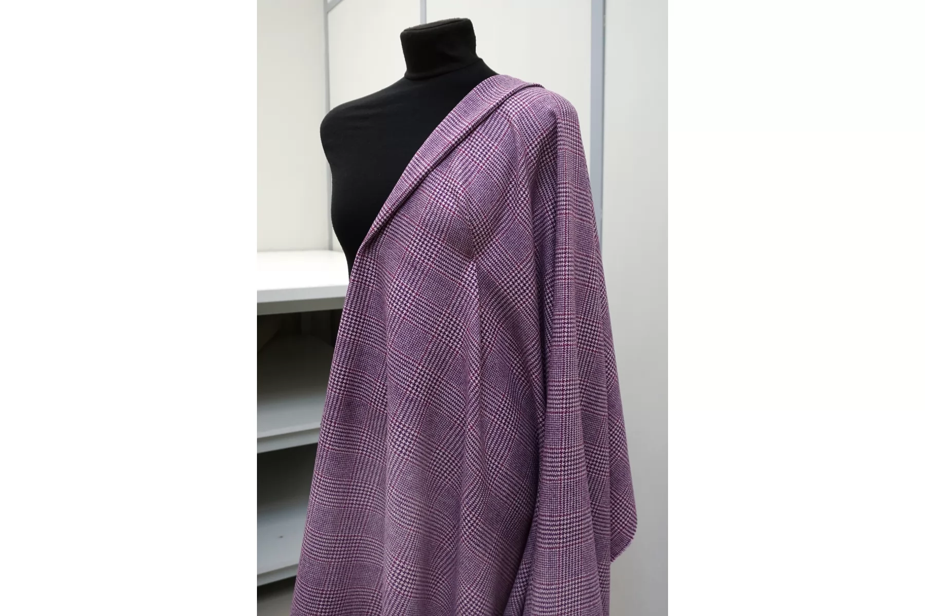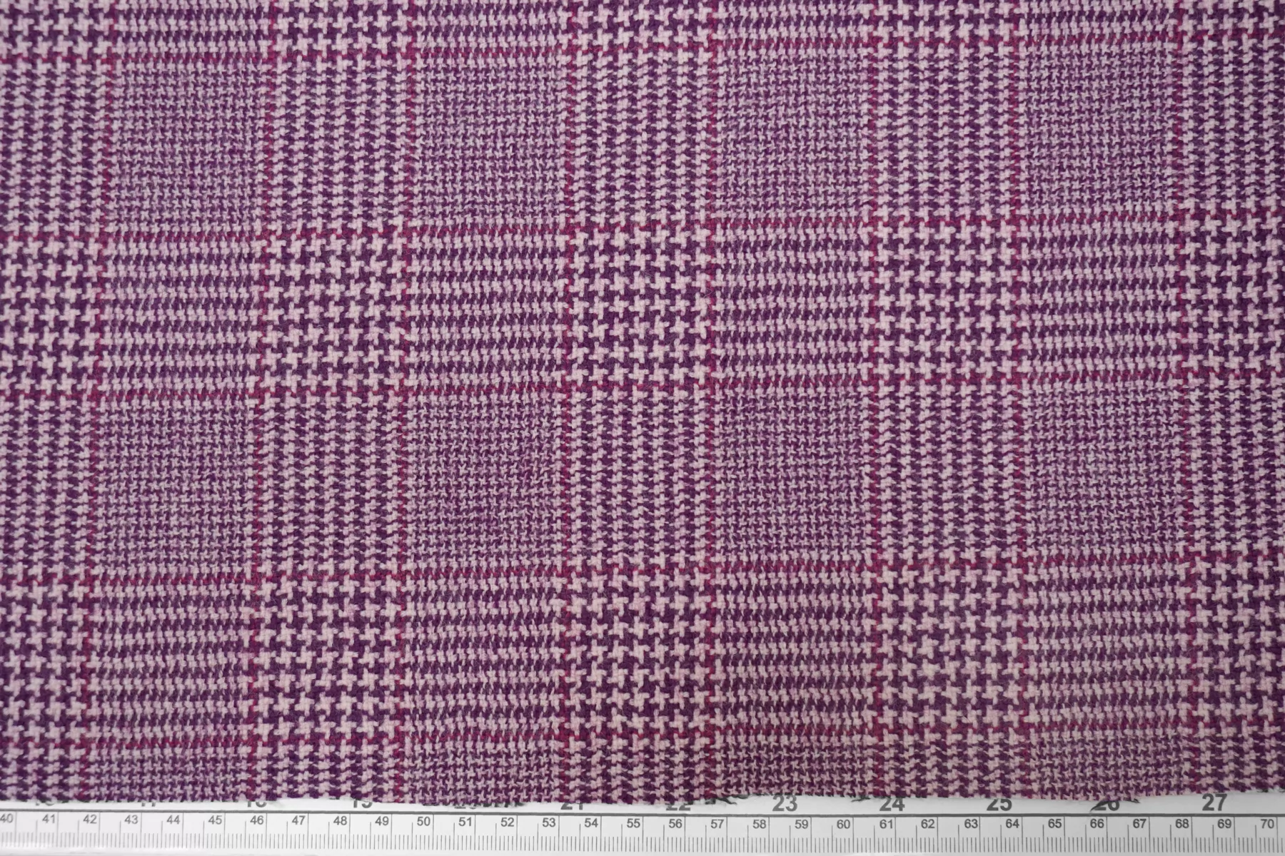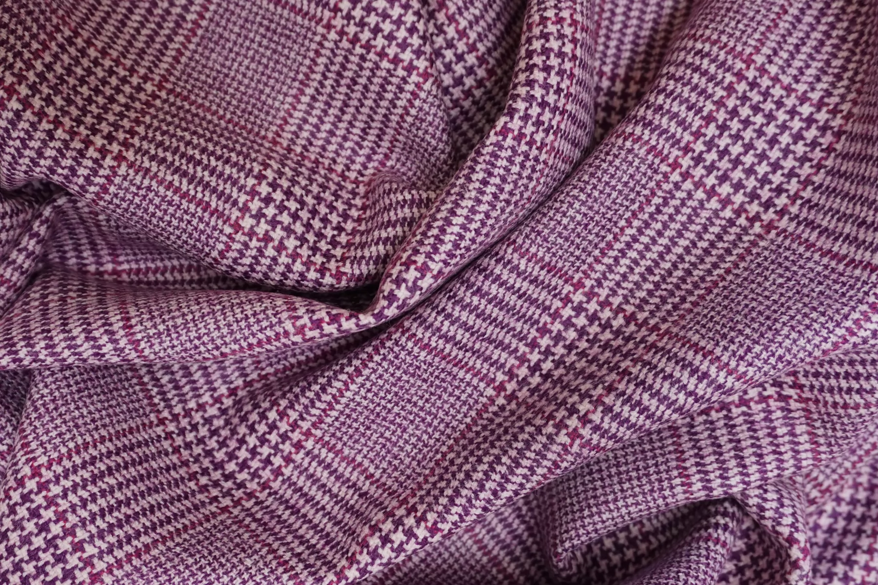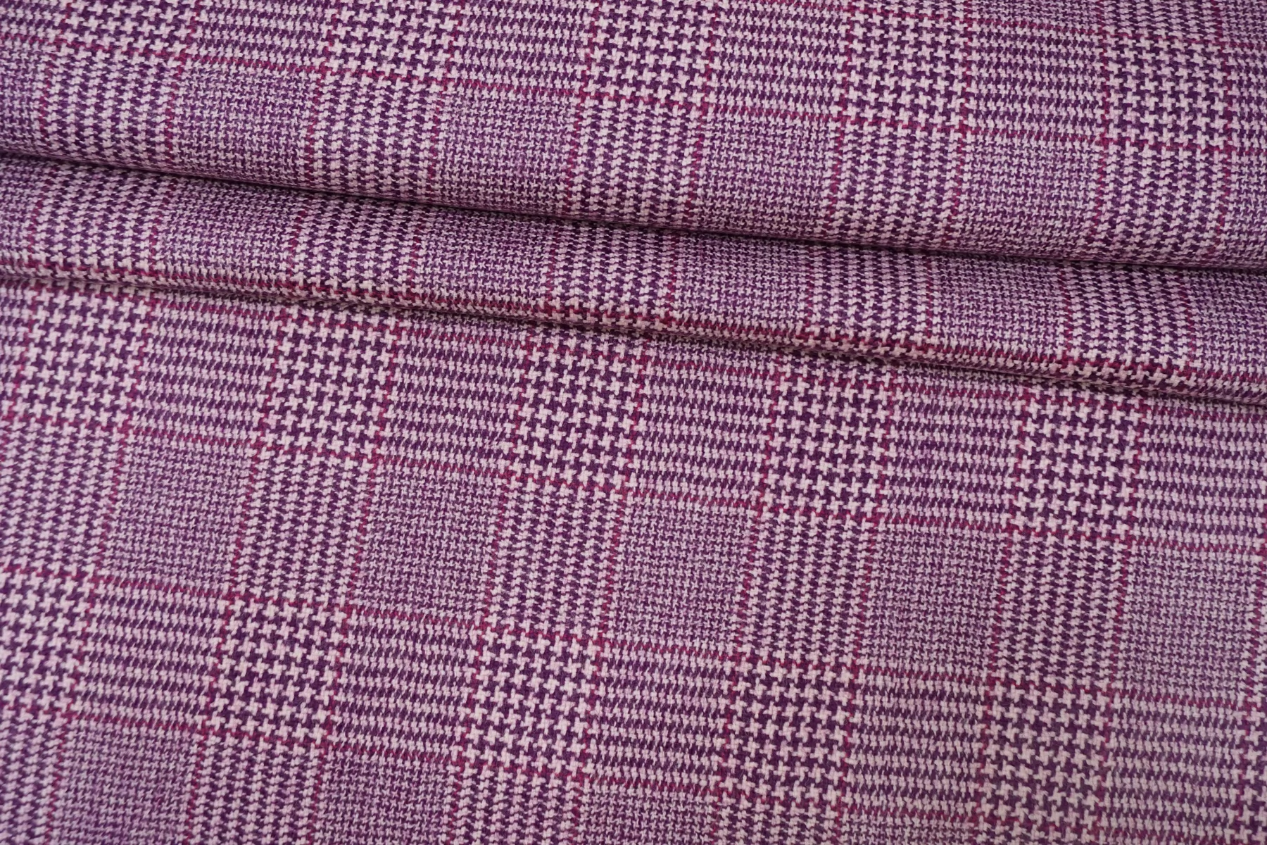 Присутствует едва заметная полоса (сдвиг в плетение), см. фото и видео. Классный шерстяной костюмный твид, узор гусиная лапка и клетка, нити цвета фуксии, фиолетовой фуксии и белого цвета. Тактильно мягкий и приятный, суховатый, колется. Не тянется. Не просвечивает. Не мнется. Пластичный но при этом держит форму. Шьем костюмы, юбки, брюки, или теплые куртки-рубашки верхнего слоя. Уход деликатный.
