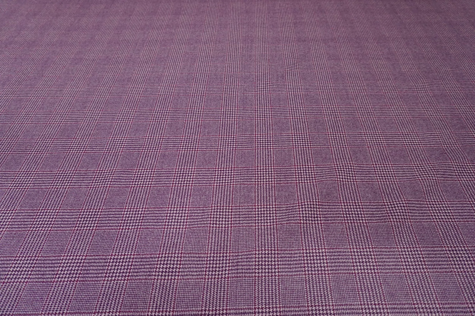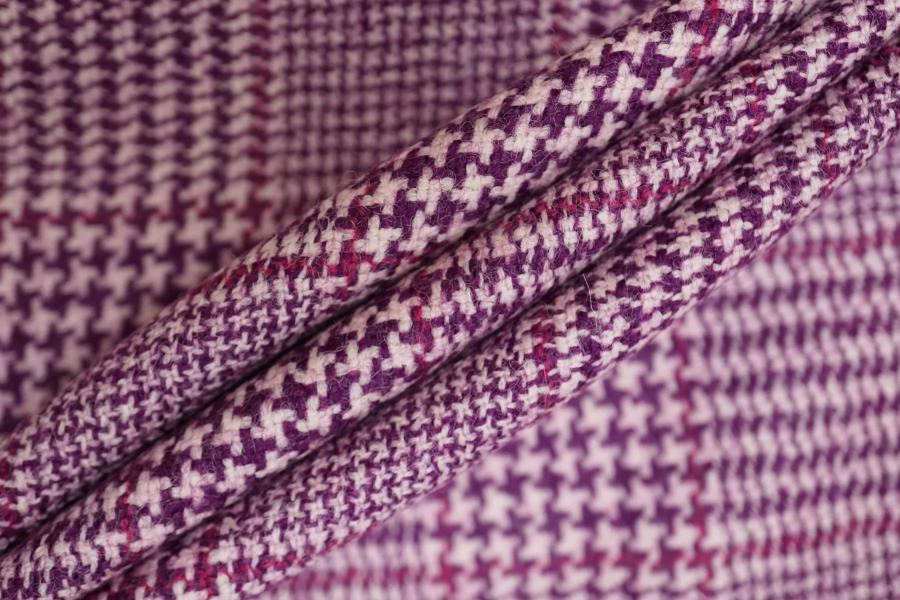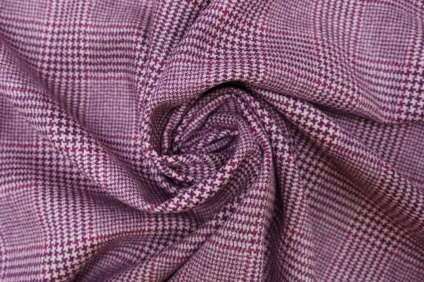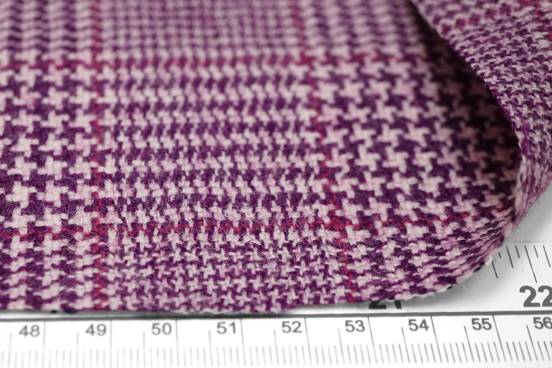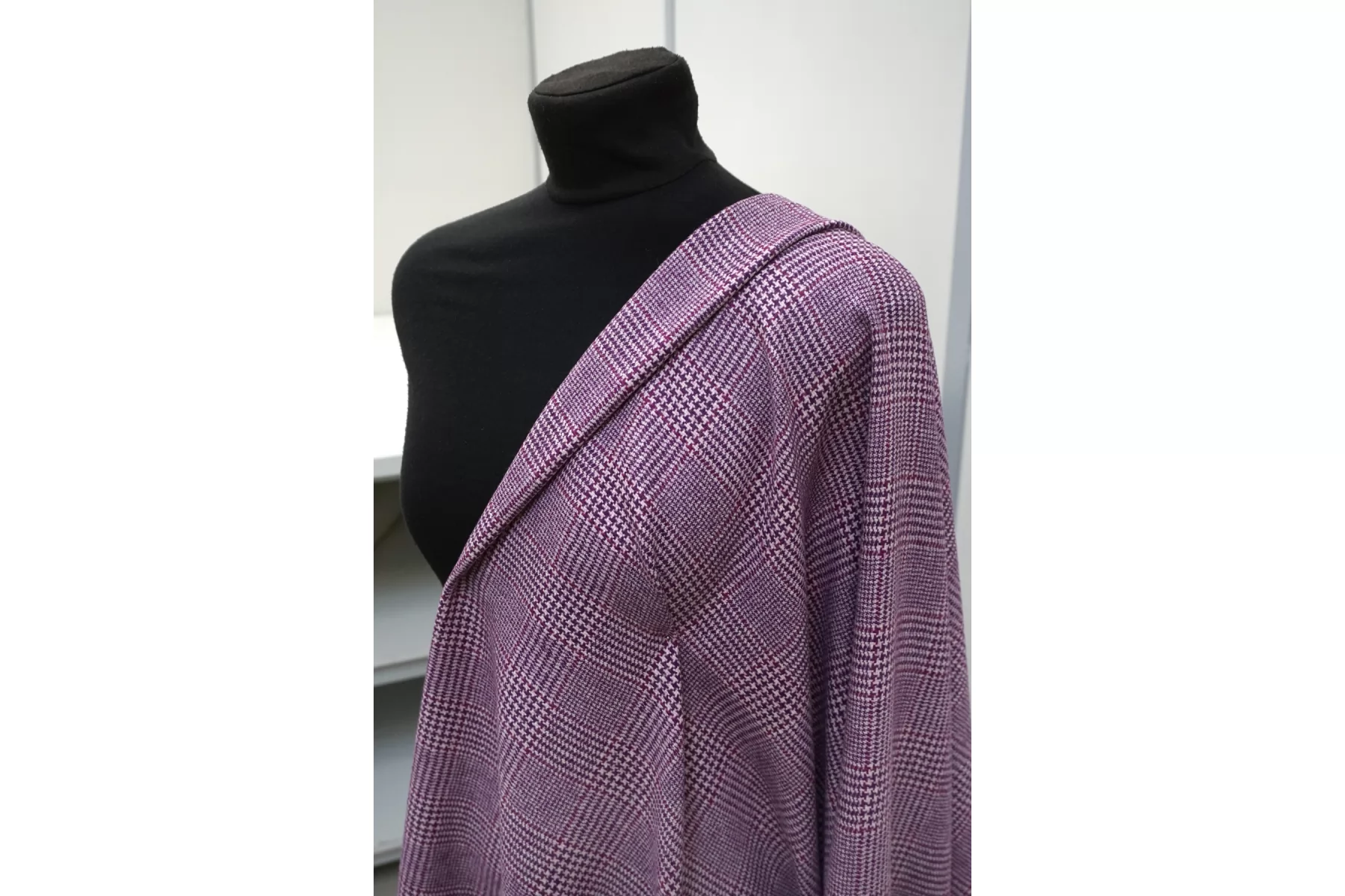 Присутствует едва заметная полоса (сдвиг в плетение), см. фото и видео. Классный шерстяной костюмный твид, узор гусиная лапка и клетка, нити цвета фуксии, фиолетовой фуксии и белого цвета. Тактильно мягкий и приятный, суховатый, колется. Не тянется. Не просвечивает. Не мнется. Пластичный но при этом держит форму. Шьем костюмы, юбки, брюки, или теплые куртки-рубашки верхнего слоя. Уход деликатный.