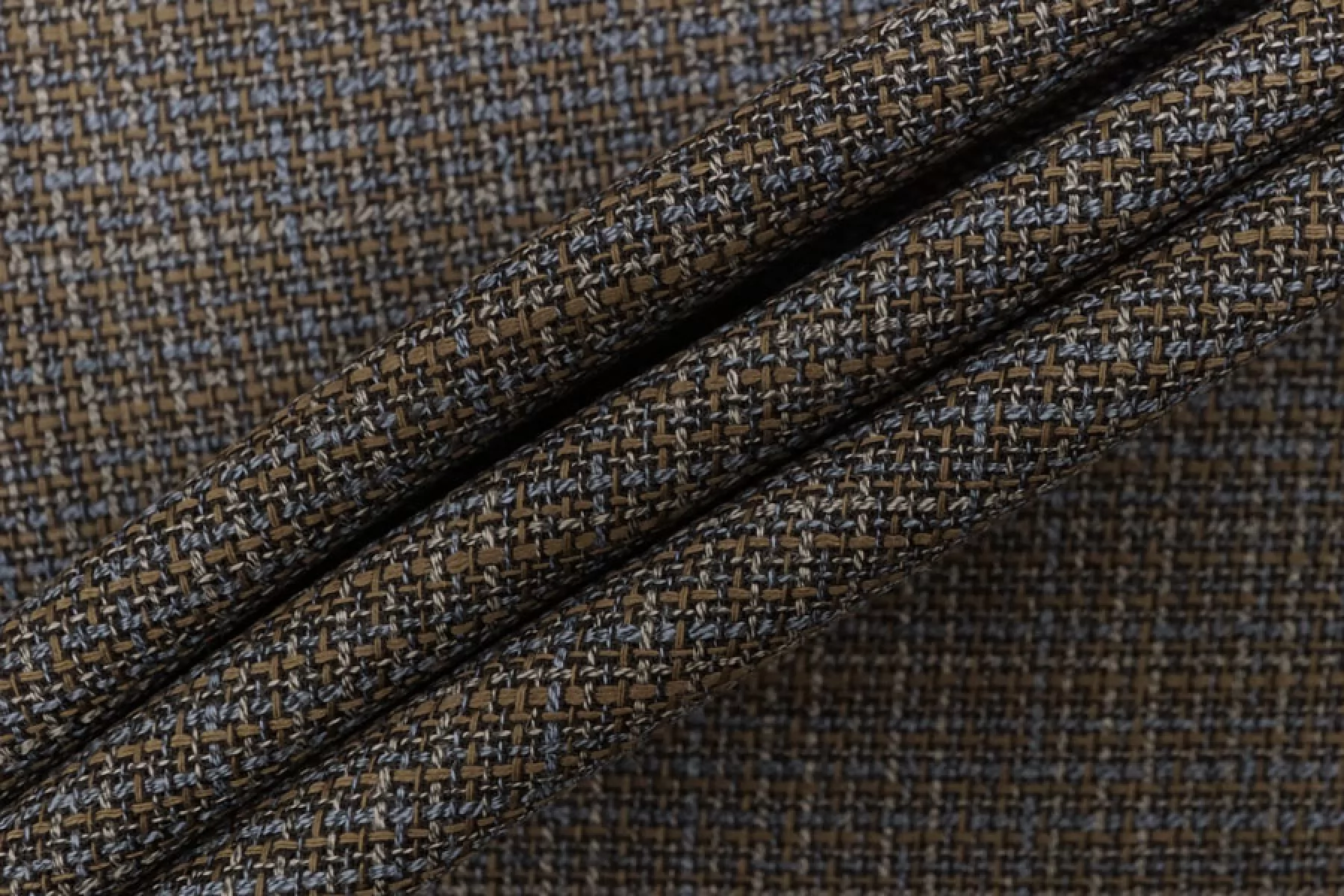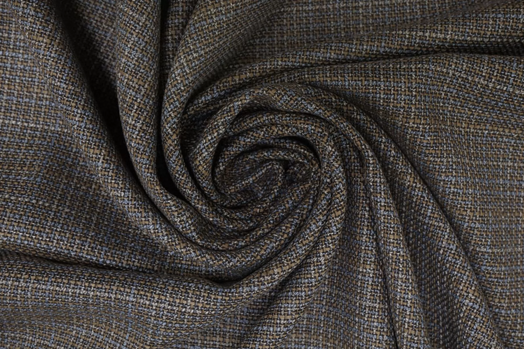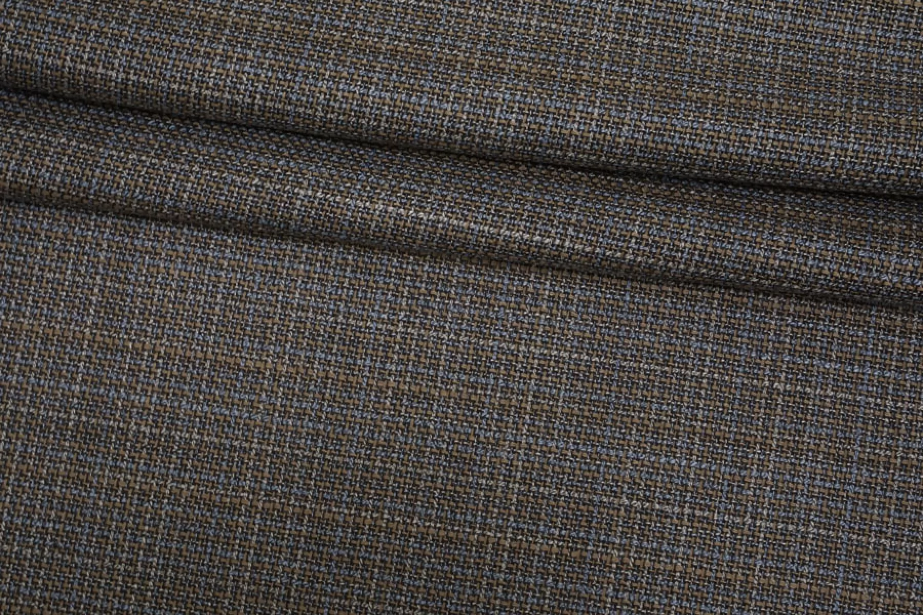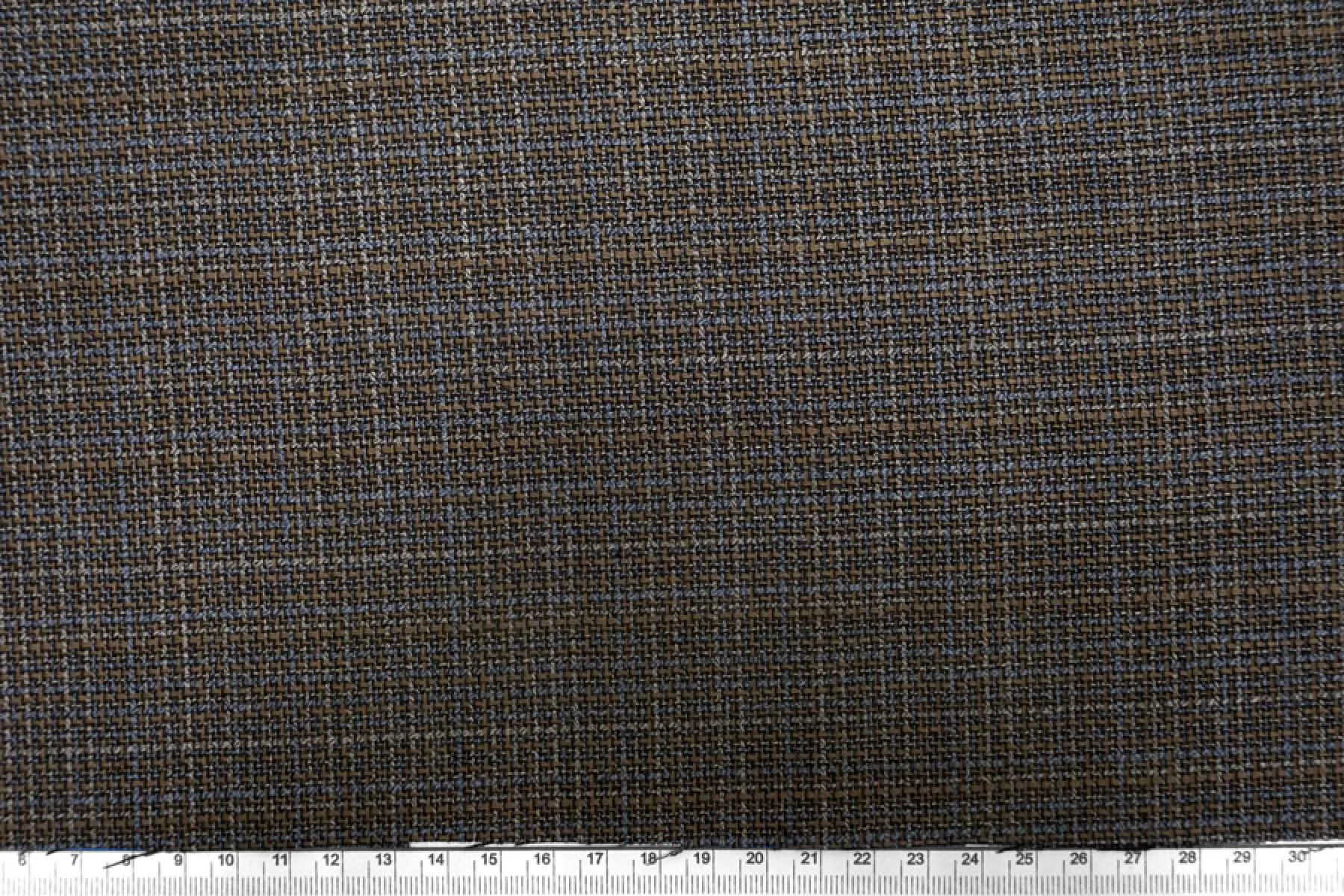 Прекрасный костюмно-плательный твид из вирджинской шерсти, нити тёмно-коричневого, серого, серо-голубого и светло-коричневого цвета. Тактильно гладкая ткань, плотная, но достаточно тонкая. Чувствуется, что есть шерсть, при этом не колется. Немного тянется, слегка просвечивает в дырочки плетения. Хорошо драпируется и немного держит форму. Не мнется. Отличный вариант на костюмы, жакеты, платья, брюки и не только. Уход за материалом деликатный.