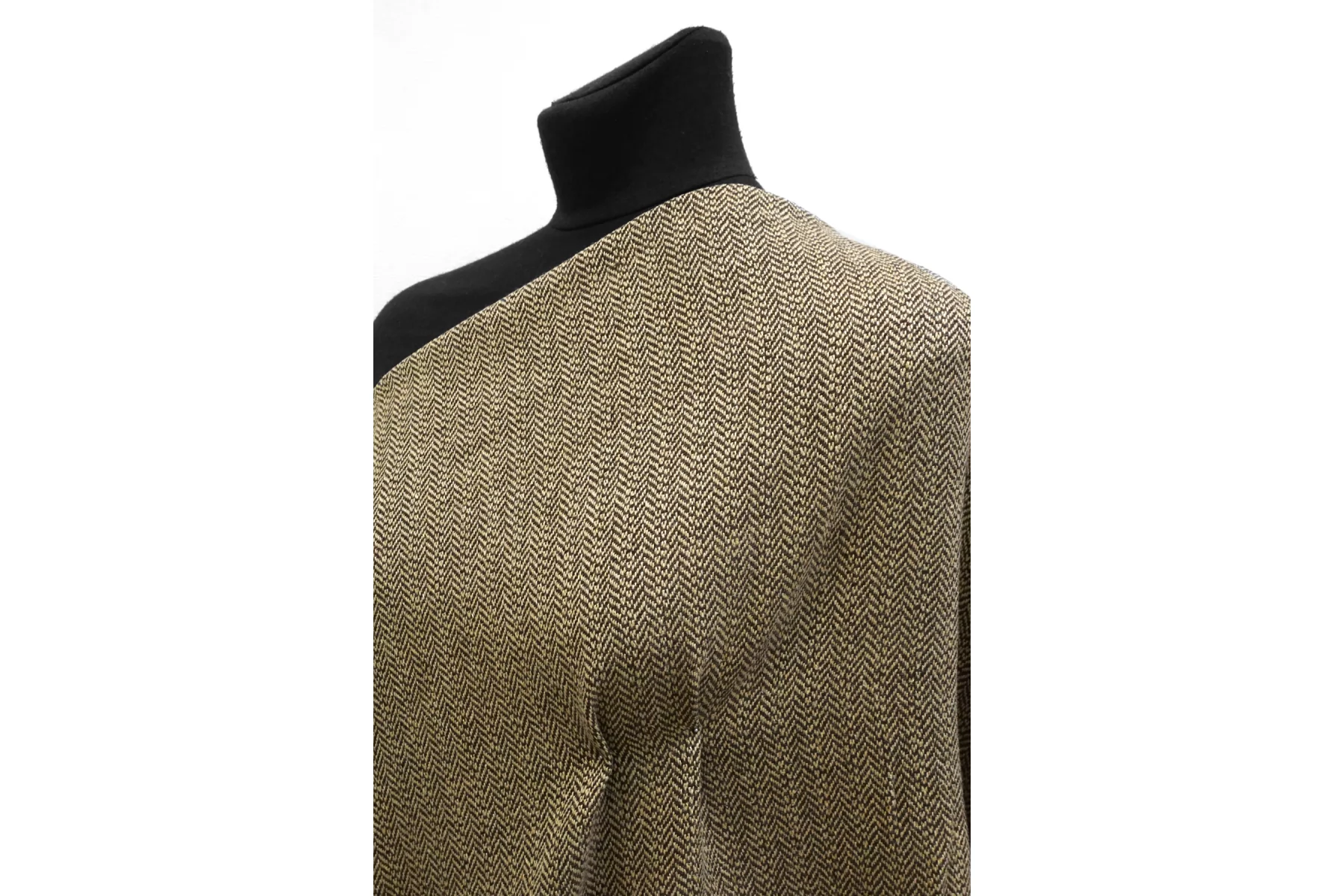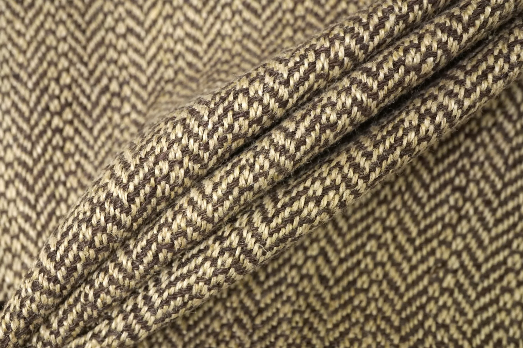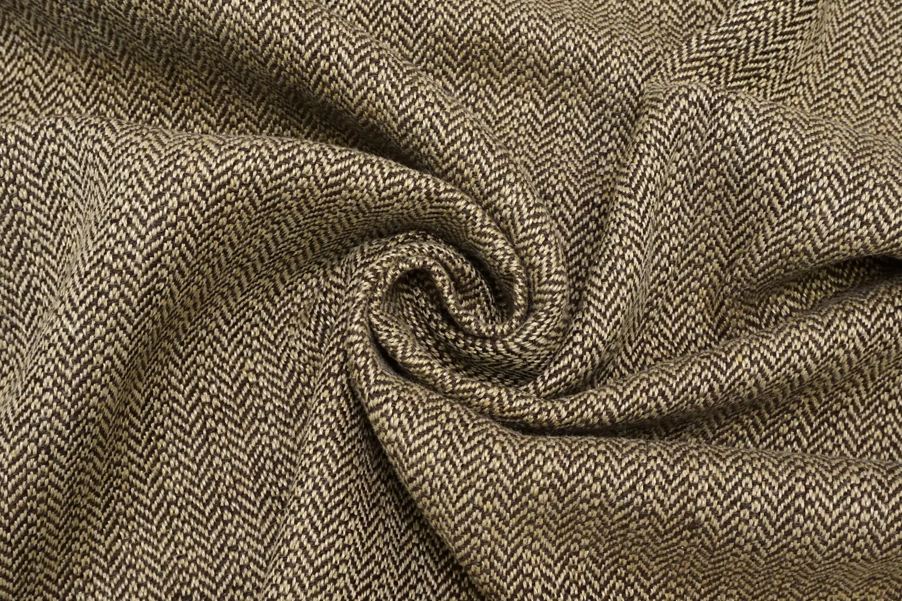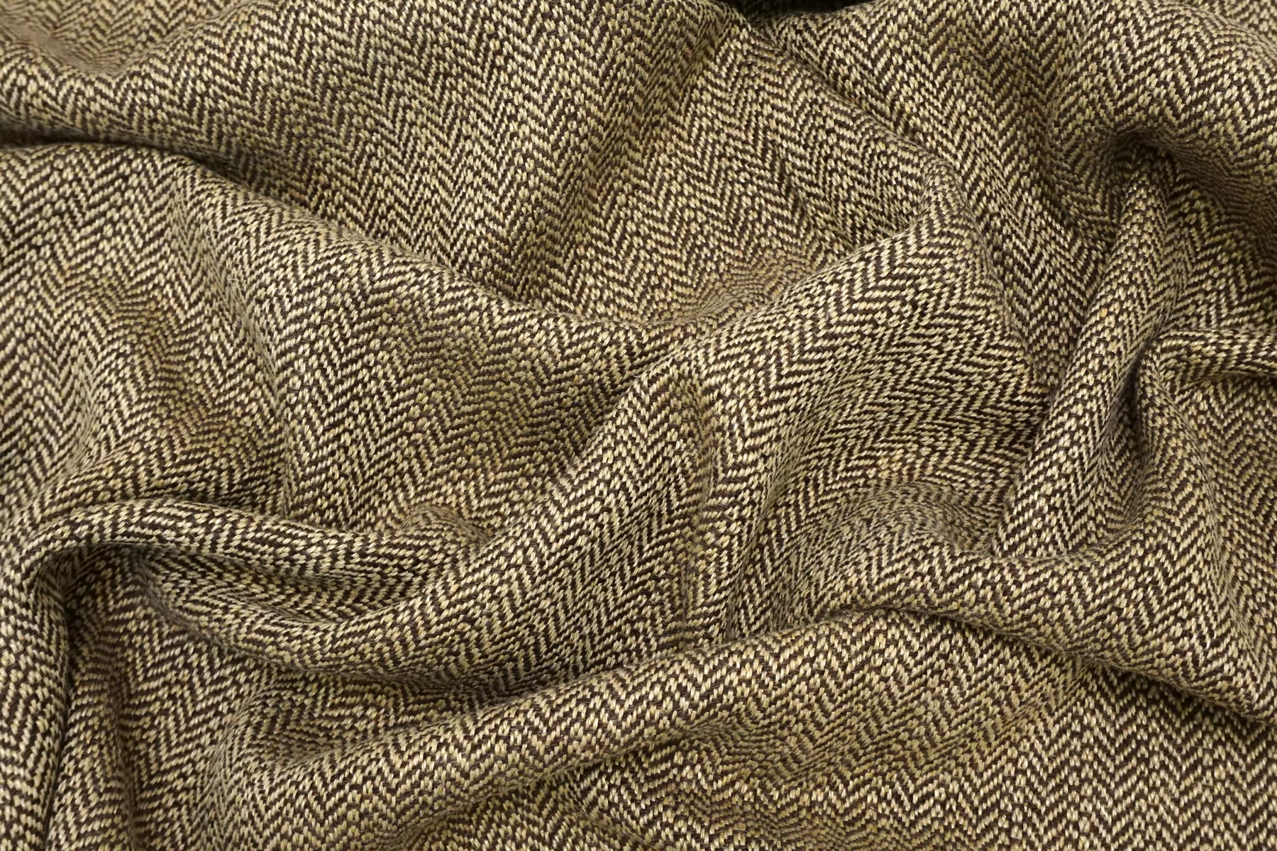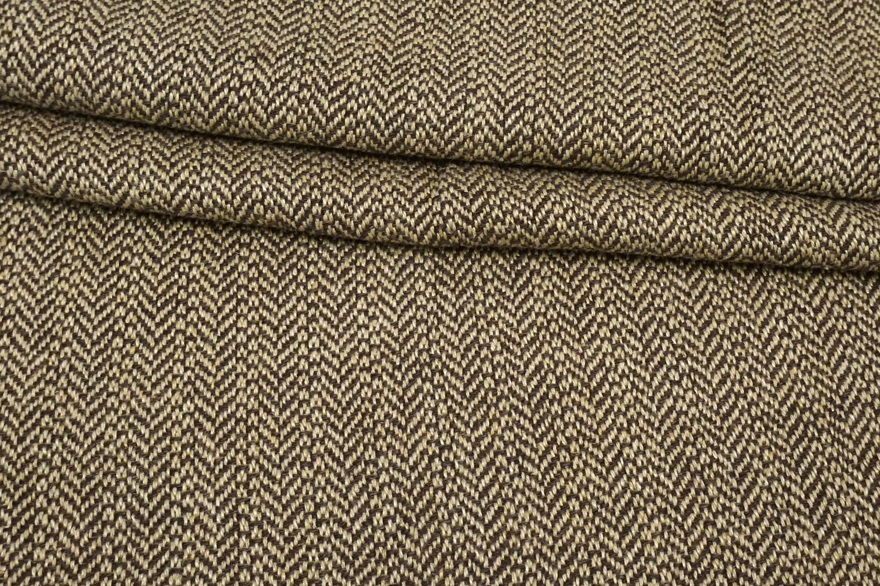 Прекрасный льняной твид с шелком от бренда Ralph Lauren в елочку из переплетения нитей коричневого и песочного оттенка. Суховатый и приятный наощупь. Немного чувствуется фактура. Не тянется. Форму держит. Не просвечивает. Пластичный. Отличный вариант на летние костюмы, жакеты, юбки, платья. Уход деликатный.