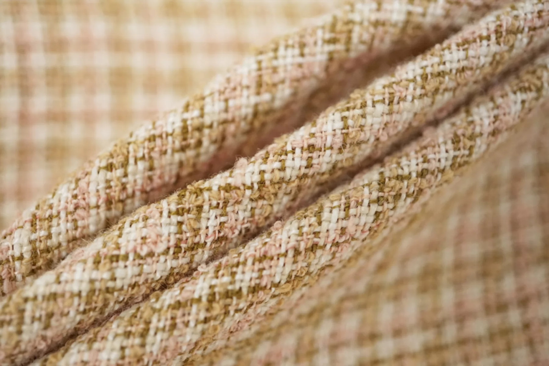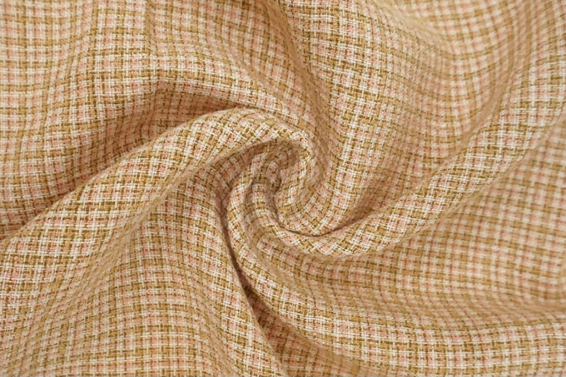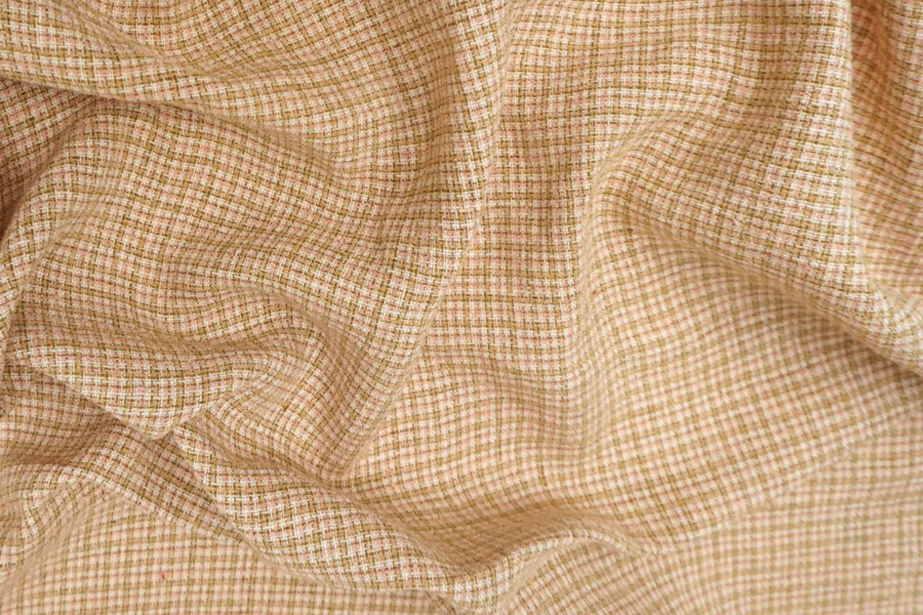 Очень классный костюмно-плательный льняной твид в некрупную клетку, которую образует переплетение нитей оливкового, кораллового и молочного. Материал тактильно мягкий, но шероховатый. Не тянется. Плетение слегка разряженное, за счет чего на просвет слегка заметен силуэт. Неплохо драпируется и немного держит форму. Немного сминается. Отличный вариант для пошива жакета, костюма, летнего пальто, юбки и не только.