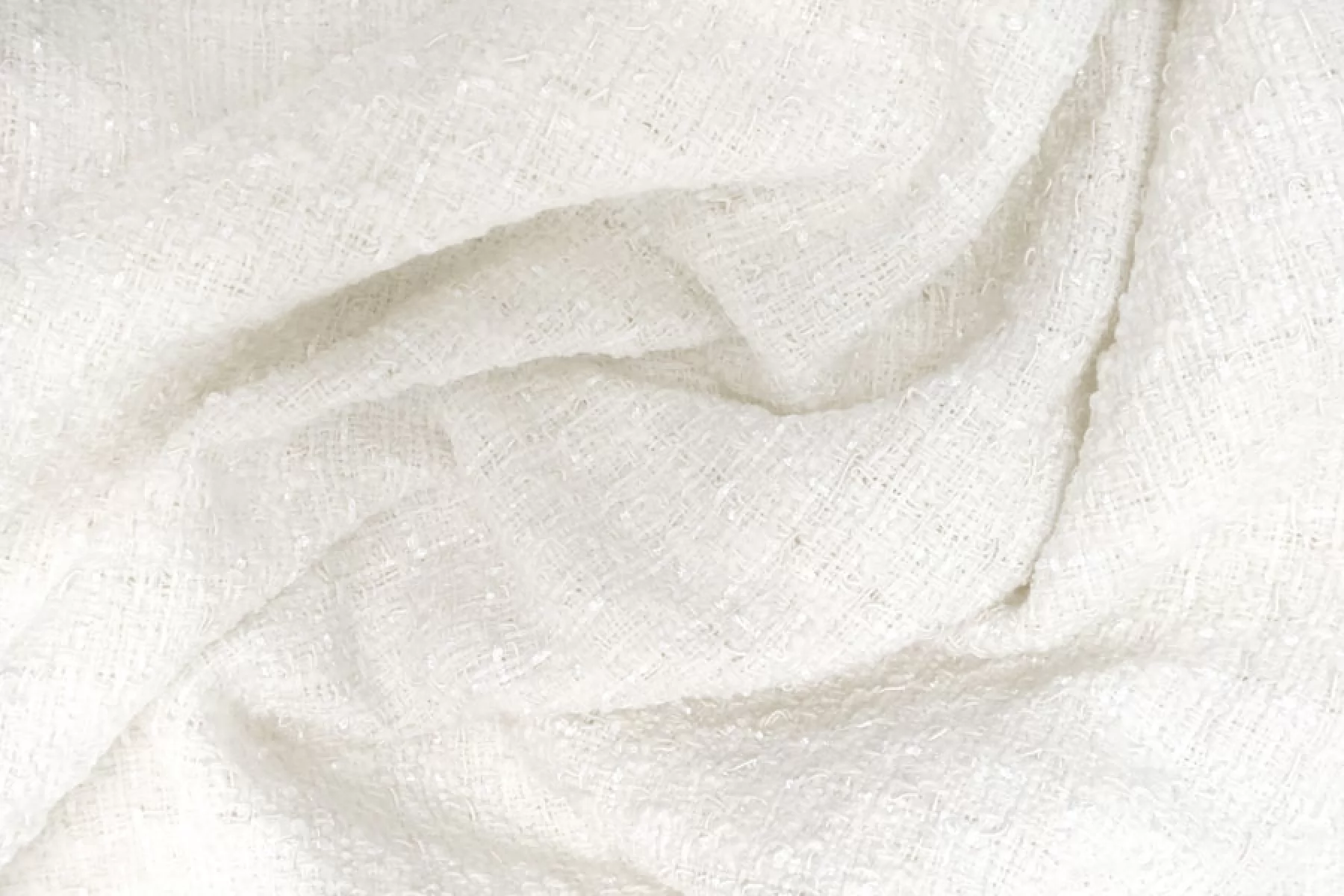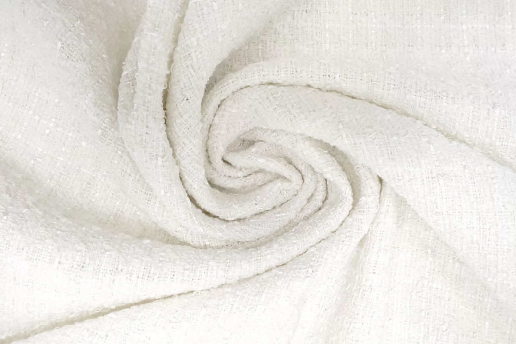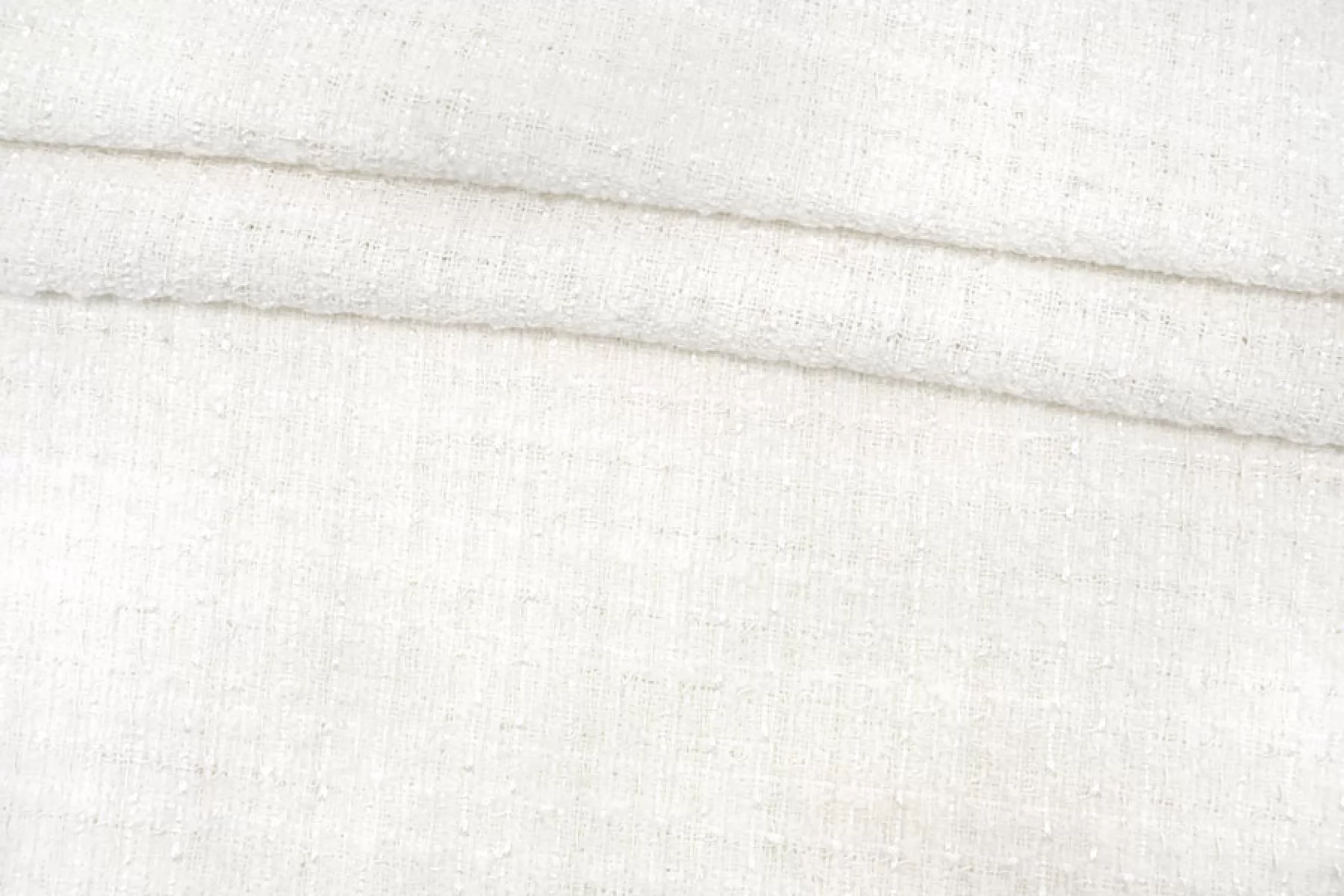 Прекрасный хлопковый твид в в молочном оттенке с добавлением блестящих нитей. Тактильно немного грубоватый, чувствуется фактура плетения. Плетение не плотное, немного просвечивает. Немного тянется. Не мнется. Форму держит, довольно пластичный. Классный вариант на летние пальто, жакеты, костюмные варианты, платья и не только. А благодаря блестящим нитям подойдет и на нарядные варианты. При необходимости используйте подкладочный материал