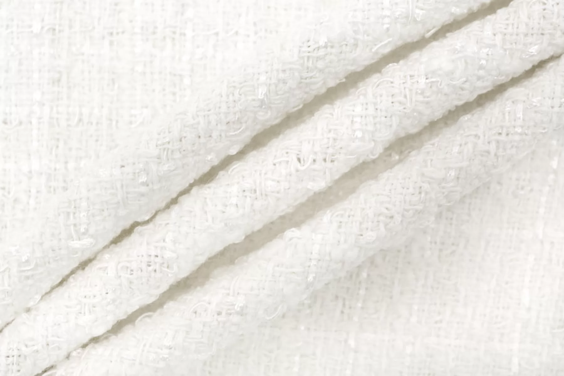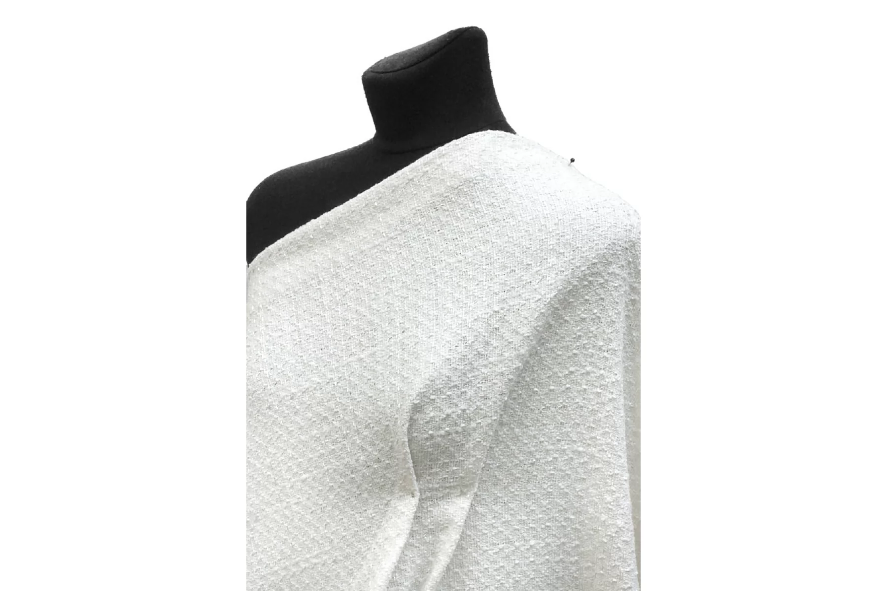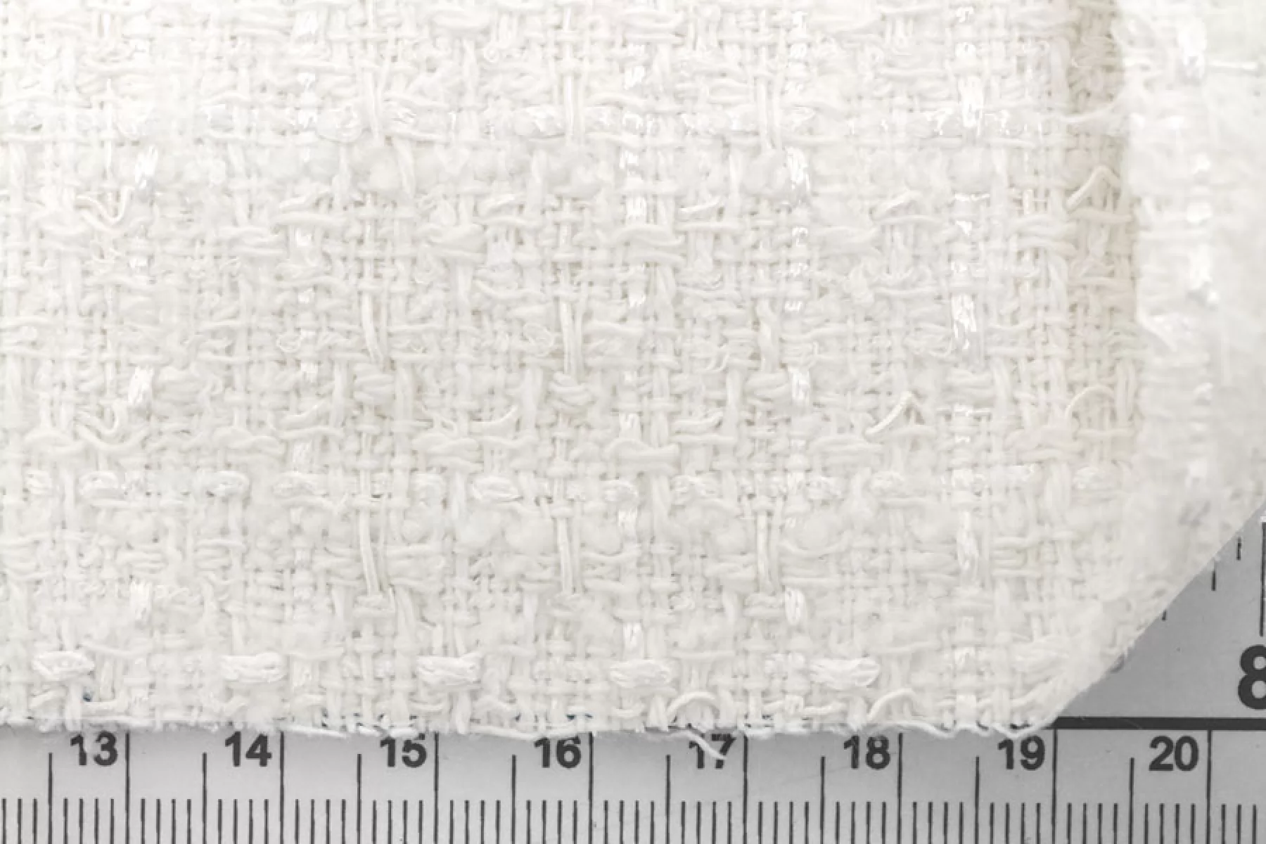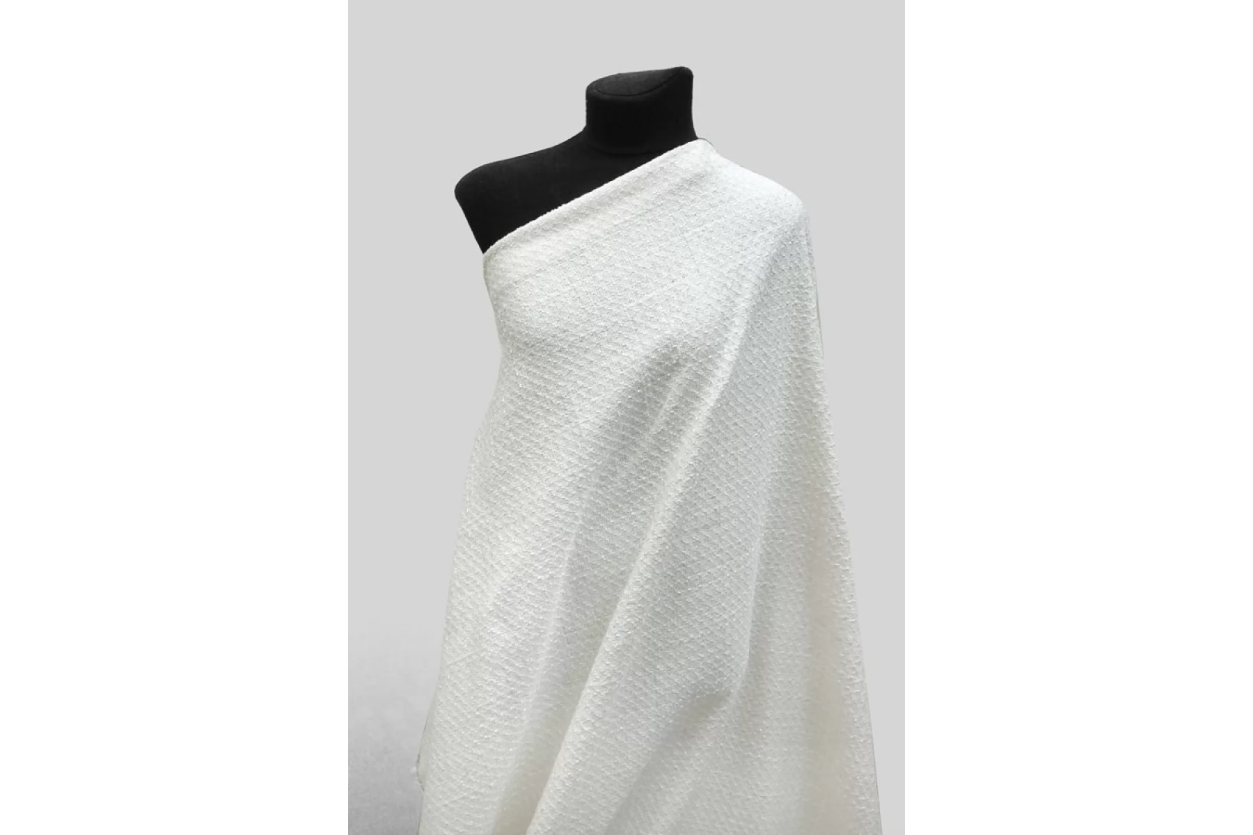 Прекрасный хлопковый твид в в молочном оттенке с добавлением блестящих нитей. Тактильно немного грубоватый, чувствуется фактура плетения. Плетение не плотное, немного просвечивает. Немного тянется. Не мнется. Форму держит, довольно пластичный. Классный вариант на летние пальто, жакеты, костюмные варианты, платья и не только. А благодаря блестящим нитям подойдет и на нарядные варианты. При необходимости используйте подкладочный материал