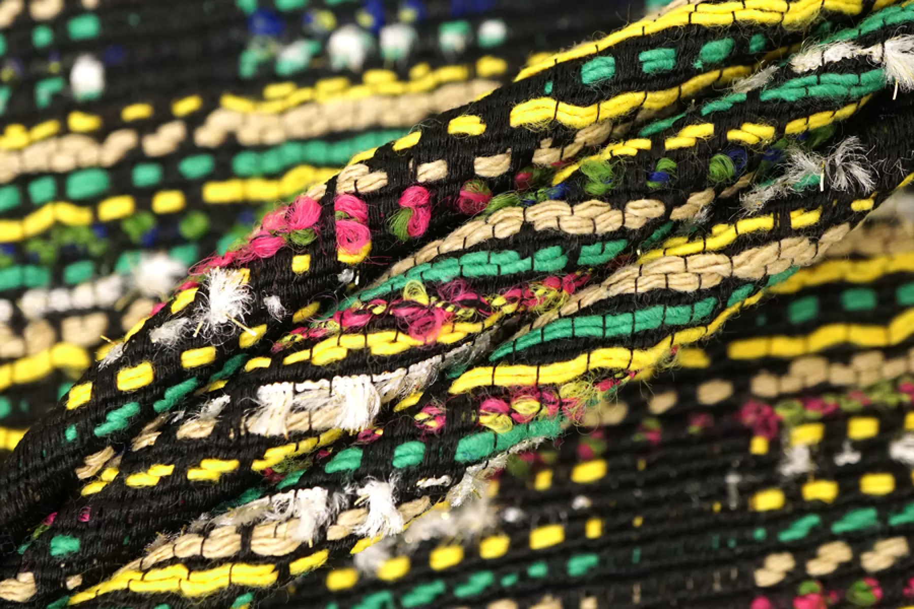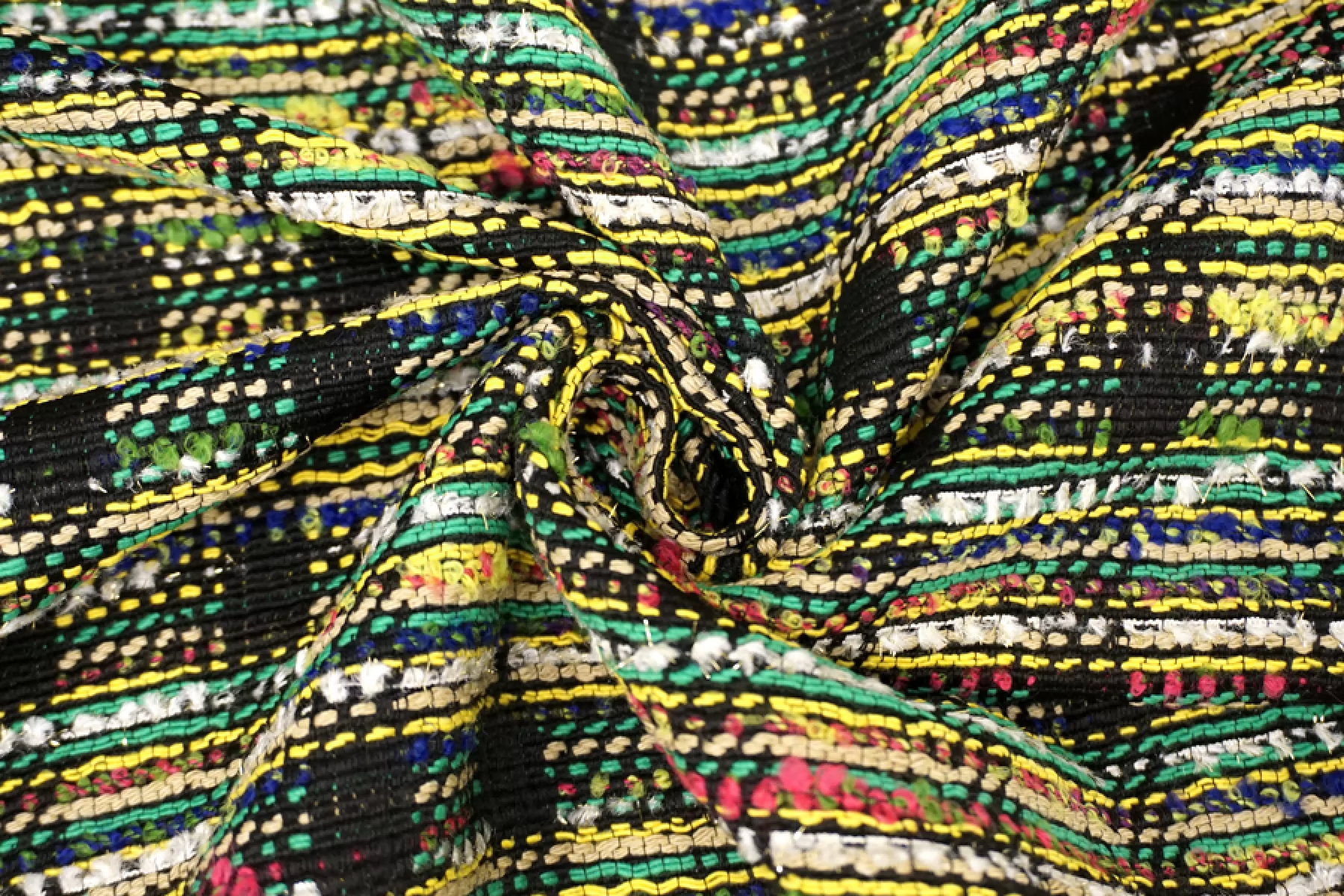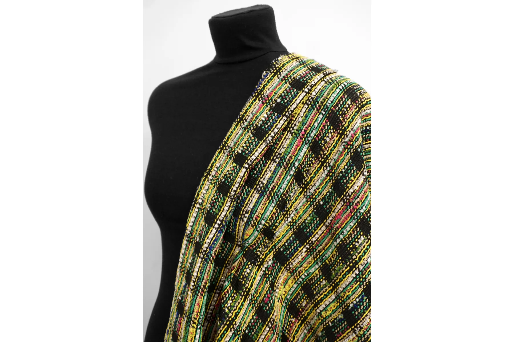 Смесовый твид-шанель, пестротканнный, с рисунком в клеточку, который образует переплетение нитей оттенков черного, желтого, зеленых, бежевого,розового , молочного и синего. Отлично подойдет для демисезонного гардероба. Тактильно шероховатый, мягкий. Слегка рыхловат в плетении. Не тянется. За счет плетения немного заметен силуэт. Хорошо драпируется и немного держит форму. Прекрасный вариант на костюмы, юбки и жакеты. При необходимости используйте подкладочный материал.