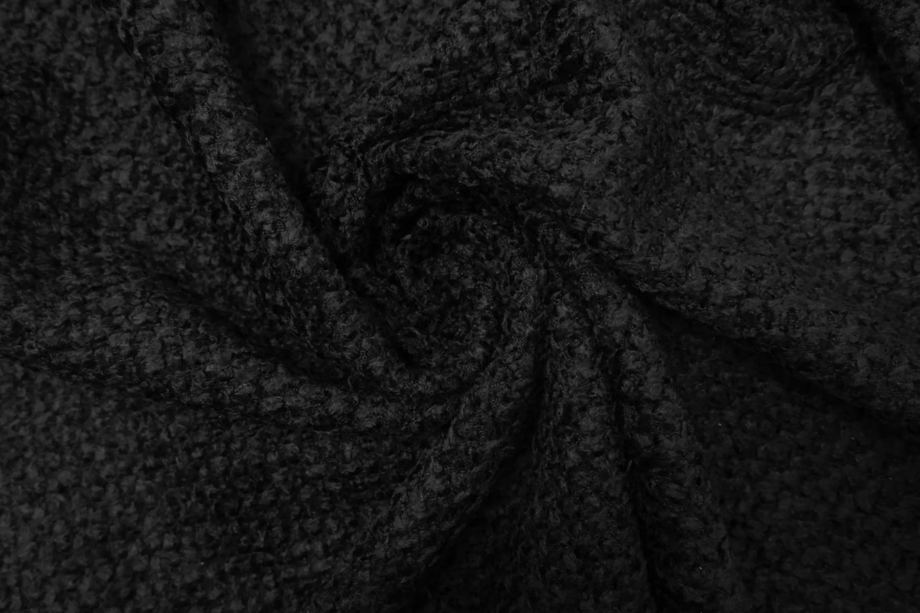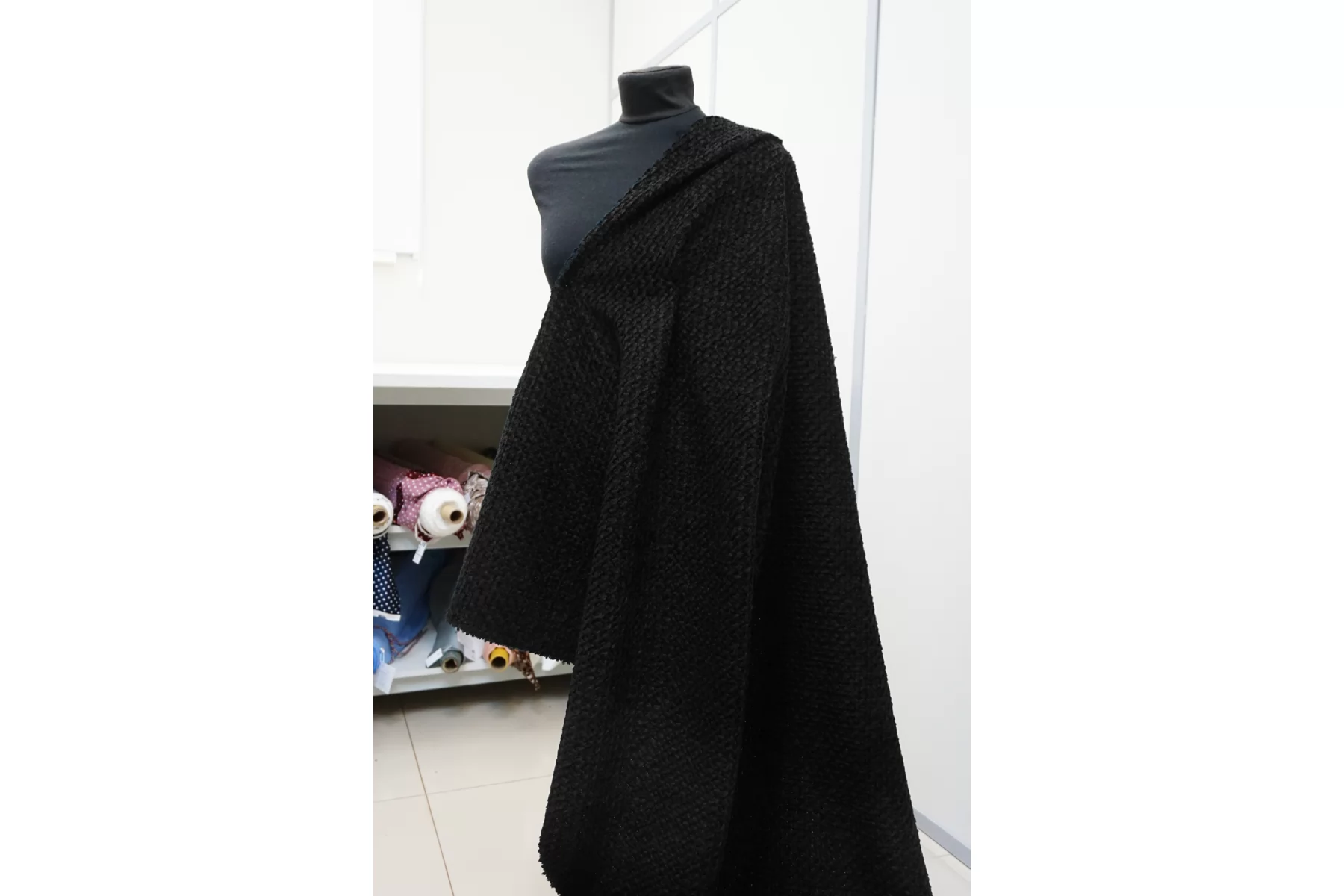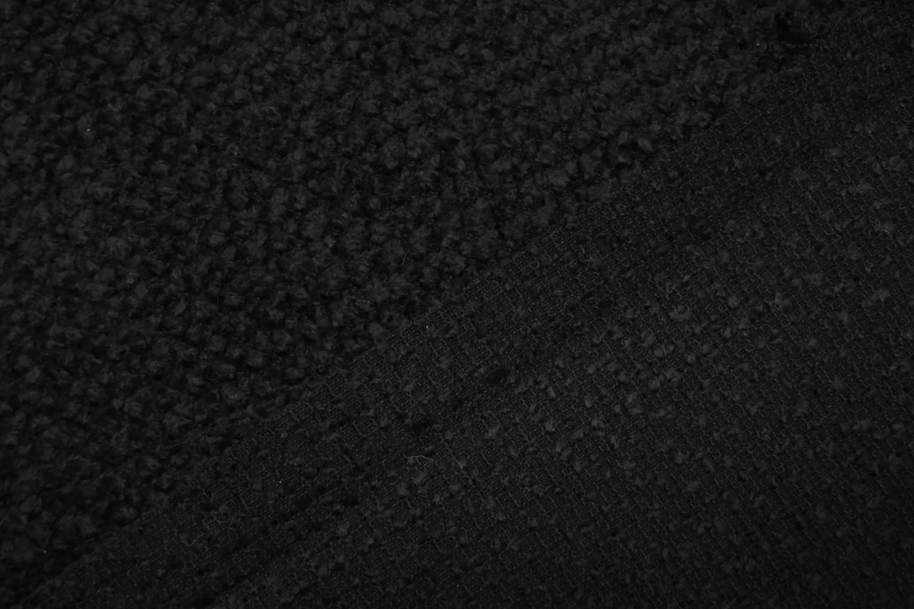 Прекрасный шерстяной твид шанель от модного дома Chanel, черного цвета, с добавкой акрила. Вплетена ворсовая нить, которая добавляет объема и фактурности. Не тянется. Слегка просвечивает в дырочки плетения. Примерно 2,5 мм толщиной. Не мнется. Держит форму и умеренный по пластичности. Прекрасно подойдет на костюмные варианты, жакеты, юбки. Уход деликатный.
