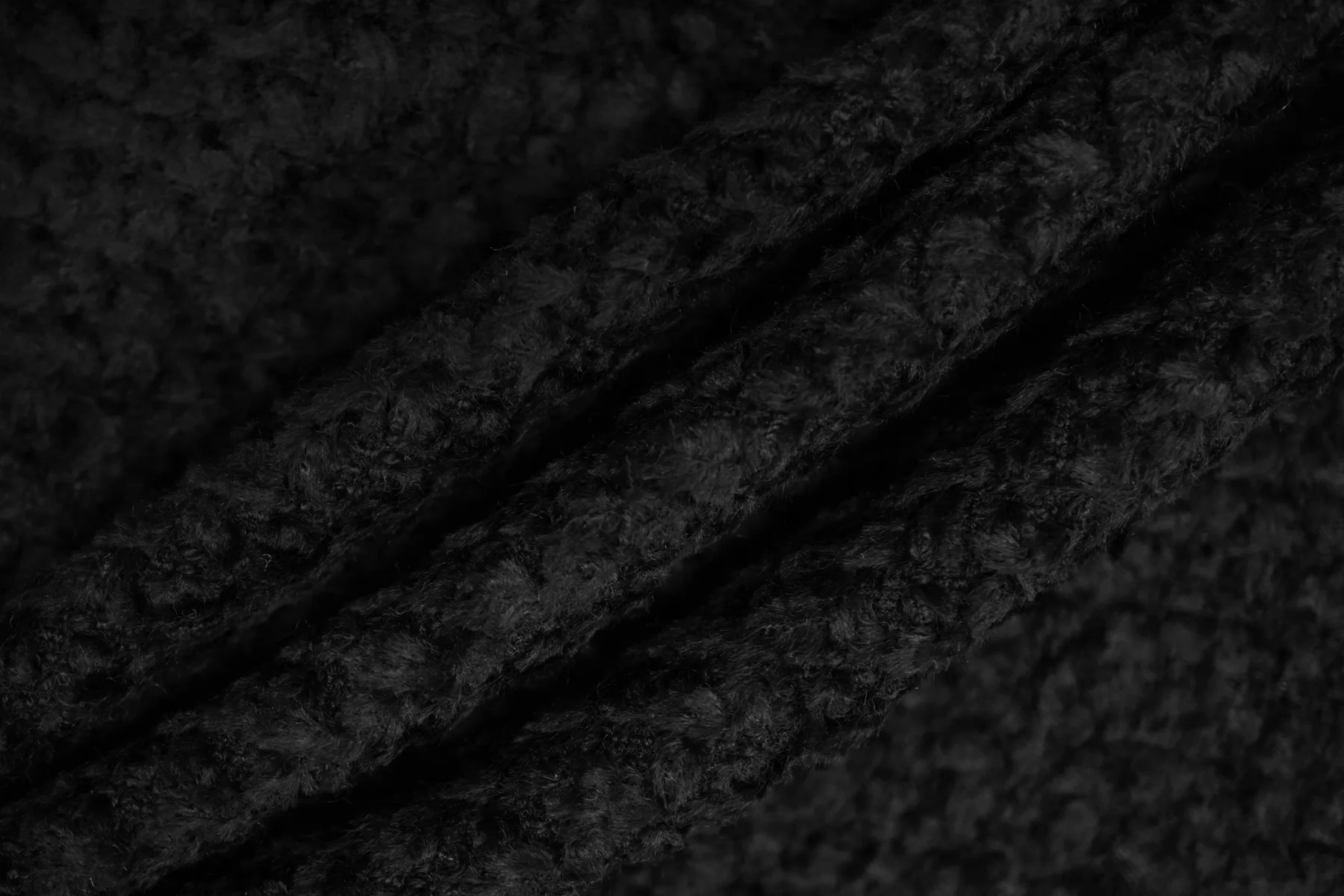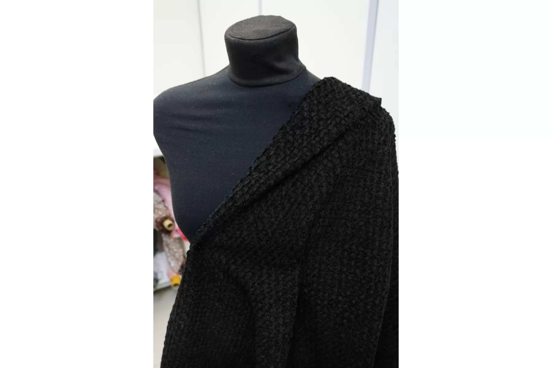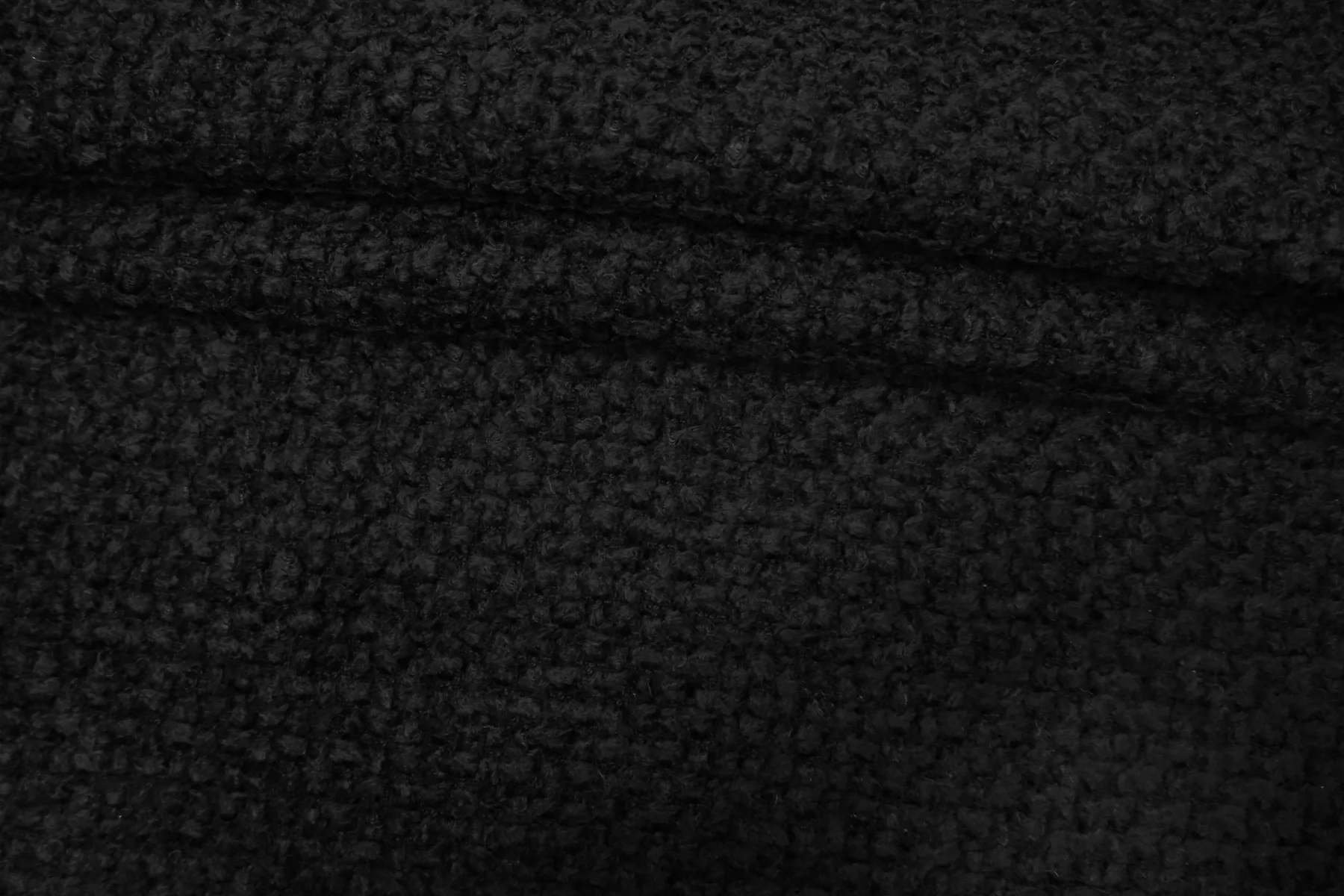 Прекрасный шерстяной твид шанель от модного дома Chanel, черного цвета, с добавкой акрила. Вплетена ворсовая нить, которая добавляет объема и фактурности. Не тянется. Слегка просвечивает в дырочки плетения. Примерно 2,5 мм толщиной. Не мнется. Держит форму и умеренный по пластичности. Прекрасно подойдет на костюмные варианты, жакеты, юбки. Уход деликатный.