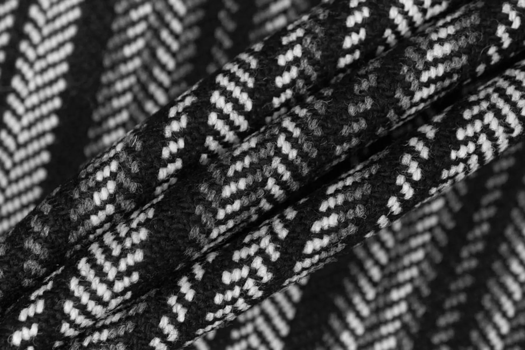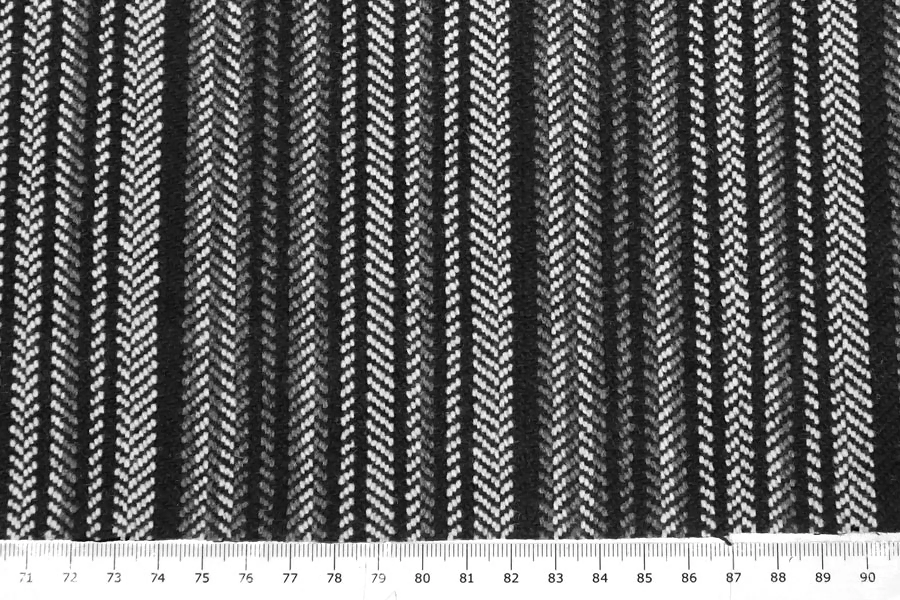 Очень красивый шерстяной твид переплетения черных, серых и белых нитей в елочку. Тактильно шероховатый, колючий. Суховатый. Плотный, 1 мм толщиной. Немного пластичный и немного держит форму. Не мнется, не просвечивает и не тянется. Прекрасно подойдет на костюмы, жакеты, юбки и не только. Уход - деликатный.