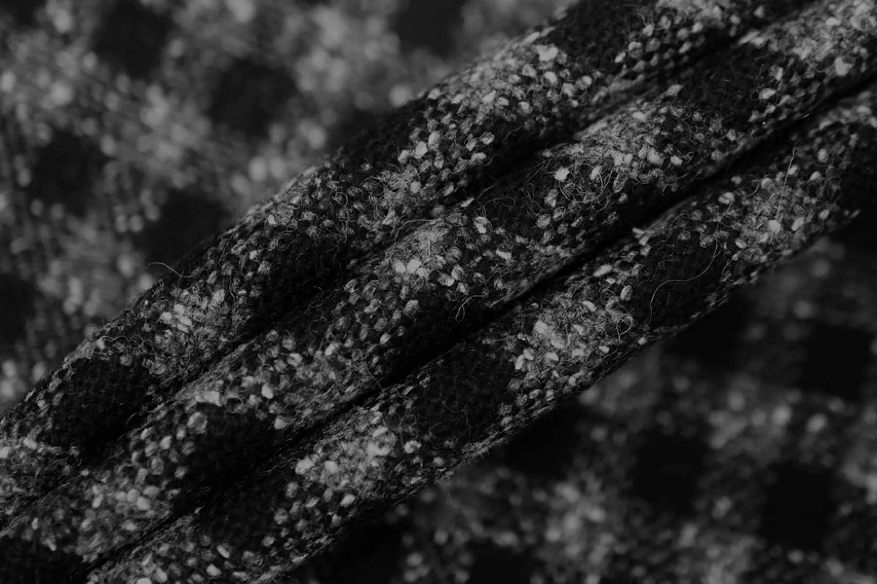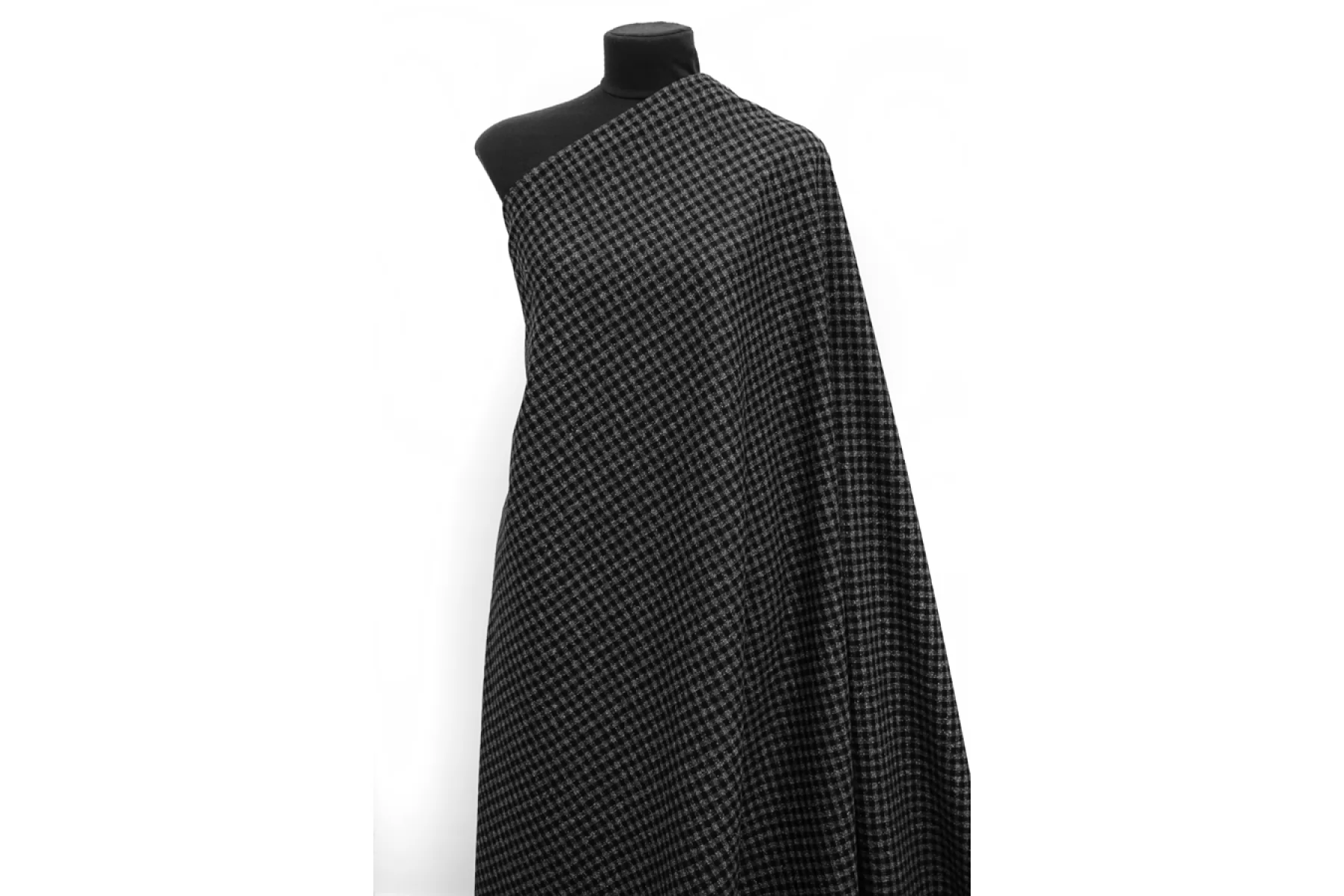 Классный шерстяной твид костюмной плотности в мелкую темно-серо-черную клетку. Материал суховатый, есть очень легкий ворс, немного колется. Пластичный. Не тянется. Не мнется. Плотный, но тонкий. Форму держит. Не просвечивает. Прекрасно подойдет на костюмы, жакеты, юбки и не только. Уход - деликатный.