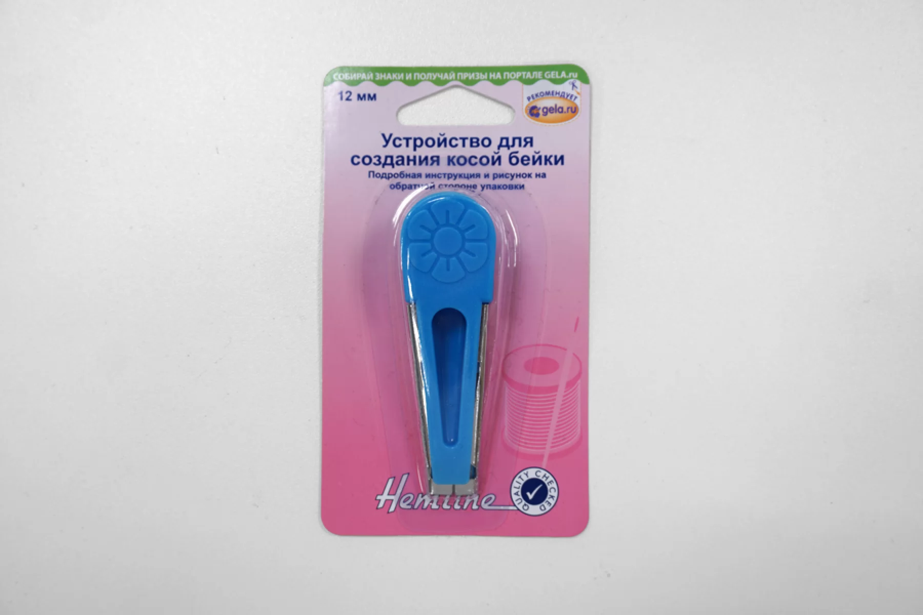 Устройство для складывания косой бейки "Hemline" предназначено для заглаживания раскроенной косой бейки с двух сторон по краям с помощью утюга. Подробная инструкция по использованию с рисунками на обратной стороне упаковки.