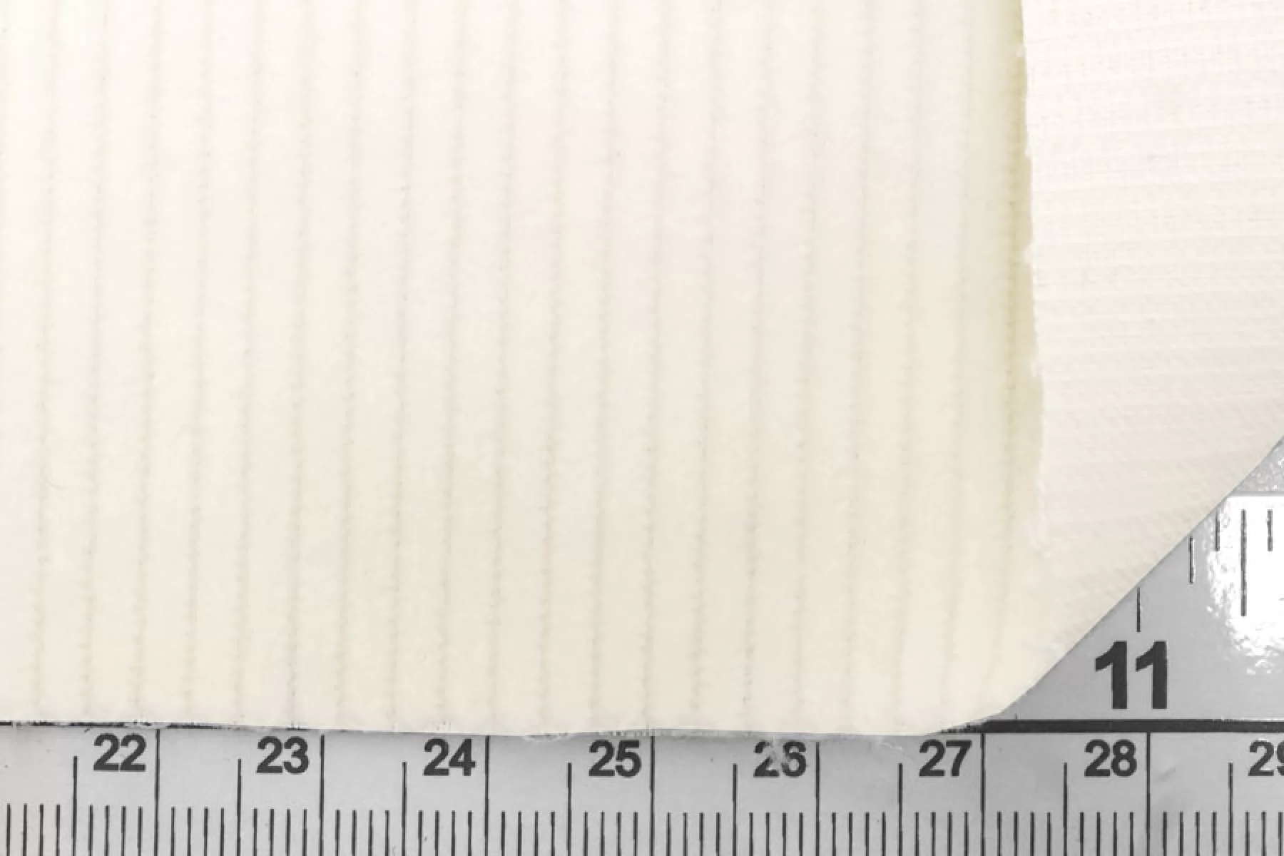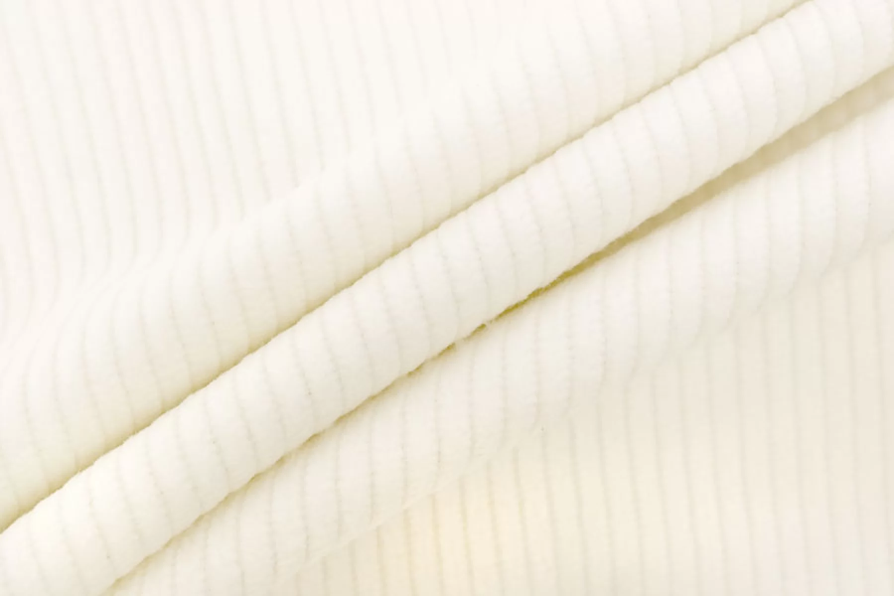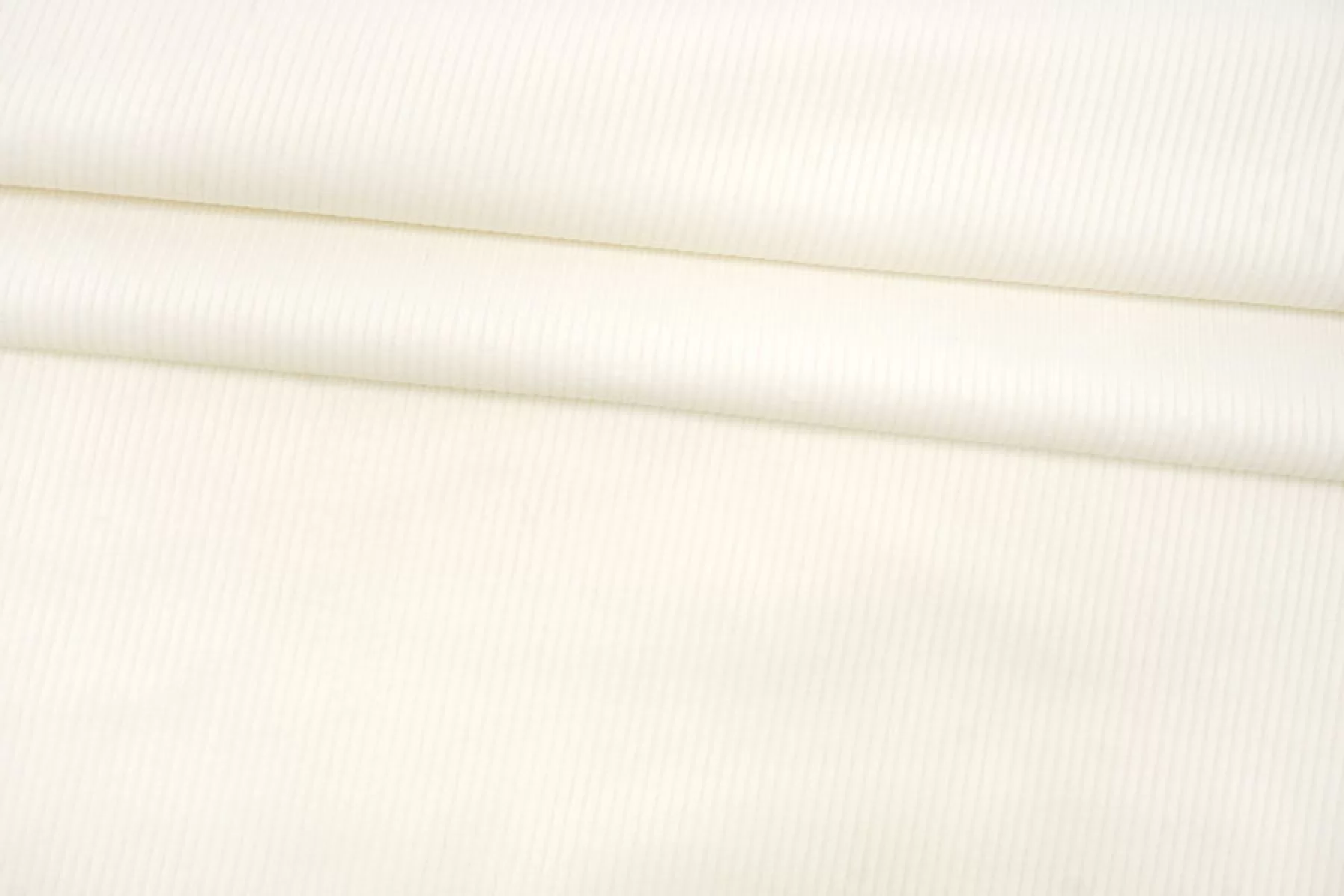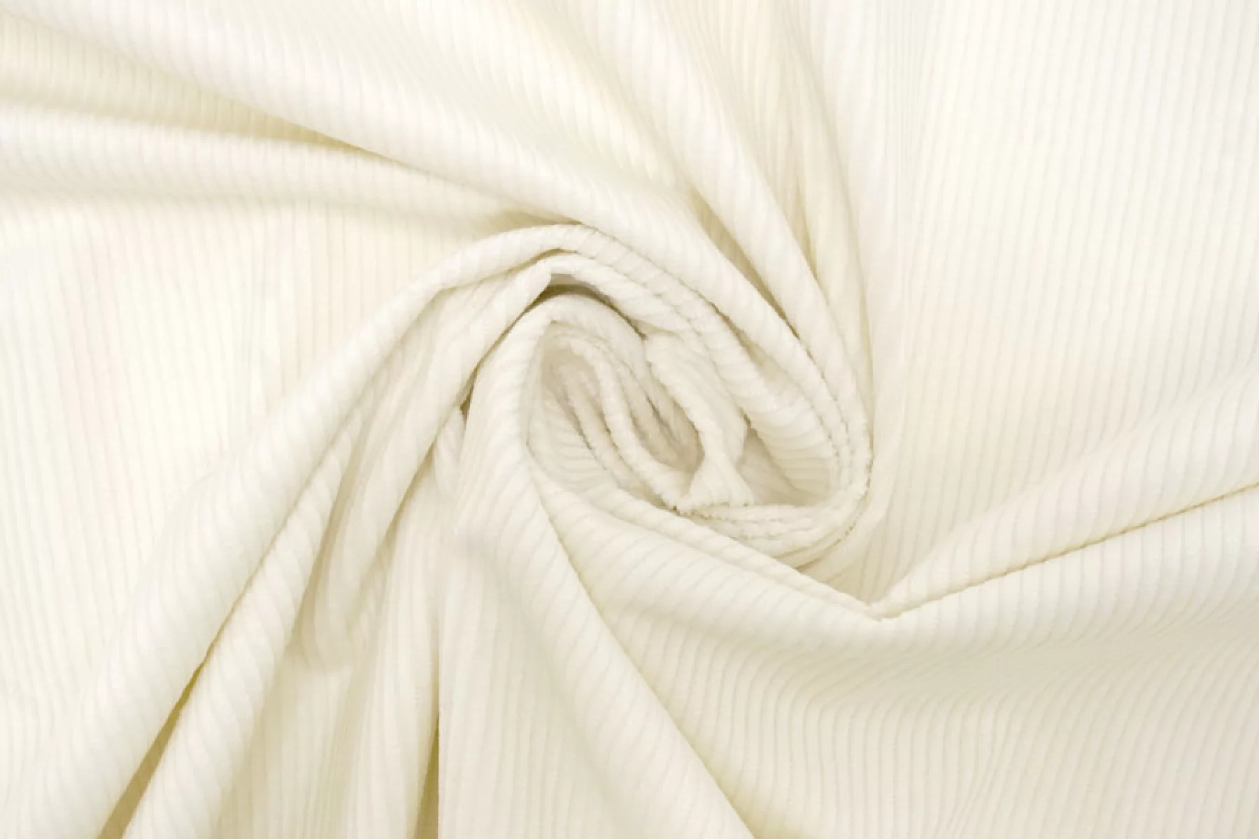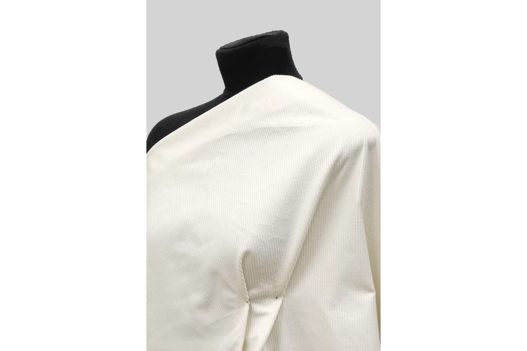 Хлопковый вельвет молочного цвета. Ширина рубчиков ~3 мм. Приятный и мягкий тактильно, тянется. Пластичный. Практически не мнется. Хорошо драпируется. Отличный вариант для пошива платья, шорт, юбки и жакета мягкой формы, теплой рубашки.