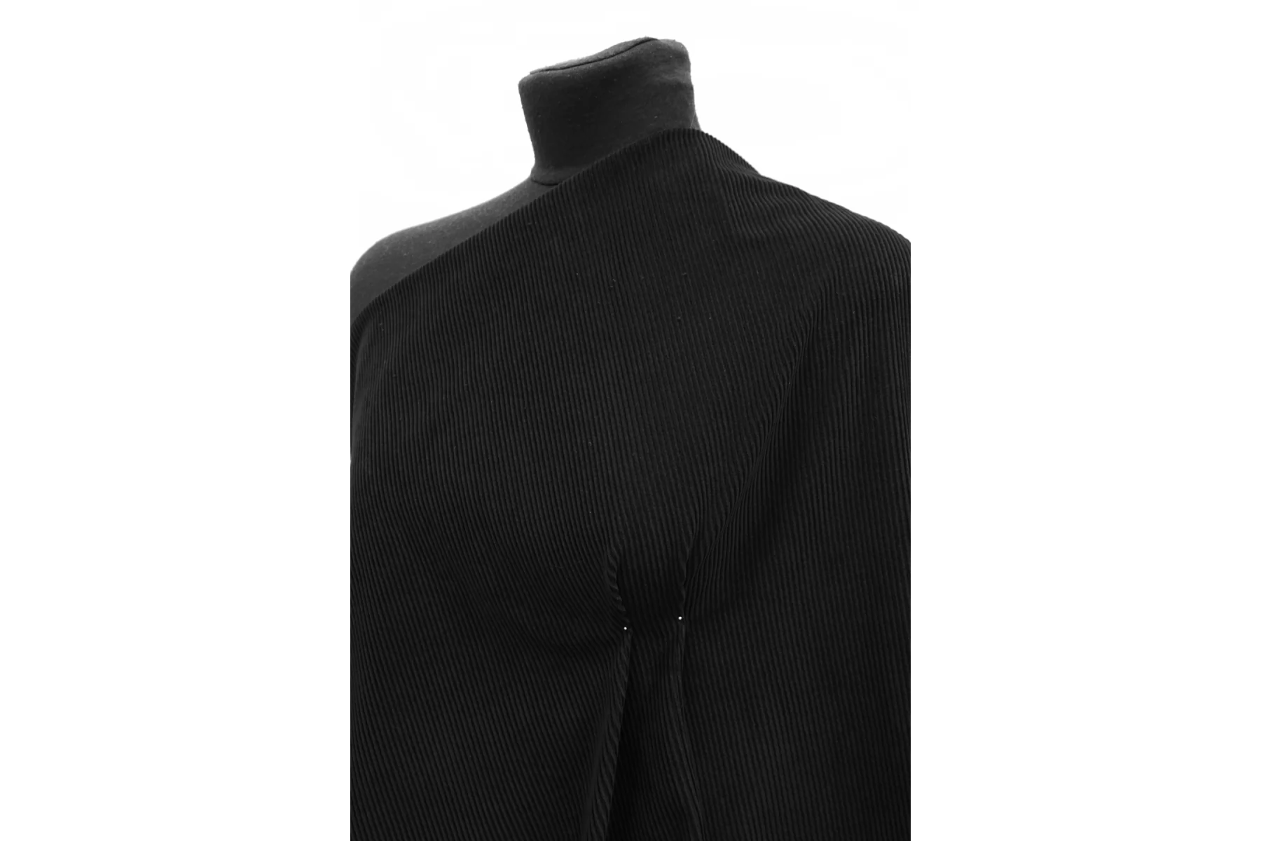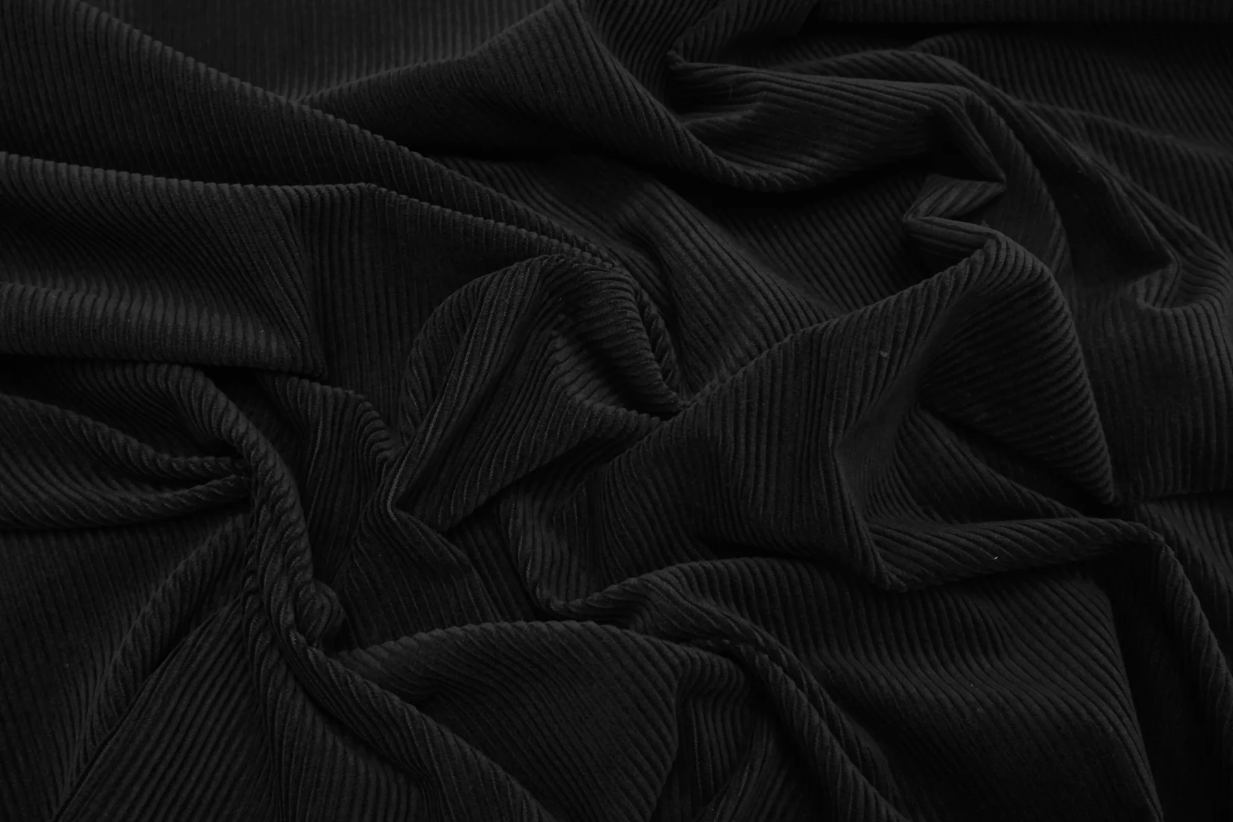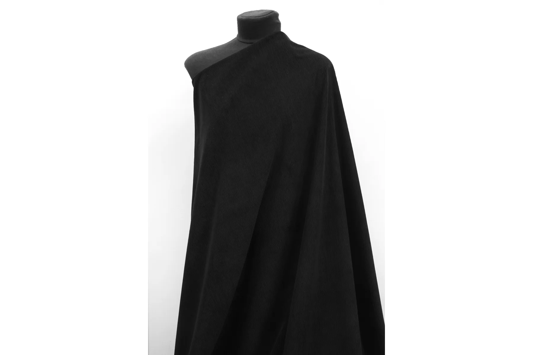 Итальянский хлопковый вельвет классического черного цвета. Ширина рубчиков ~2 мм. Материал плотный но не толстый. Приятный и мягкий тактильно, не тянется. Пластичный. Не мнется. Хорошо драпируется и держит форму. Отличный вариант для пошива костюма, шорт, юбки и жакета.
