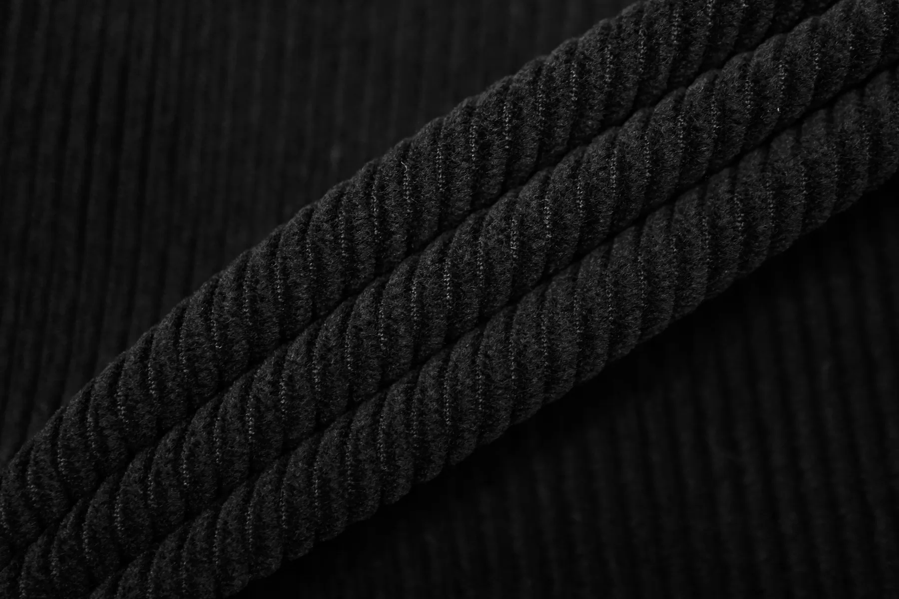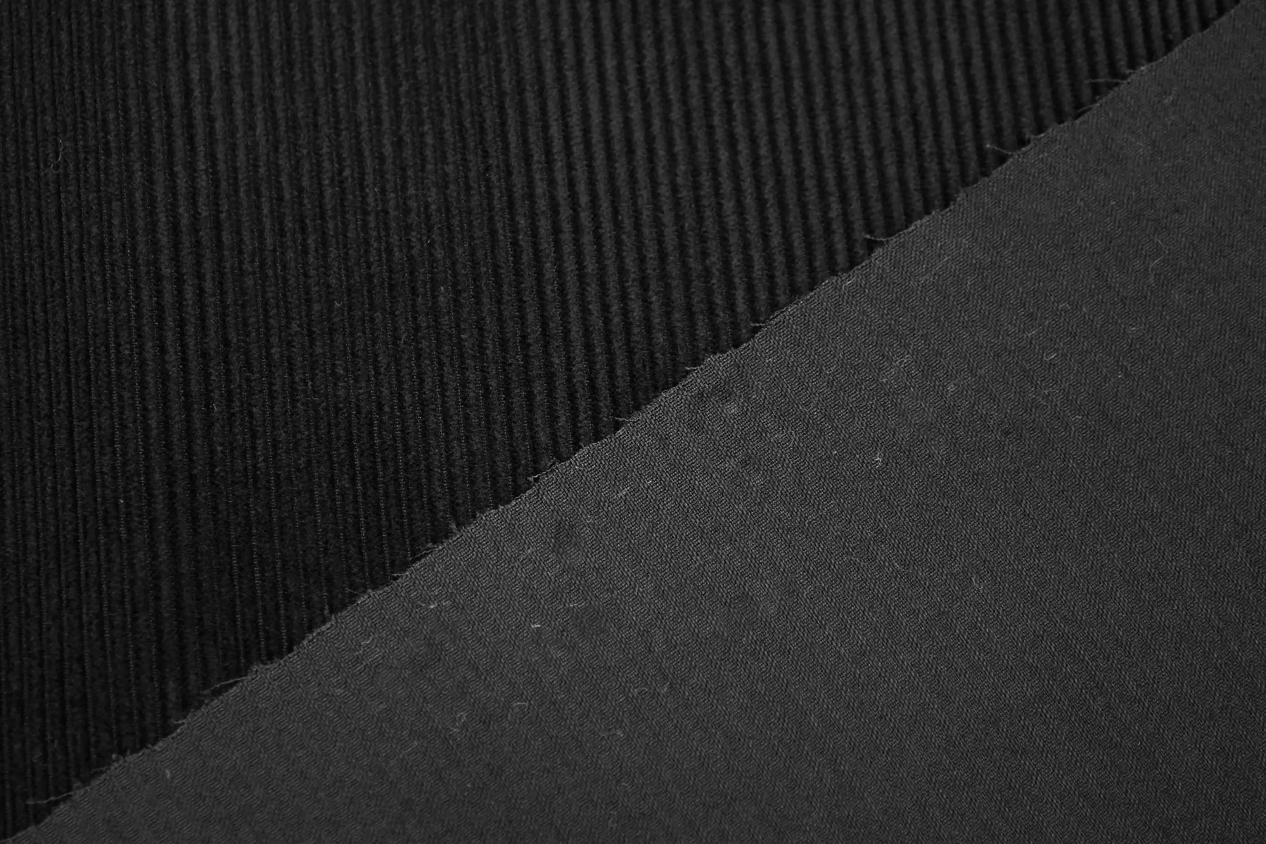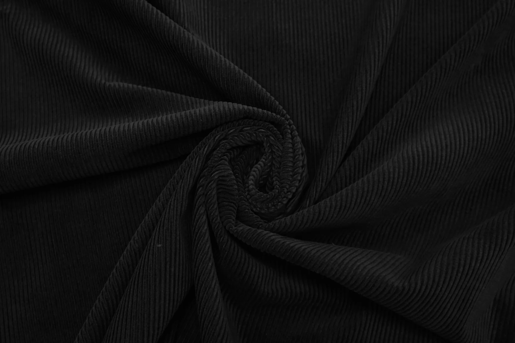 Итальянский хлопковый вельвет классического черного цвета. Ширина рубчиков ~2 мм. Материал плотный но не толстый. Приятный и мягкий тактильно, не тянется. Пластичный. Не мнется. Хорошо драпируется и держит форму. Отличный вариант для пошива костюма, шорт, юбки и жакета.
