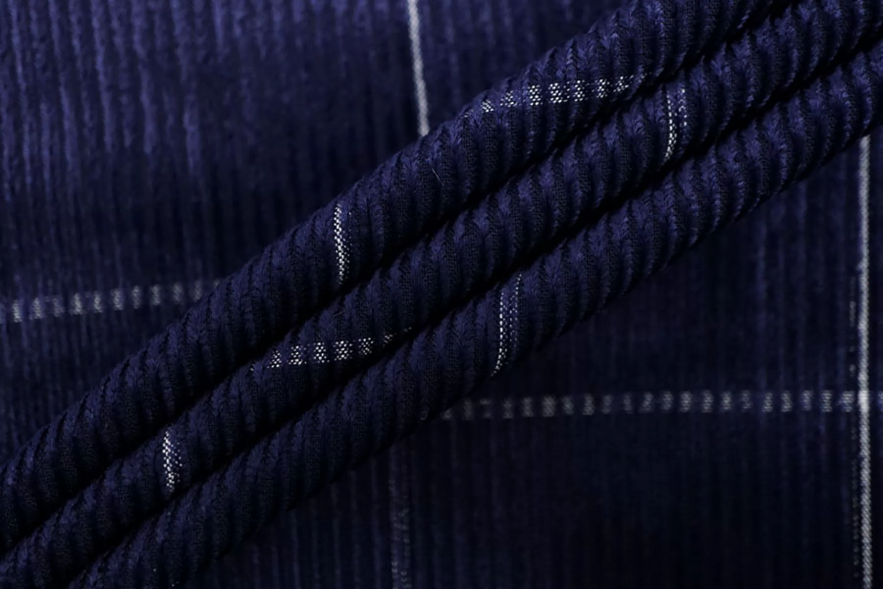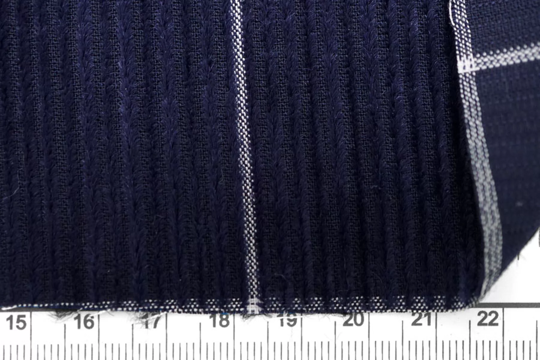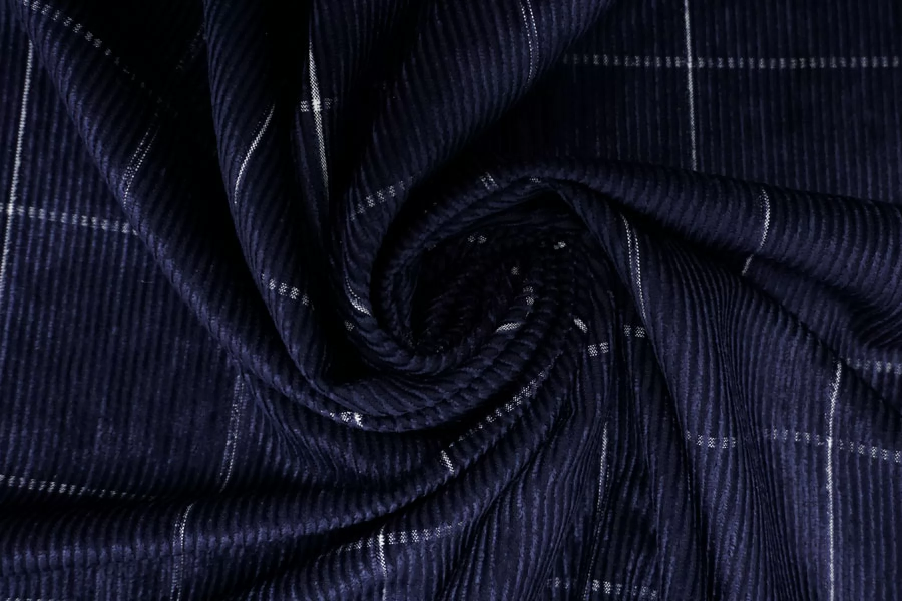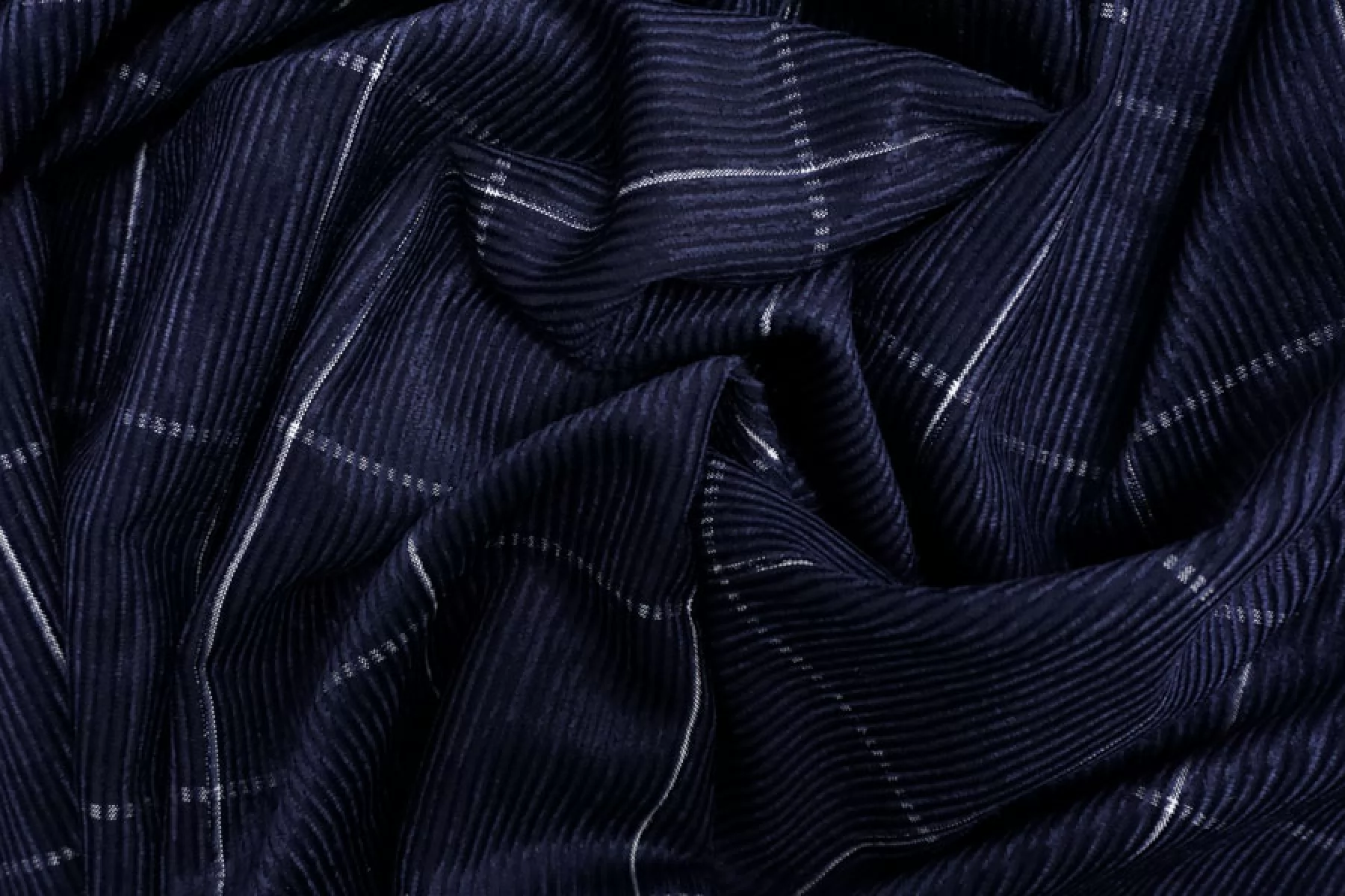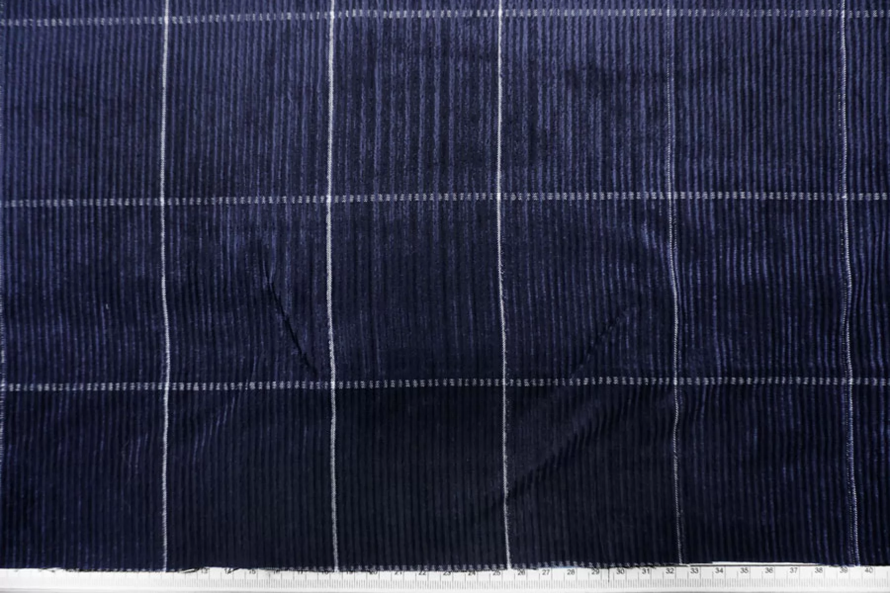 Итальянский хлопковый вельвет темно-синего цвета (с фиолетовым подтоном) в крупную клетку. Основа хлопковая, ворс - вискоза. Ворс направленный. Ширина рубчиков ~2 мм. Приятный и мягкий тактильно, не тянется. Обладает приятным лоском. Не мнется. Хорошо драпируется, но форму практически не держит. Отличный вариант для пошива платья, костюма, шорт, юбки и мягкого жакета.