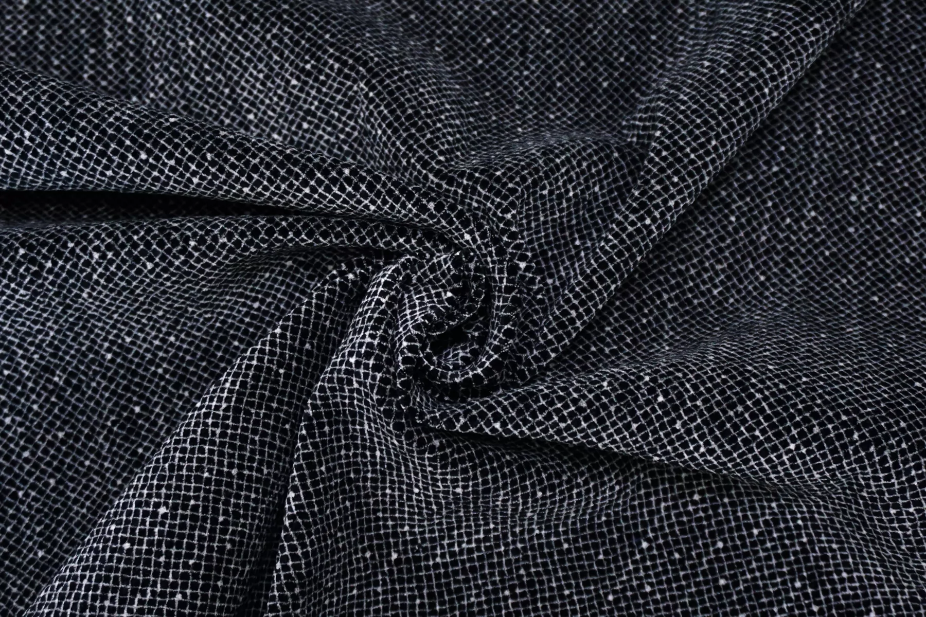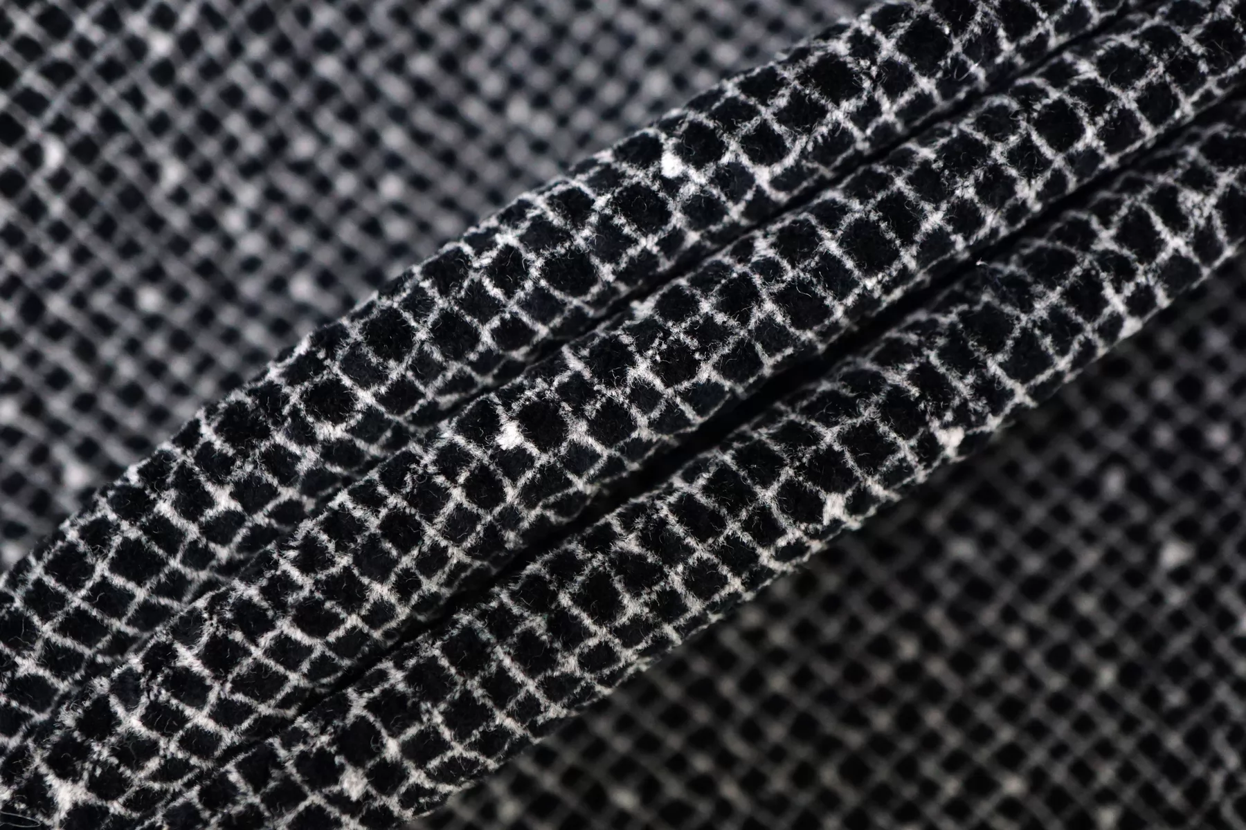 Интересный костюмный велюр из хлопка с жатой, крешированной структурой, с чёрно-серым принтом. Ворс короткий, направленный. Очень приятный тактильно, хорошо тянется, не просвечивает. Подойдет для пошива костюма, платья, юбки, брюк.