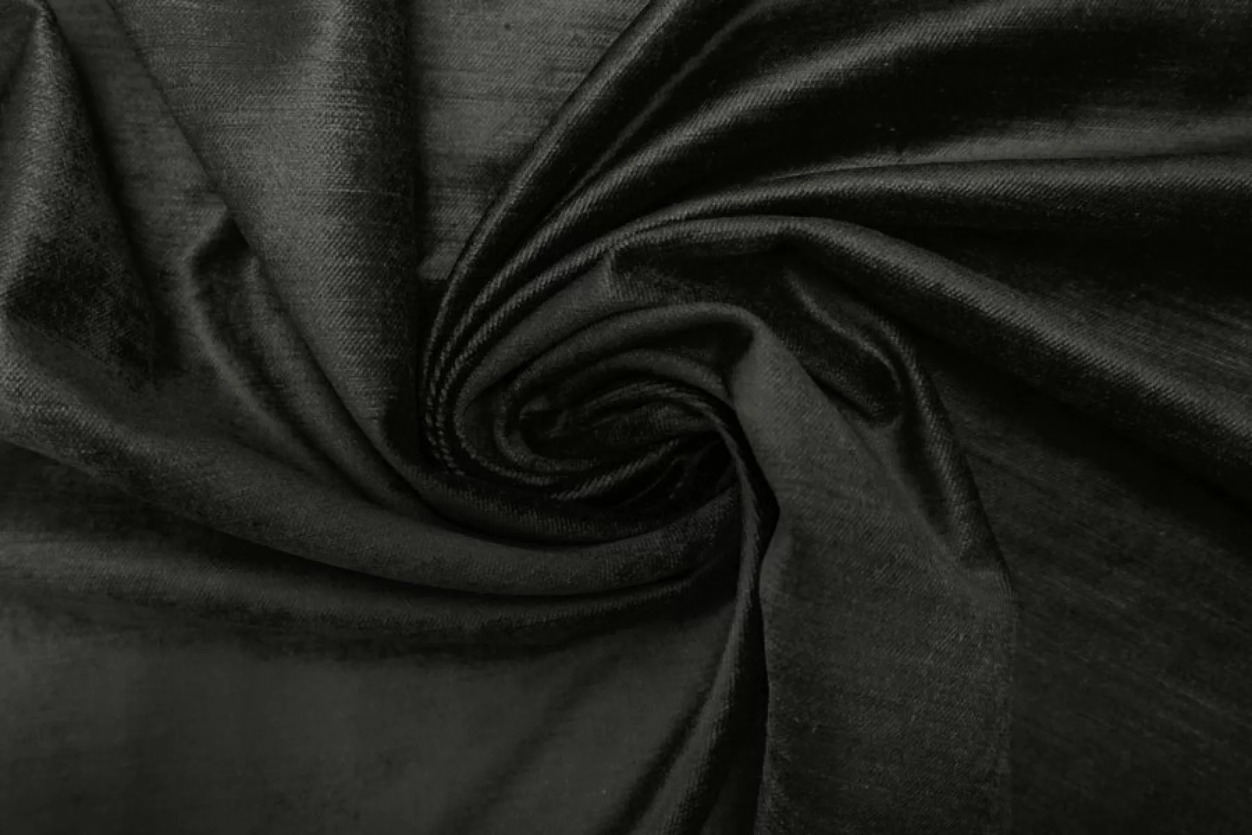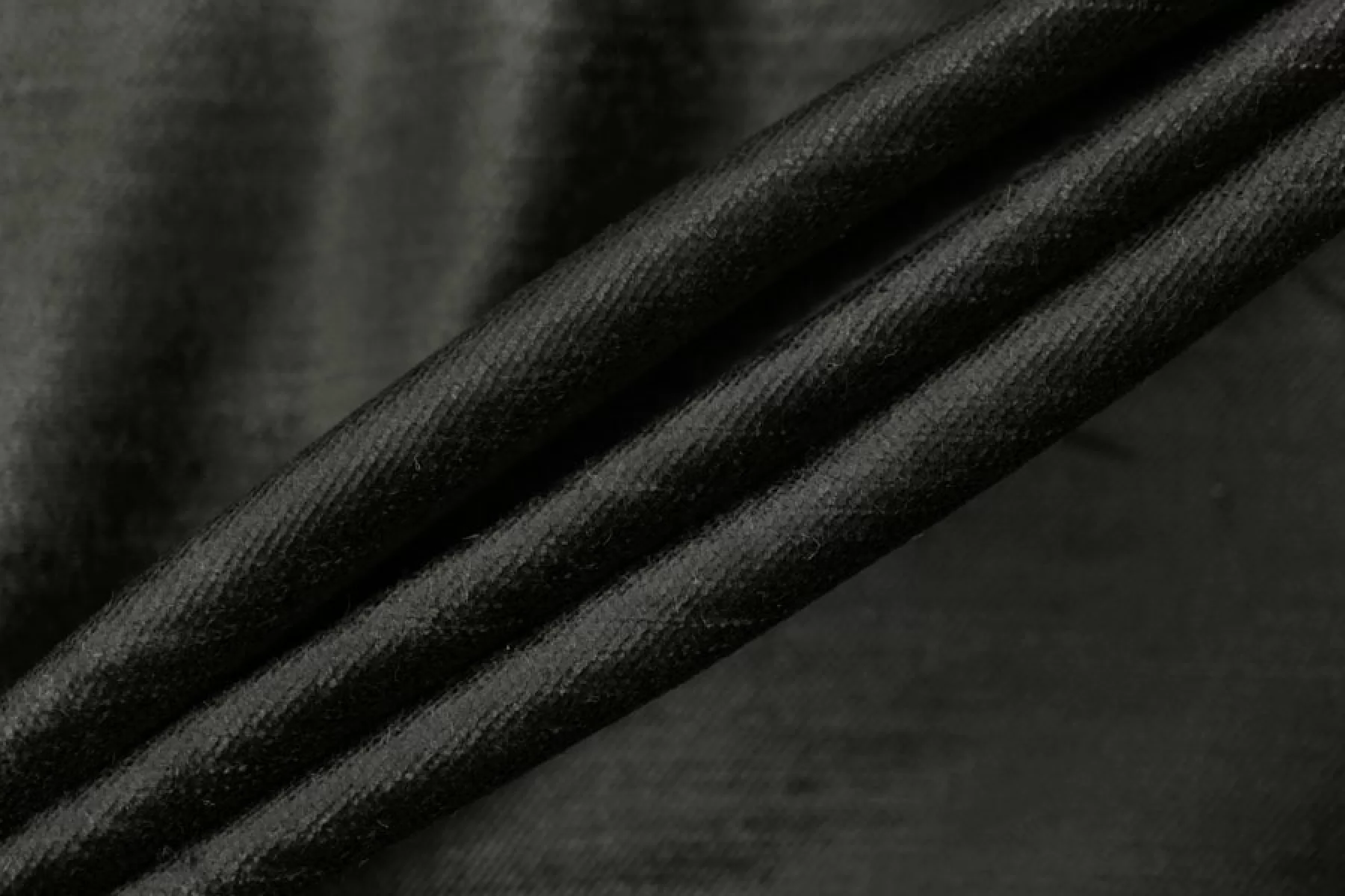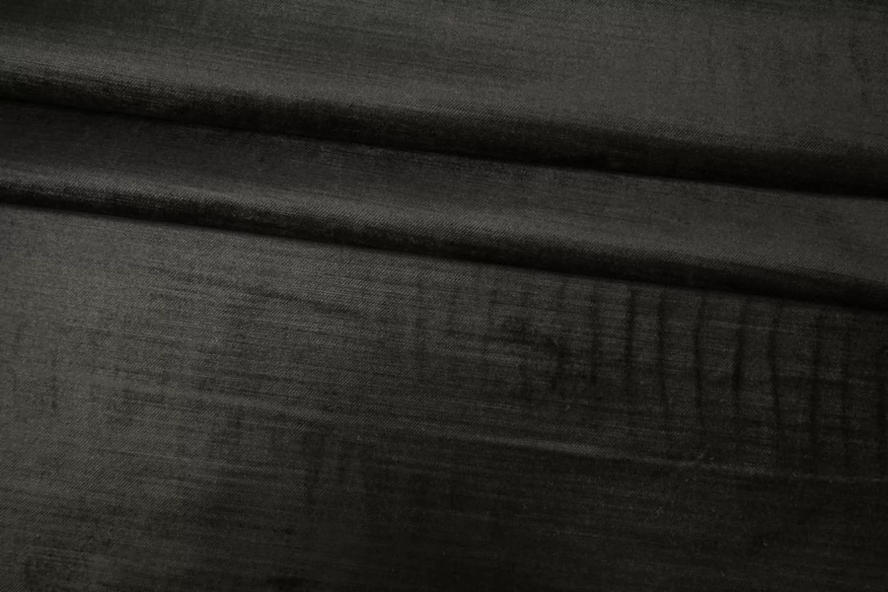Итальянский костюмно-плательный велюр из хлопка с ворсом из вискозы, в тёмном коричневом цвете. Нити основы с фактурными утолщениями, что создаёт на лицевой стороне свой чуть полосатый узор. Ворс короткий, направленный, с лоском. Очень приятный тактильно, немного тянется благодаря плетению, не просвечивает. Подойдет для пошива костюма, платья, юбки, брюк.