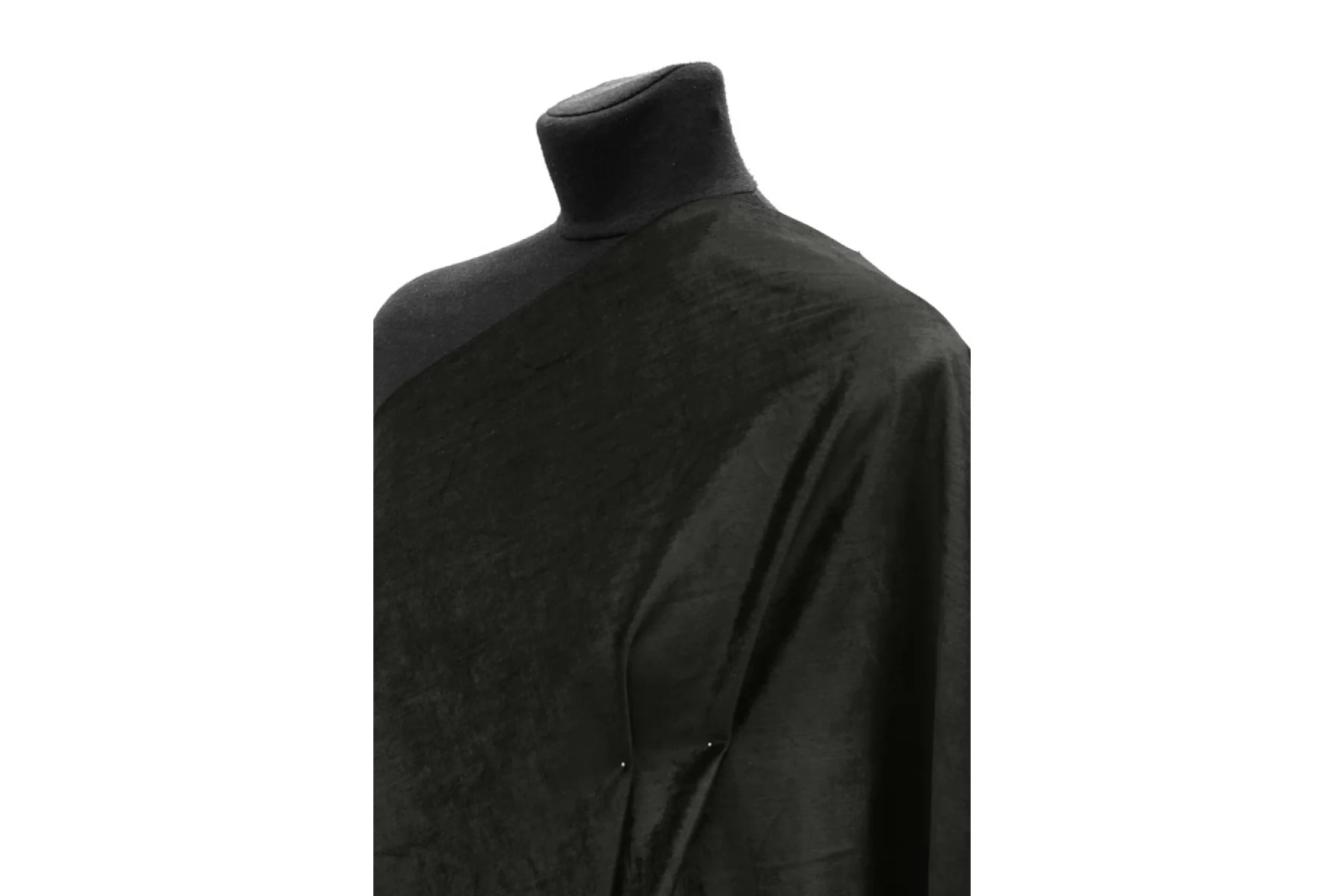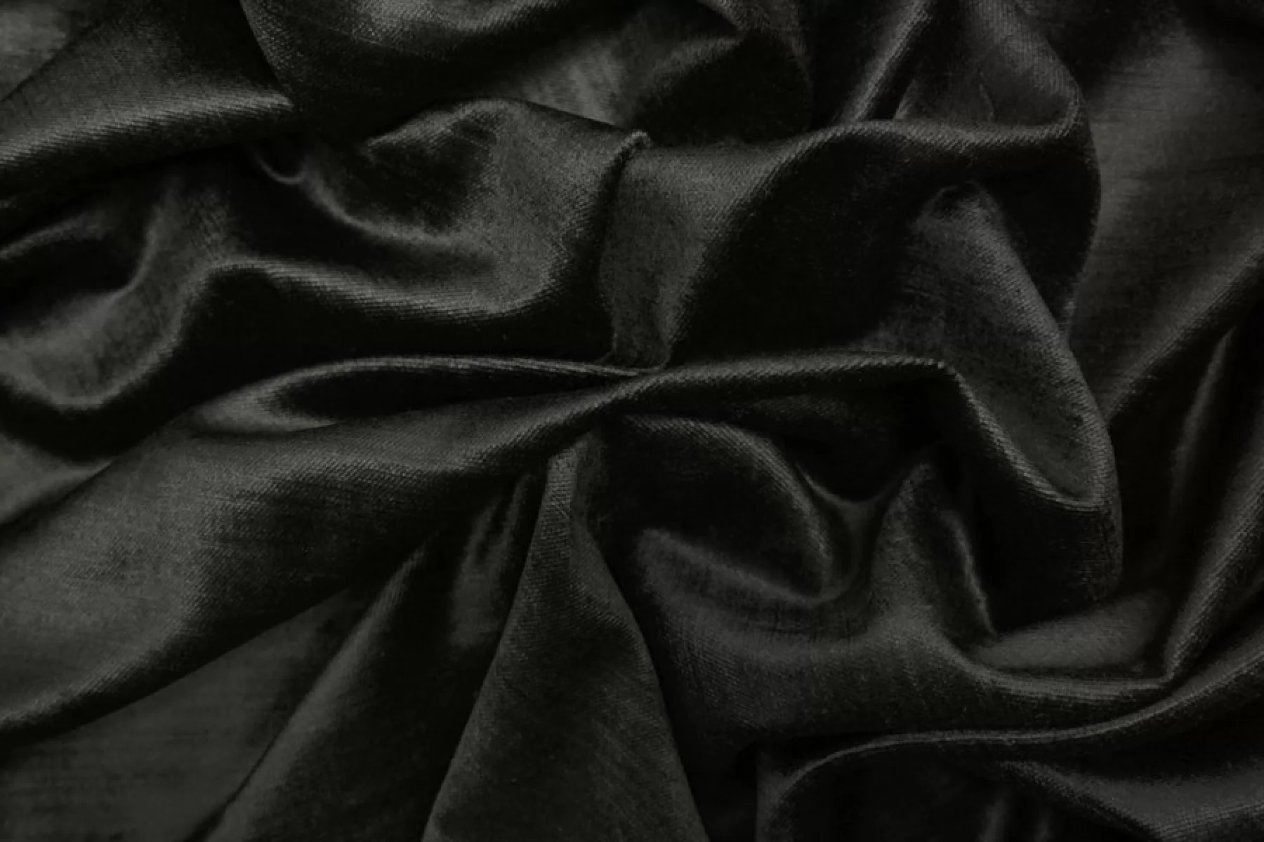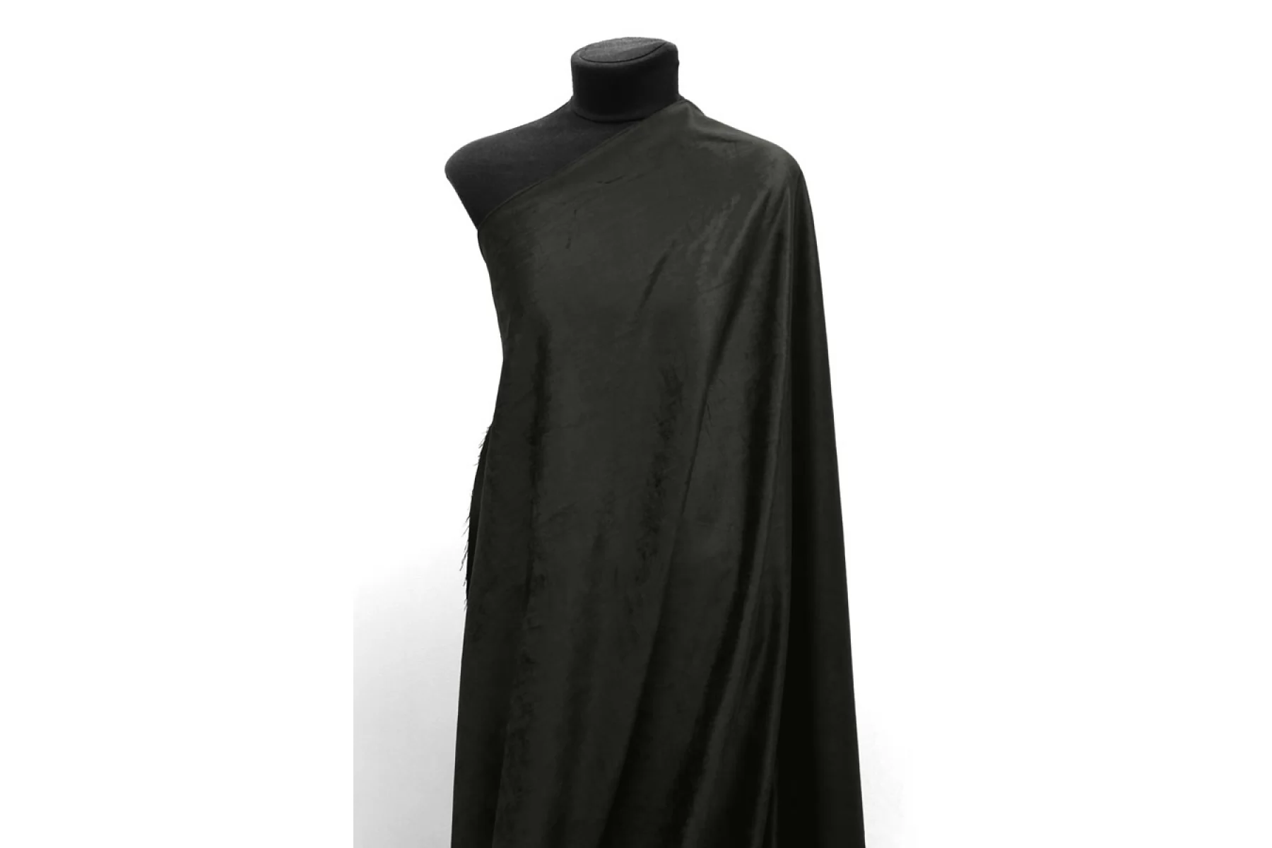 Итальянский костюмно-плательный велюр из хлопка с ворсом из вискозы, в тёмном коричневом цвете. Нити основы с фактурными утолщениями, что создаёт на лицевой стороне свой чуть полосатый узор. Ворс короткий, направленный, с лоском. Очень приятный тактильно, немного тянется благодаря плетению, не просвечивает. Подойдет для пошива костюма, платья, юбки, брюк.