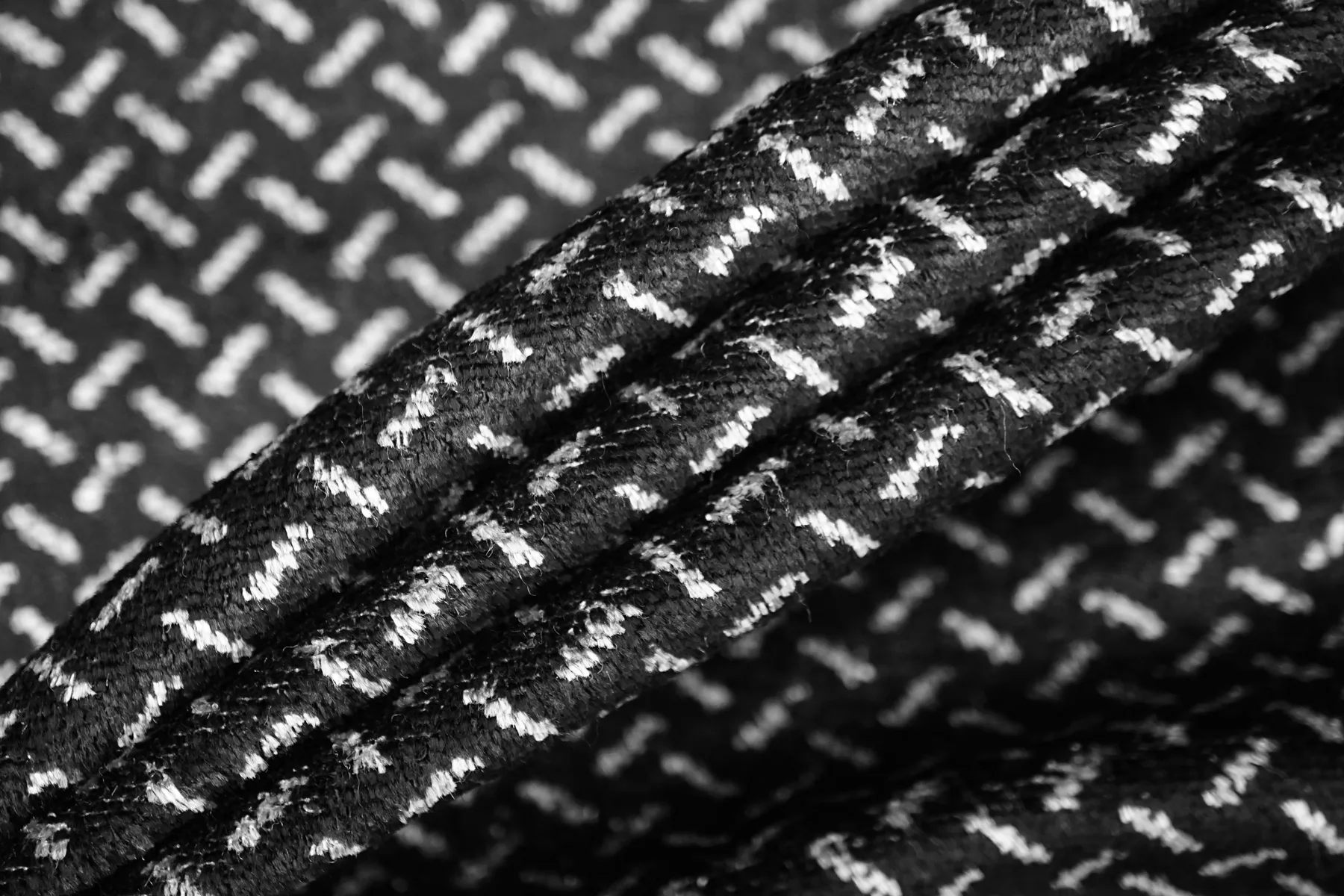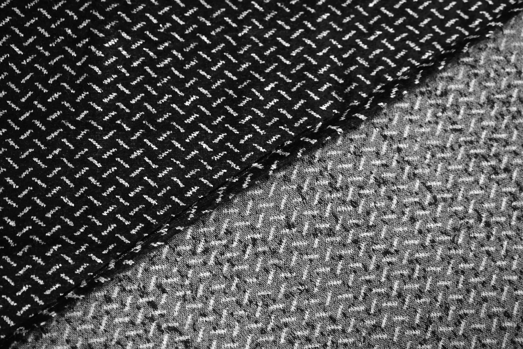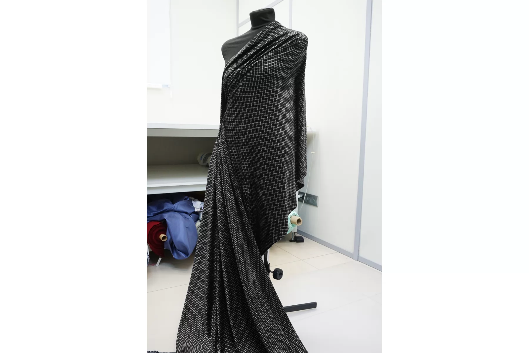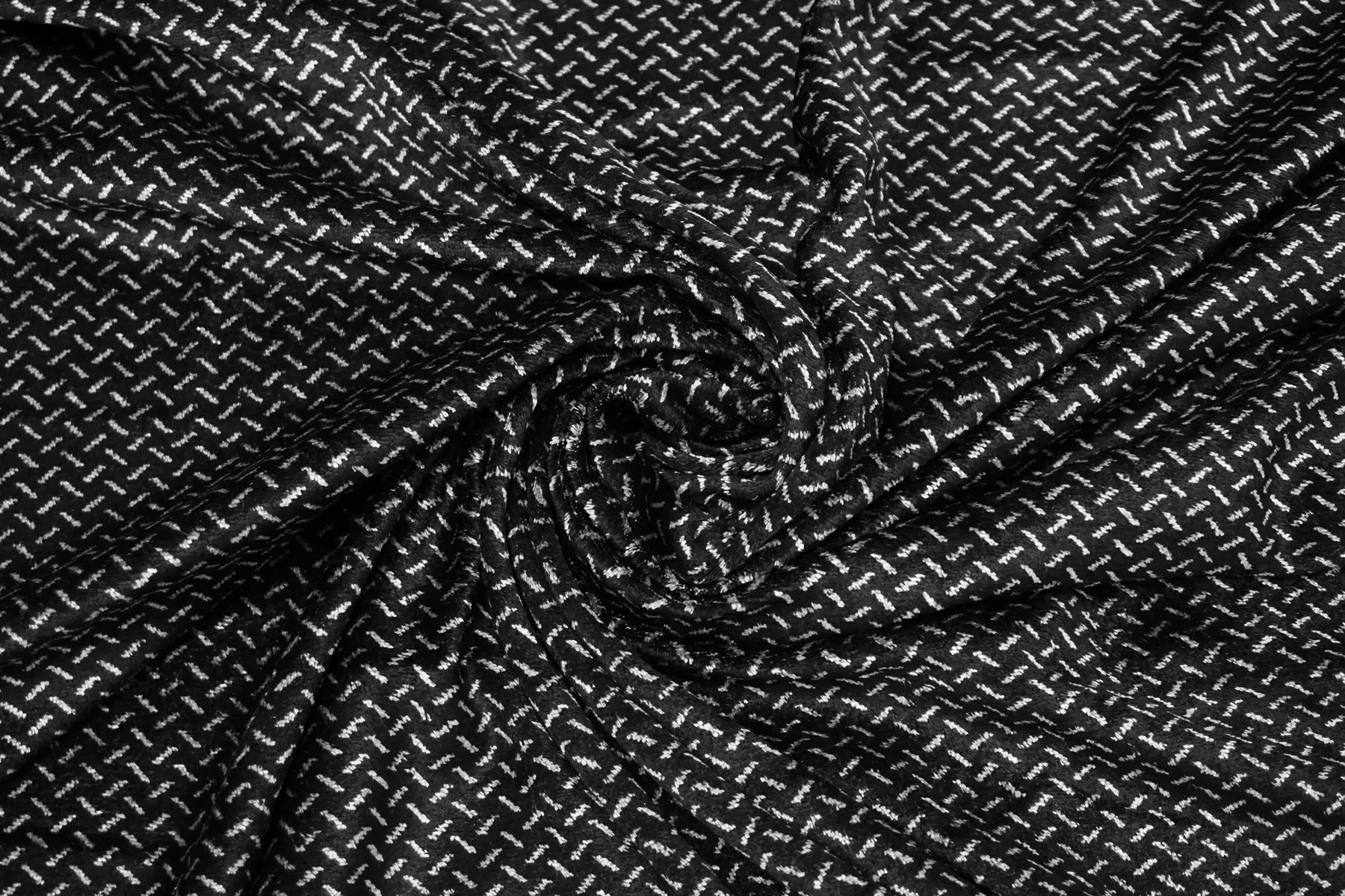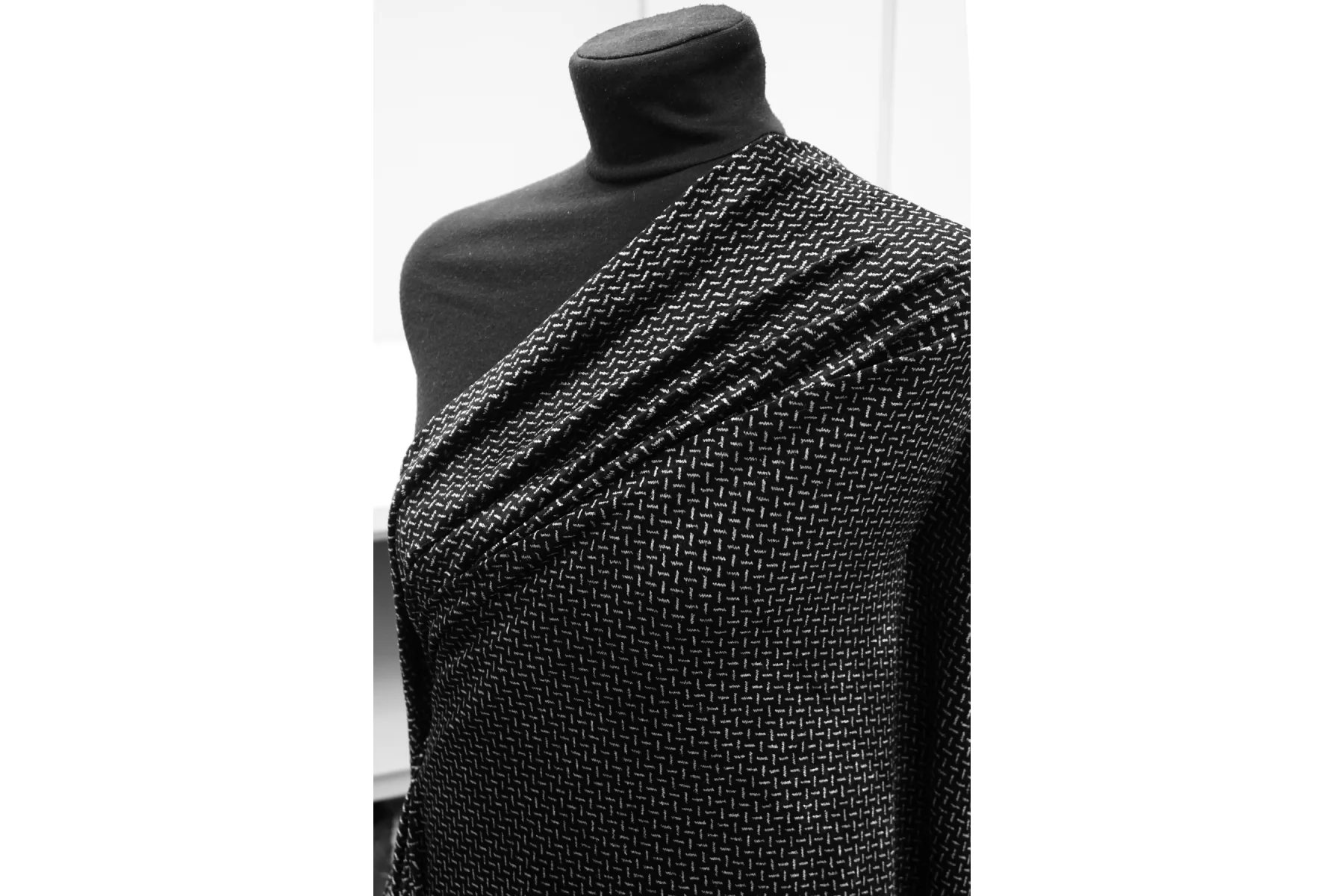 Трикотаж велюровый, тактильно очень приятный и мягкий, имеет переливающийся блеск. Чёрный цвет в ритмичный бело-серый рисунок. Тактильно приятный, мягкий. Эластичный, пластичный. Подойдет для пошива брюк спортивного кроя, толстовки, шорт, одежды в стиле спорт-шик.