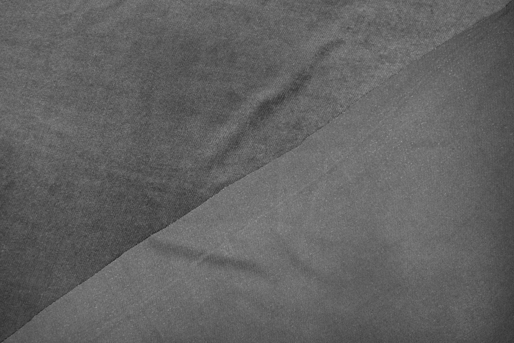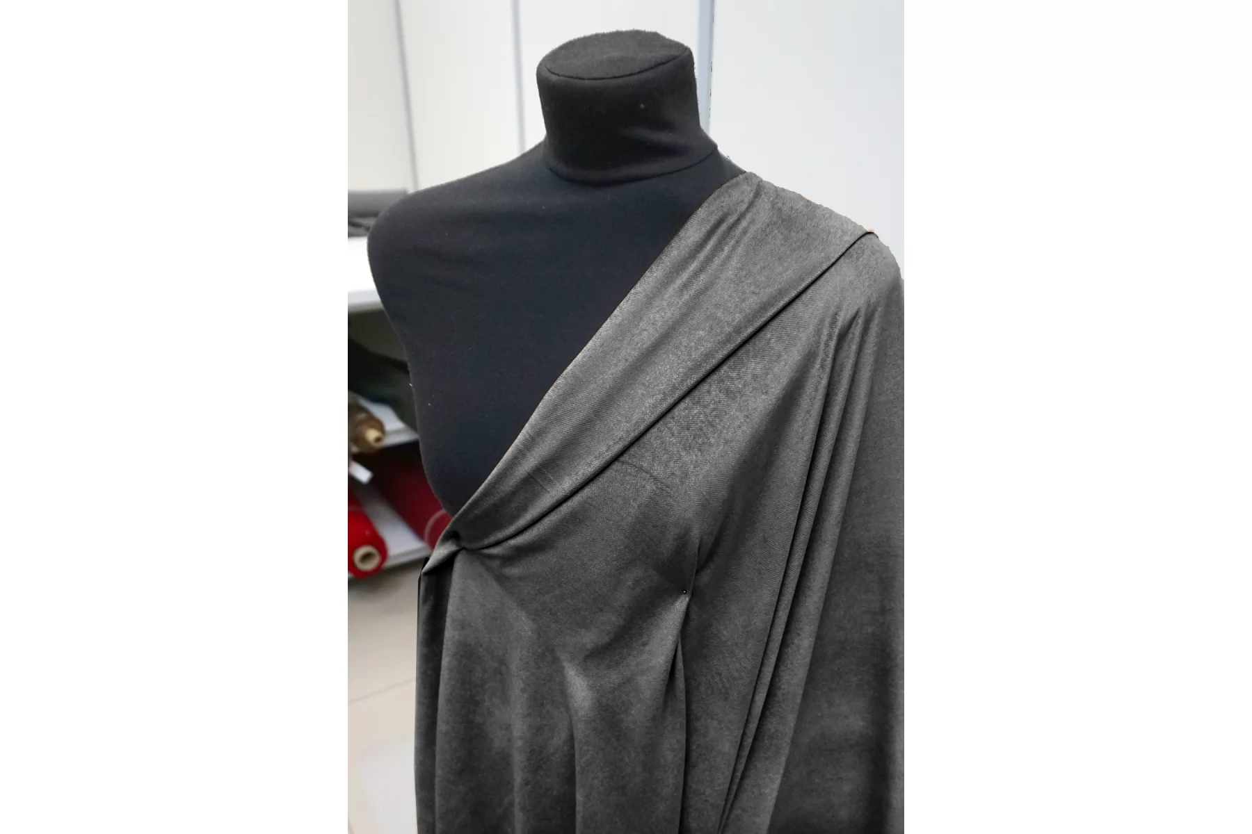 Итальянский варёный костюмно-плательный велюр из вискозы, в сером цвете. Ворс короткий, направленный, с лоском. Тактильно ткань мягкая, приятная. Пластичный, хорошо драпируется. Не тянется, не просвечивает. Подойдет для пошива костюма, платья, юбки, брюк.