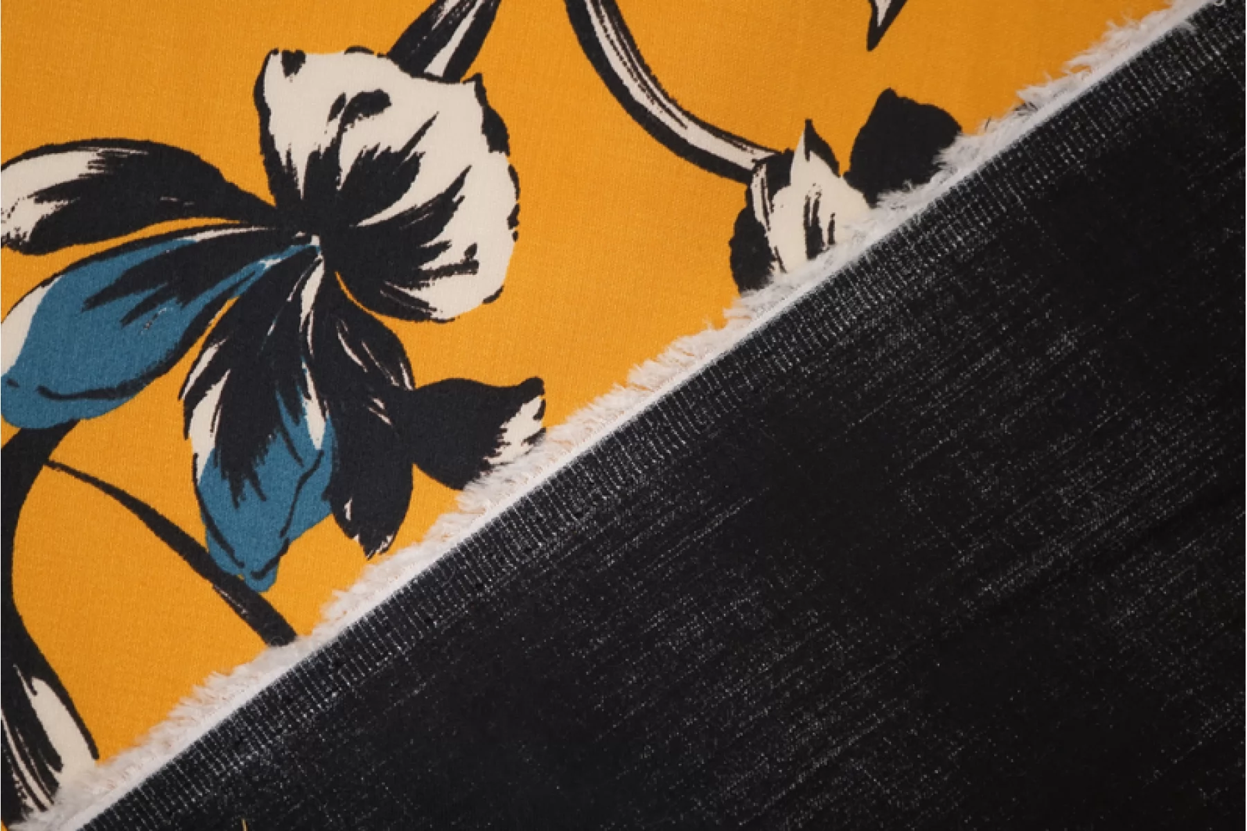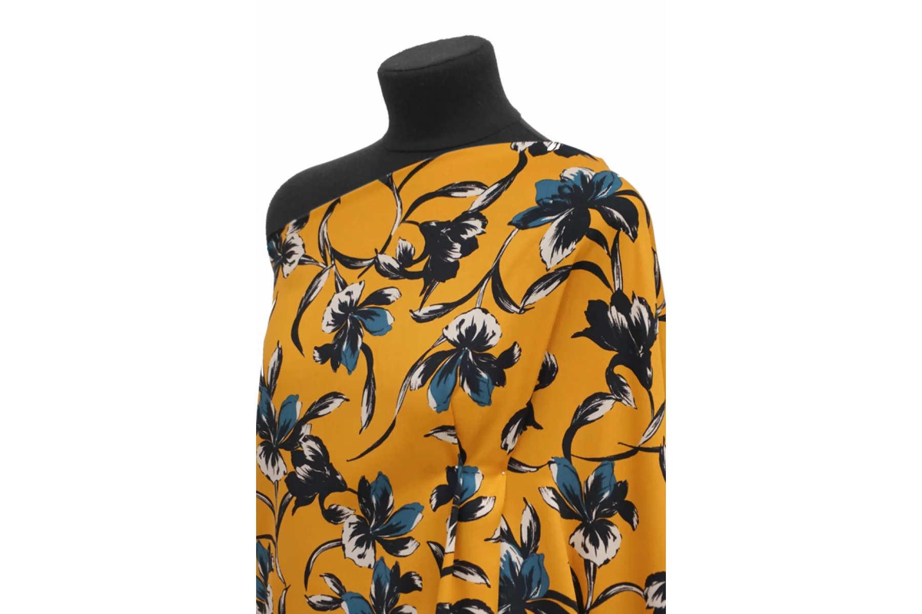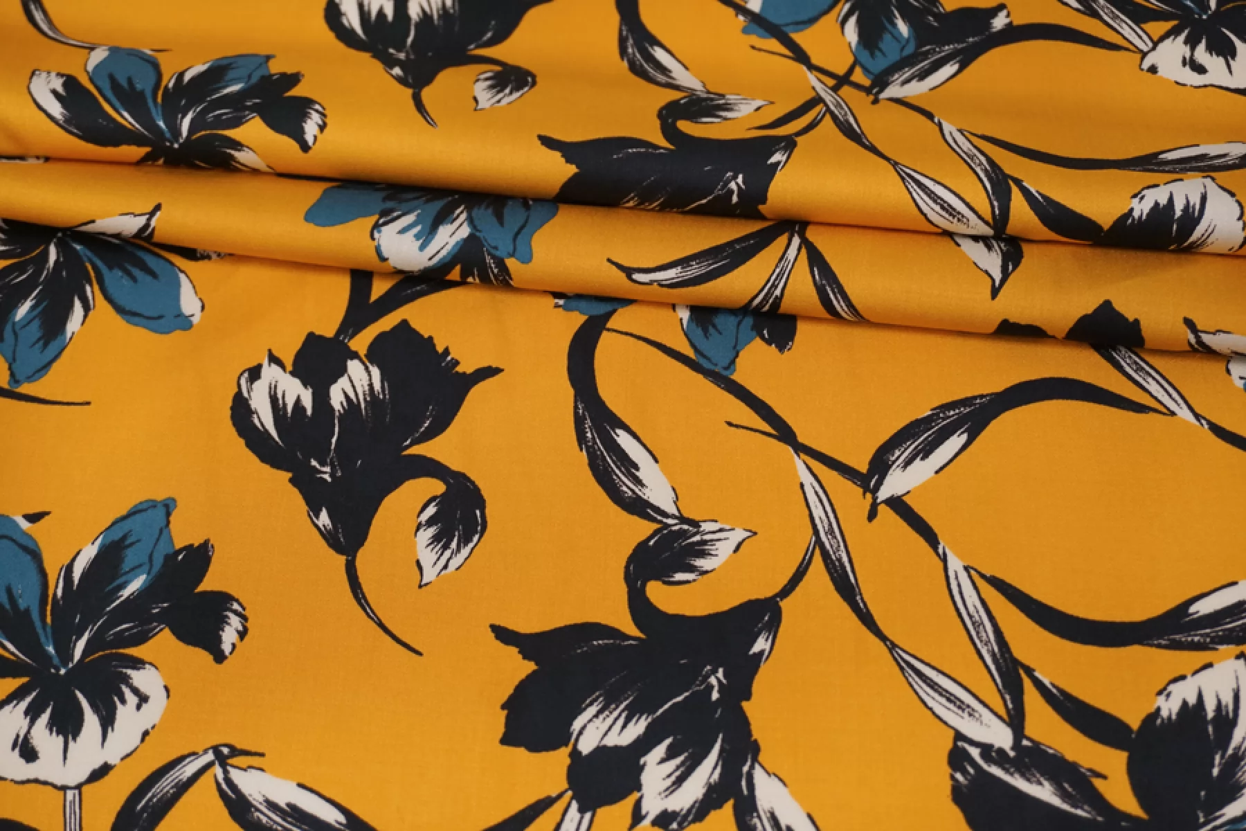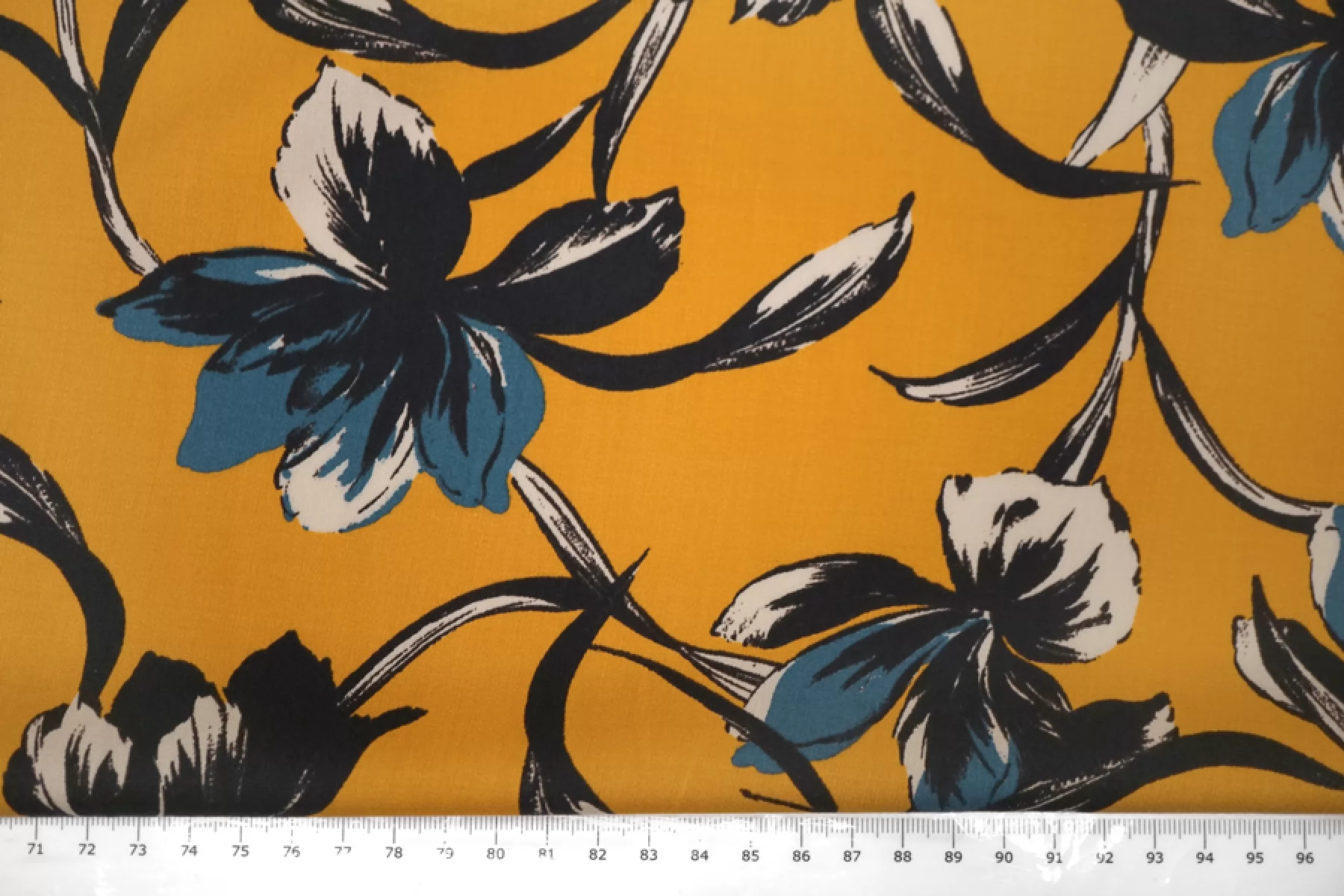 Плательно-блузочная вискоза сатинового переплетения в красивой цветовой гамме: горчично-желтый, черный и акцентные бирюзовые и припыленно-бежевые оттенки. Принт - достаточно крупные цветы с бордюрами по обеим сторонам, смотрится очень красиво. Тактильно материал очень приятный, мягкий. Обладает красивым лоском. Не тянется, не просвечивает. Вискоза легкая и струящаяся, красива в пластике . Форму держит немного. Шьем платье, блузку или юбку. Обязательно учитывайте усадку 5-10%. Шить изделия из данного материала рекомендуем тонкой иглой.
