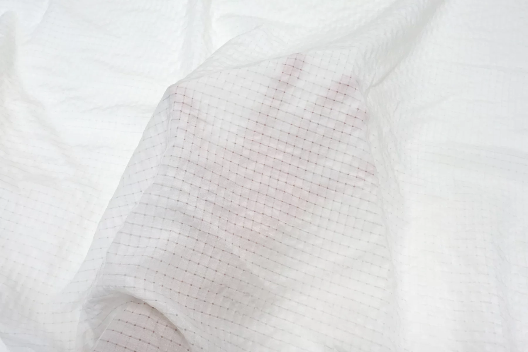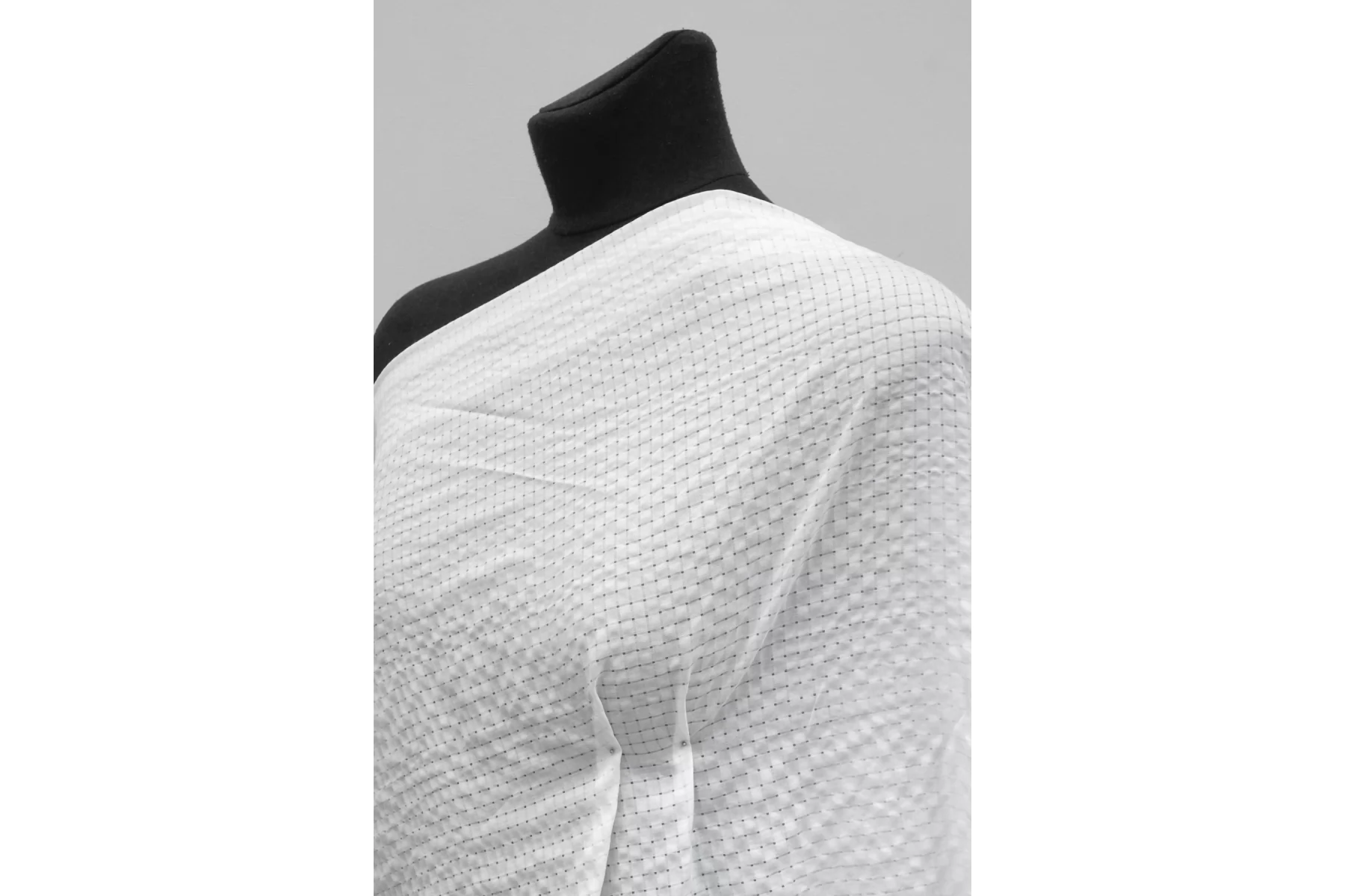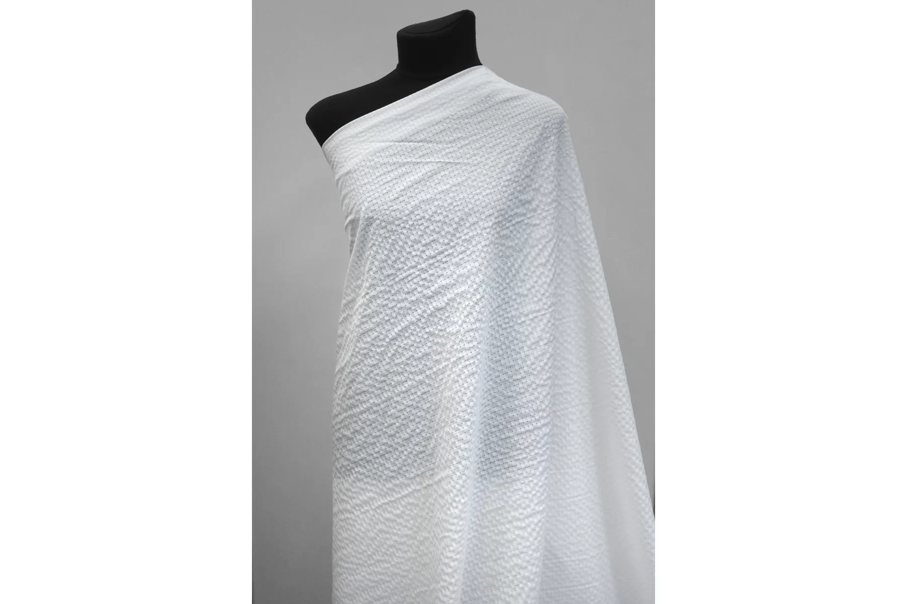 Прекрасная вискоза блузочной плотности белого цвета по типу мережки плетение образует мелкую клетку. Смотрится очень красиво. Тактильно материал очень приятный, мягкий. Обладает легким лоском. Не тянется, просвечивает. Вискоза легкая и струящаяся, красива в пластике . Форму держит немного. Шьем платье, блузку или юбку. Обязательно учитывайте усадку 5-10%. Шить изделия из данного материала рекомендуем тонкой иглой.