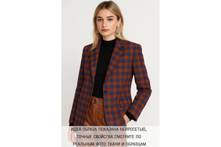 Классная плотная вискоза костюмной плотности диагонального плетения с принтом в виде средней клетки терракотового и синего цветов. Мягкая и тактильно приятная, чувствуется плетение наощупь. Позиция двухсторонняя, с одной стороны рыже-синяя клетка среднего размера, с другой - однотонный терракот. Примерно 0,8 мм толщиной. Пластичная, красива в драпировке. Форму немного держит. Немножко тянется благодаря плетению. Отличный вариант на костюмы, жакеты, юбки, платья.