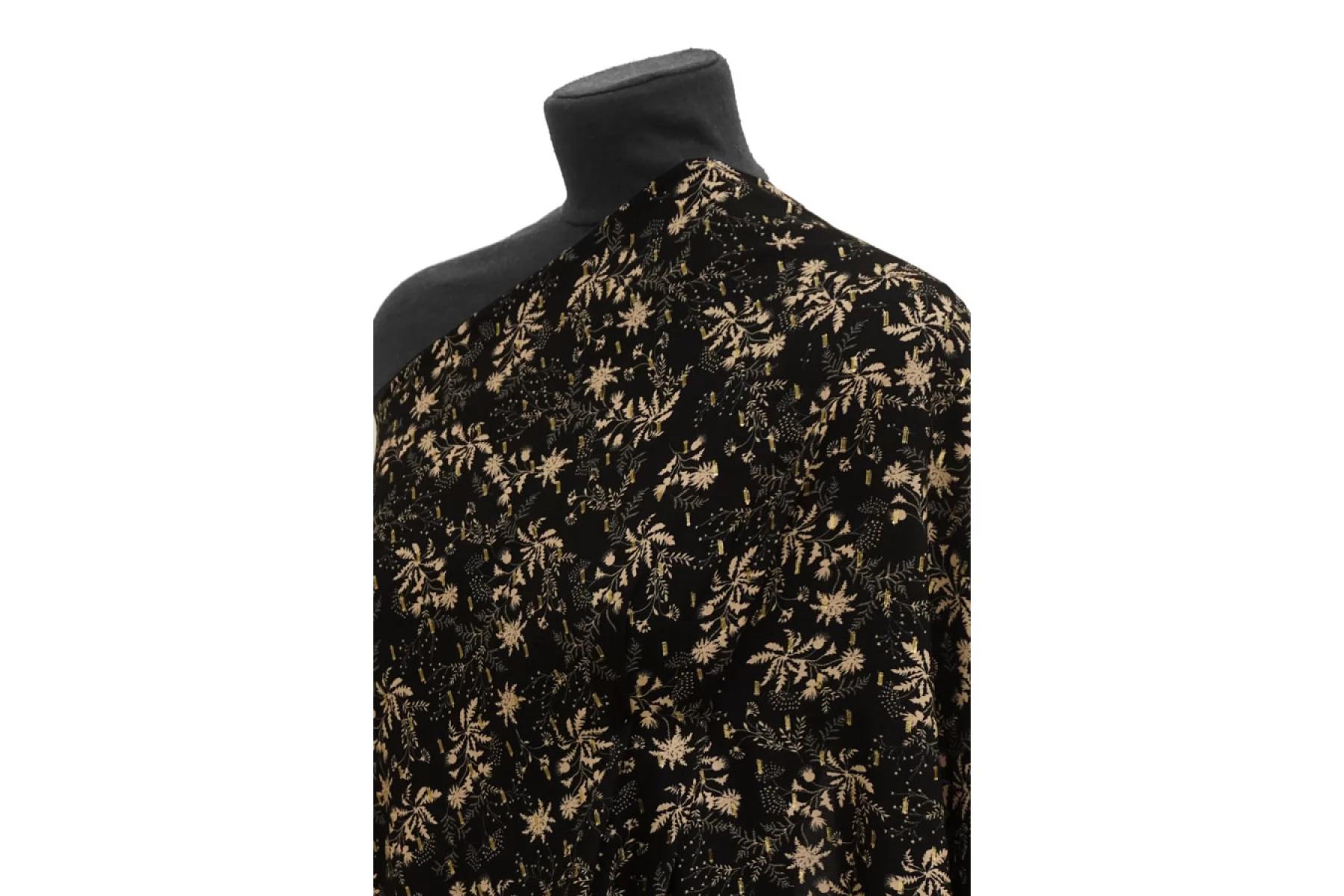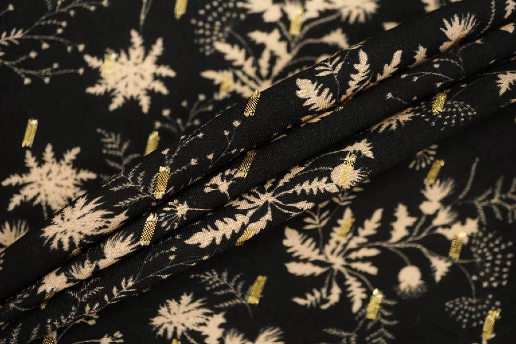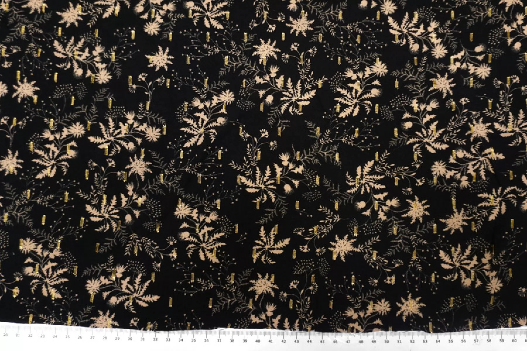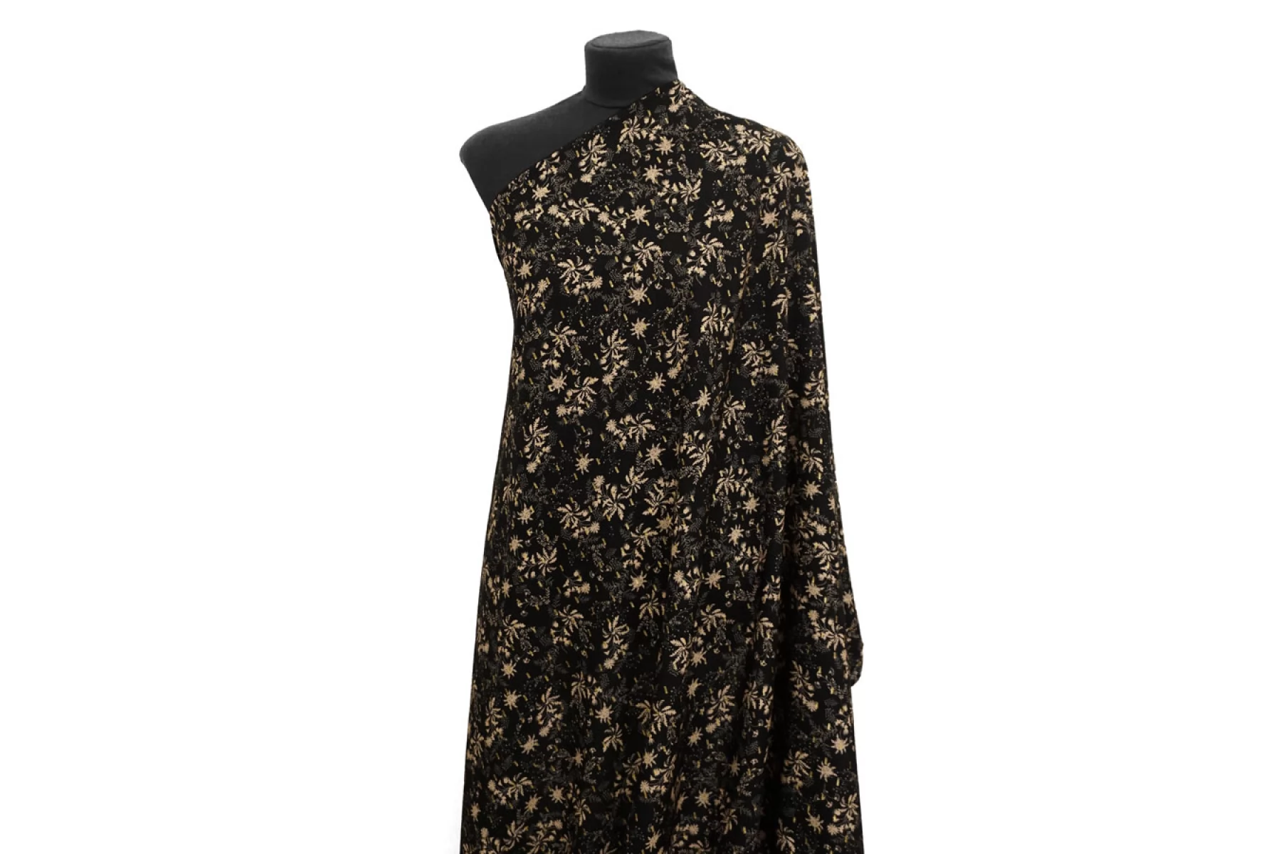 Плательно-блузочный вискозный штапель черного цвета с цветочным принтом бежевого цвета и с филькупе из золотого люрекса. Тактильно материал приятный, мягкий, тонкий. Не тянется, просвечивает силуэт. Хорошо драпируется, форму не дерэит. Плетение плотное. Шьем платья, блузки, юбки и не только. При необходимости используйте подкладочный материал. Обязательно учитывайте усадку 5-10%