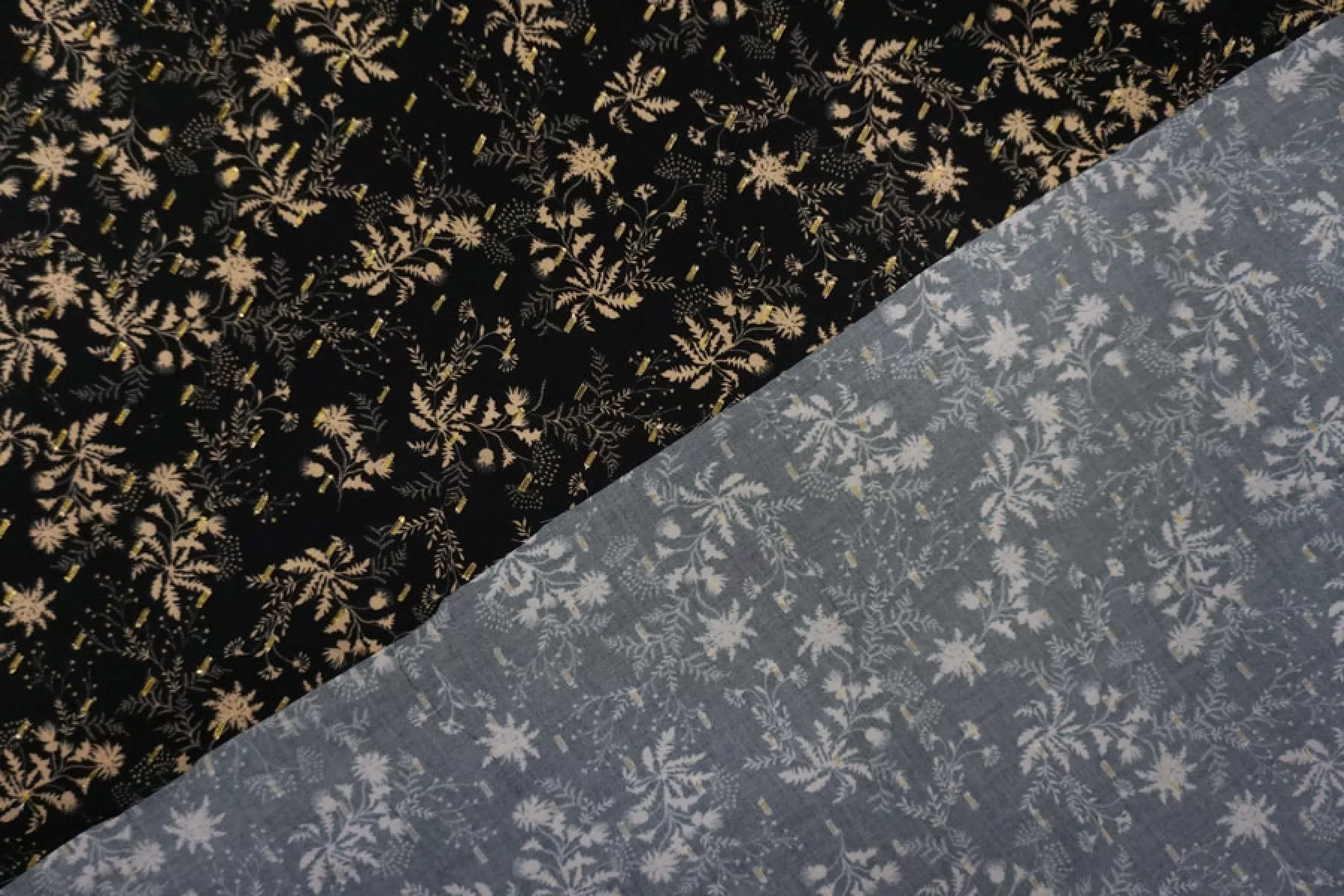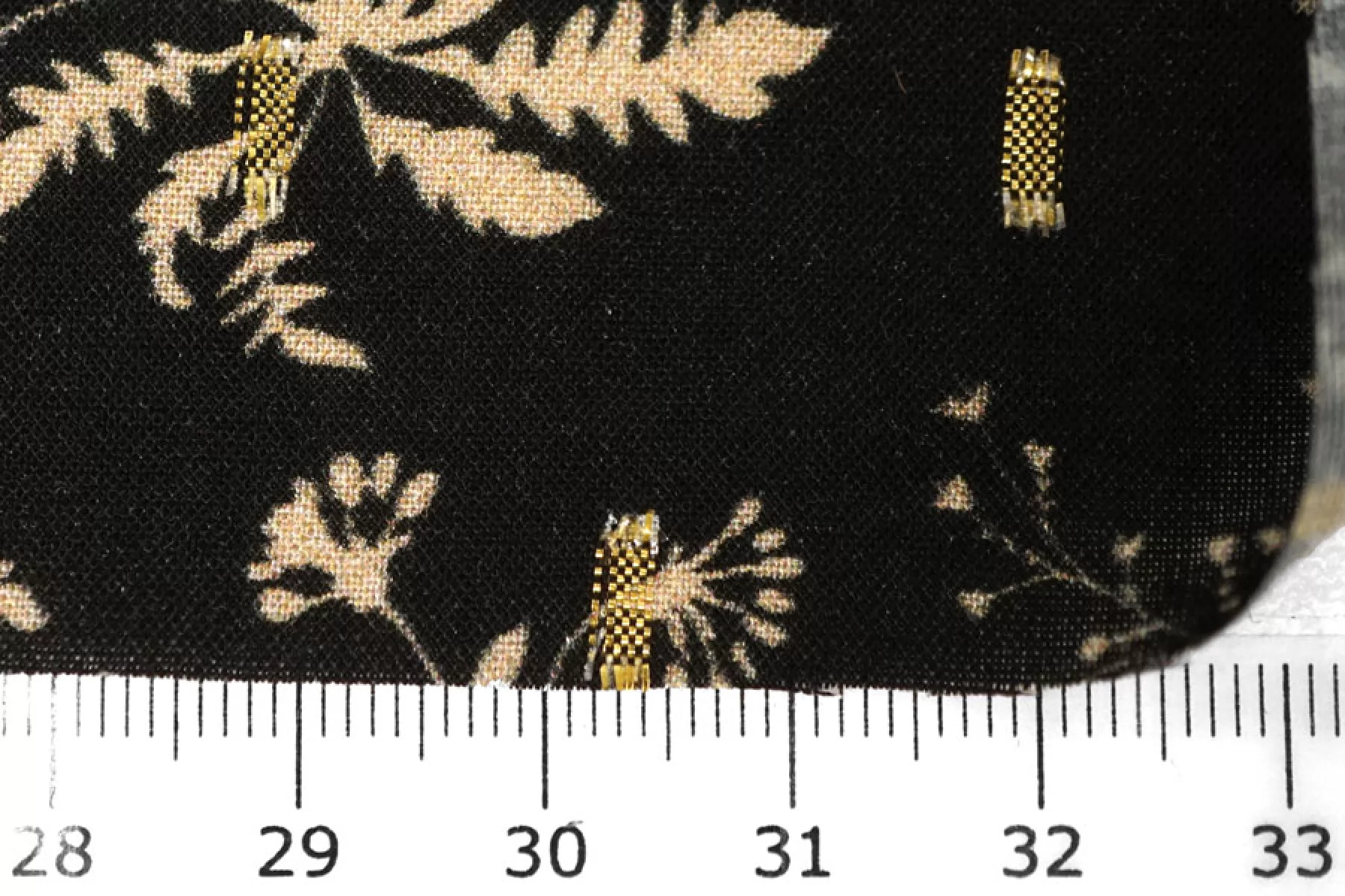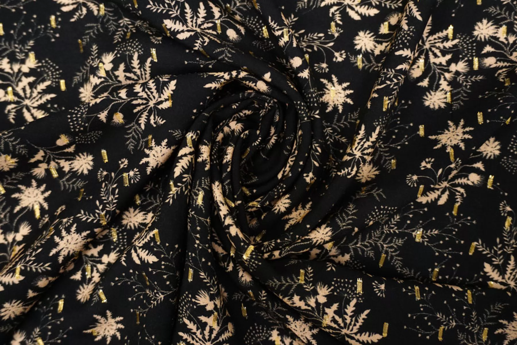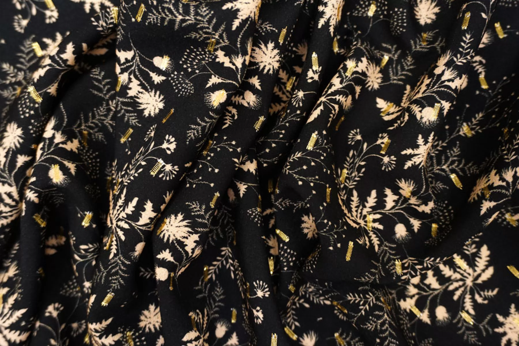 Плательно-блузочный вискозный штапель черного цвета с цветочным принтом бежевого цвета и с филькупе из золотого люрекса. Тактильно материал приятный, мягкий, тонкий. Не тянется, просвечивает силуэт. Хорошо драпируется, форму не дерэит. Плетение плотное. Шьем платья, блузки, юбки и не только. При необходимости используйте подкладочный материал. Обязательно учитывайте усадку 5-10%